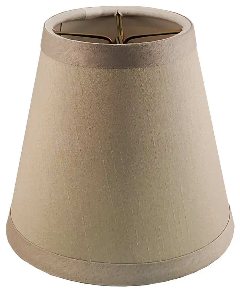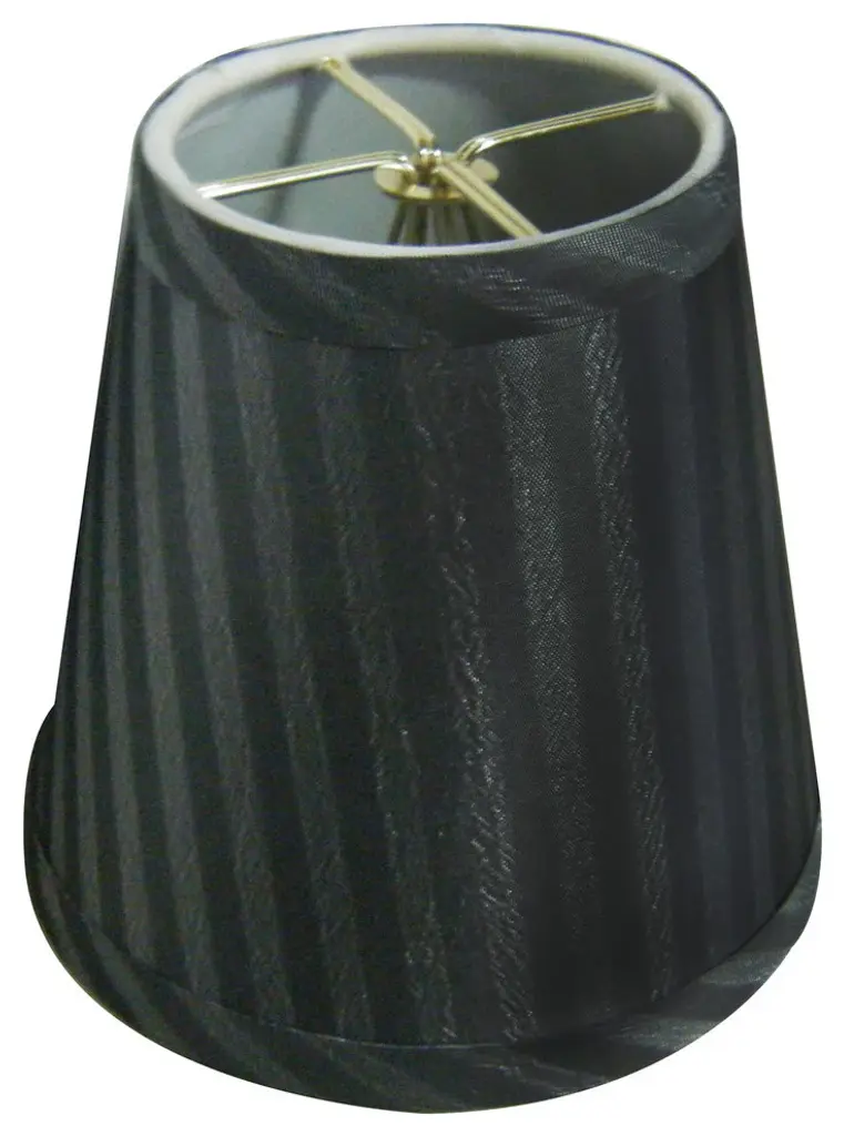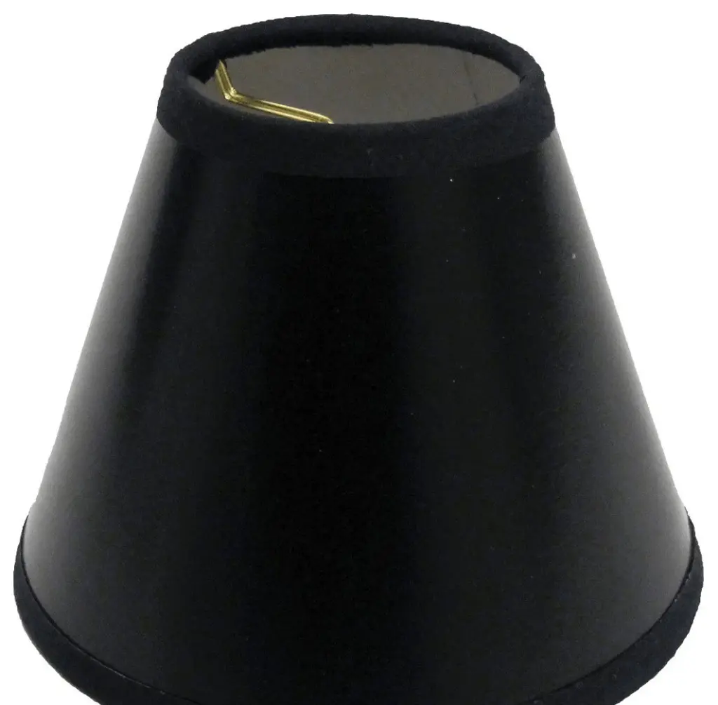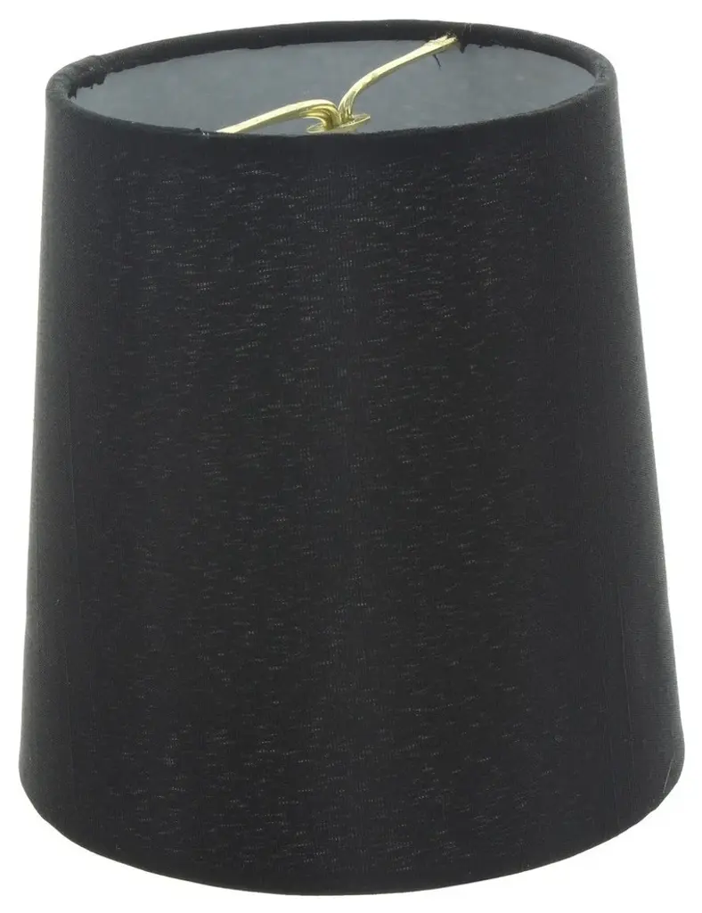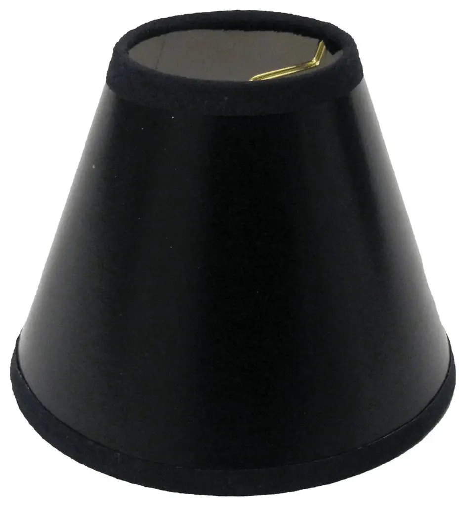This Black with White Lining Set of 6 Chandelier Parchment Lampshades has a hint of mid-century modern flair and will be a great addition to your lamp base. This hardback Lampshades includes a standard flame clip that fits over a standard harp and can be used with your existing finial design. This high quality crafted drum shape has a slight slant to give it some visual interest and is crafted of the finest parchment with a fold on top and bottom of the shade. 4" x 5" x 5"Set of High Quality Parchment and Fabric Lamp Shades.This set of 6 chandelier shades features a sturdy brass finish metal Flame Clip that fits securely to your bulb.No finial is needed.Shade measures 2.5" top diameter x 5" bottom diameter x 4" slant height.Hardback chandelier shade with fabric taped edge on top and bottom and white interior.Made from high-quality Parchment