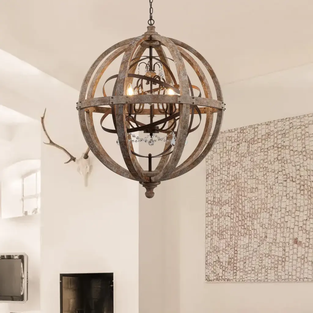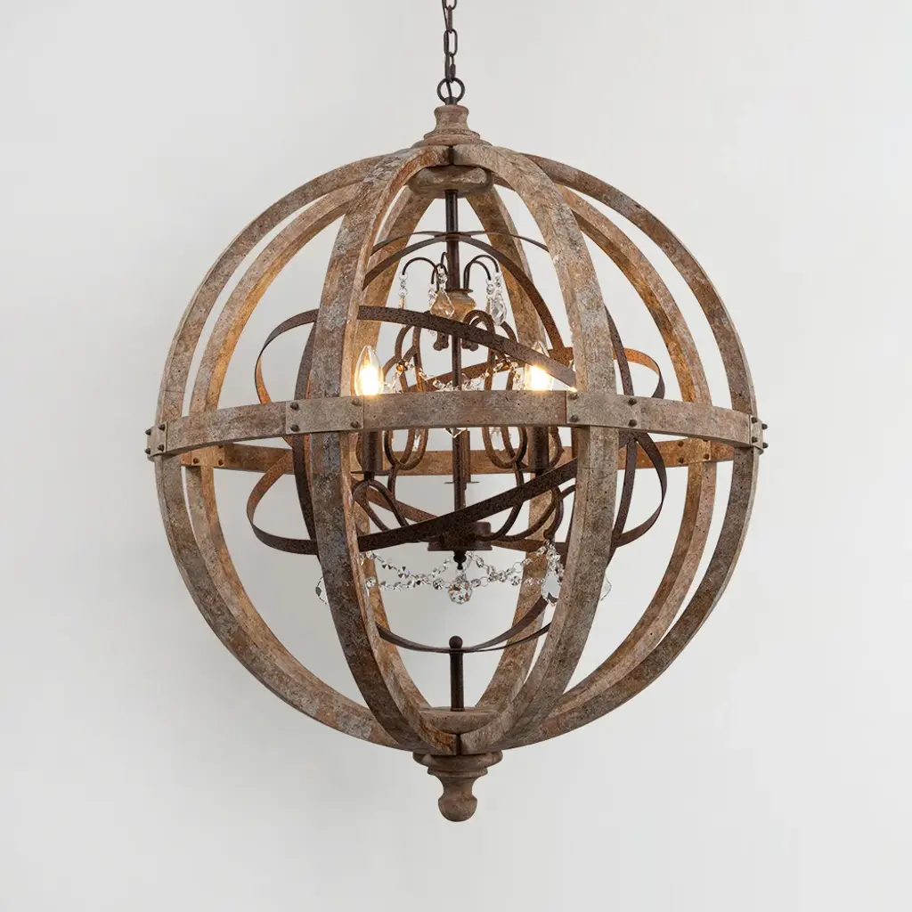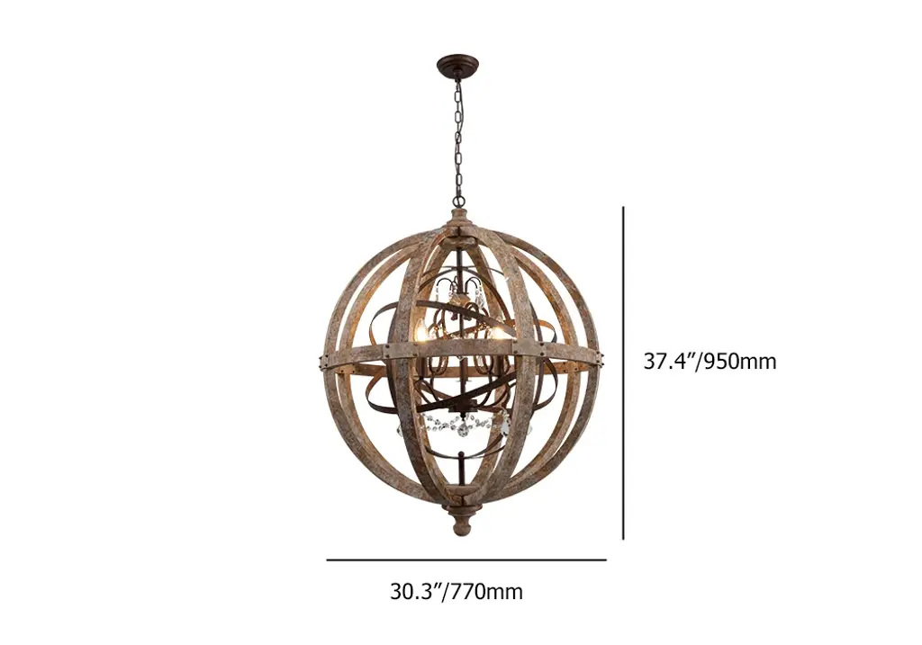 Bold and unique, this 5-light chandelier combines weathered wood, metal in rust, and crystals for a perfect mix of rustic and industrial styles. A pristine wooden globe encasing a metal orb in rust houses a scroll metal frame accented with crystals in a central display. The distressed and rust finish enhances the old aging appearance. When lit, it creates a warm, soothing space and clear crystals add a hint of glam. Used singly or in multiple, it looks fabulous over your kitchen island and dining table or in the living room and bedrooms.