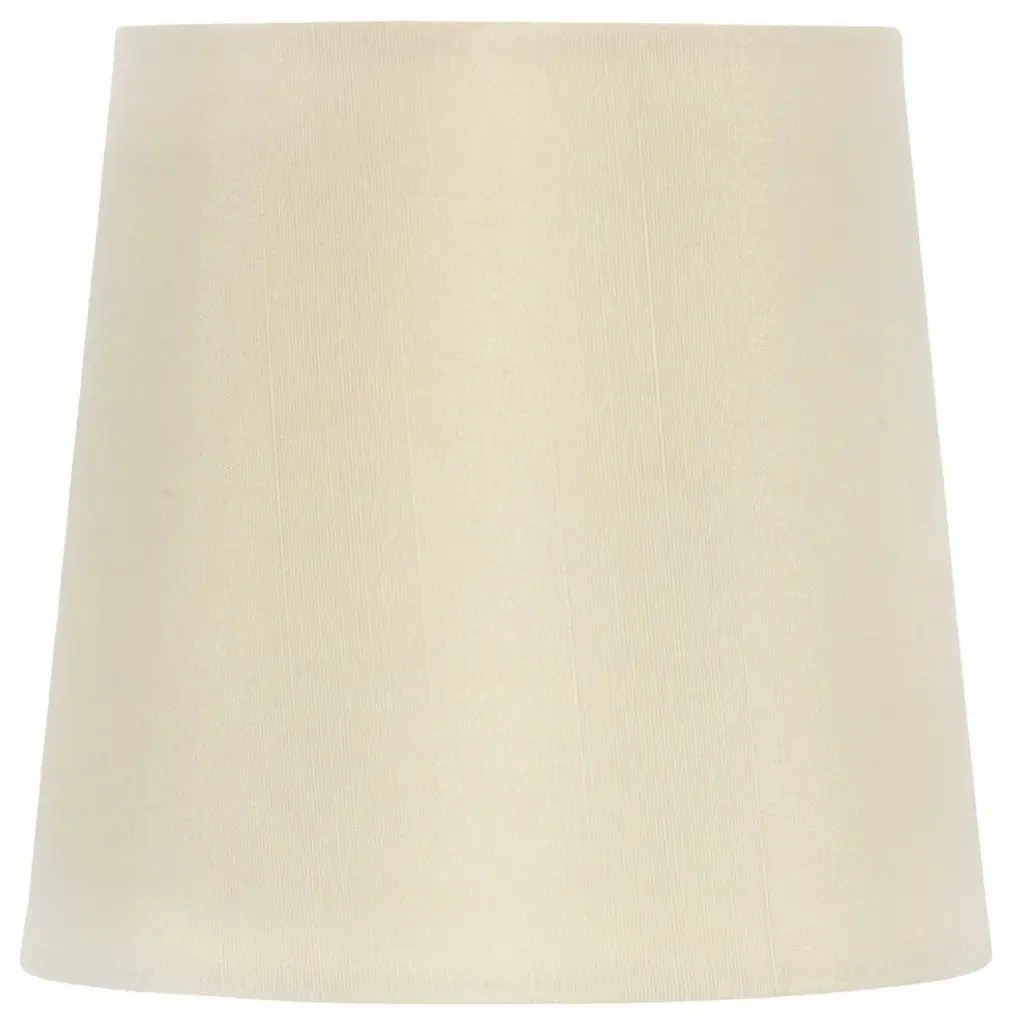UpgradeLights Eggshell Silk 5 Inch Retro Drum Clip On Chandelier Lampshade 5 Inch Clip On Retro Drum Chandelier Shade in Eggshell Shade Dimensions: 4 inch top, 5 inch bottom, 5 inch height Brass Flame Clip (Clips onto bulb). Top Quality Shantung Silk Fabric in White Eggshell color Update the look of your Chandelier in an instant!