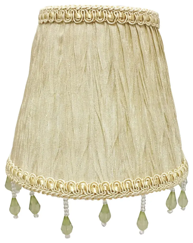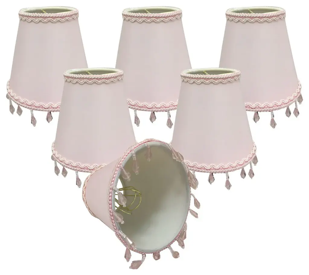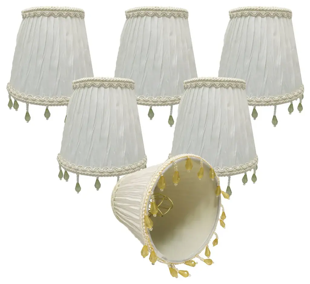 Royal Designs 5-Inch chandelier shades are handmade. You can use them for your chandeliers, wall sconces or small accent lamps. These lamp shades are highest quality and sure to bring a sense of style to any room.-Shade Dimensions: 3"x5"x4.5, Top"xBottom"xHeight, -Shape: Empire-Fabric: Hand Tailored Silk-Type Shantung Fabric, Premium Off-White Softback Lining-Fitter: FLAME CLIP, FC, Fitter designed to fit over a Candelabra bulb base., Most clip-on lampshades are designed with double clip, . Suggested maximum wattage is 60-watt candelabra bulb.-Frame: Quality metal frame