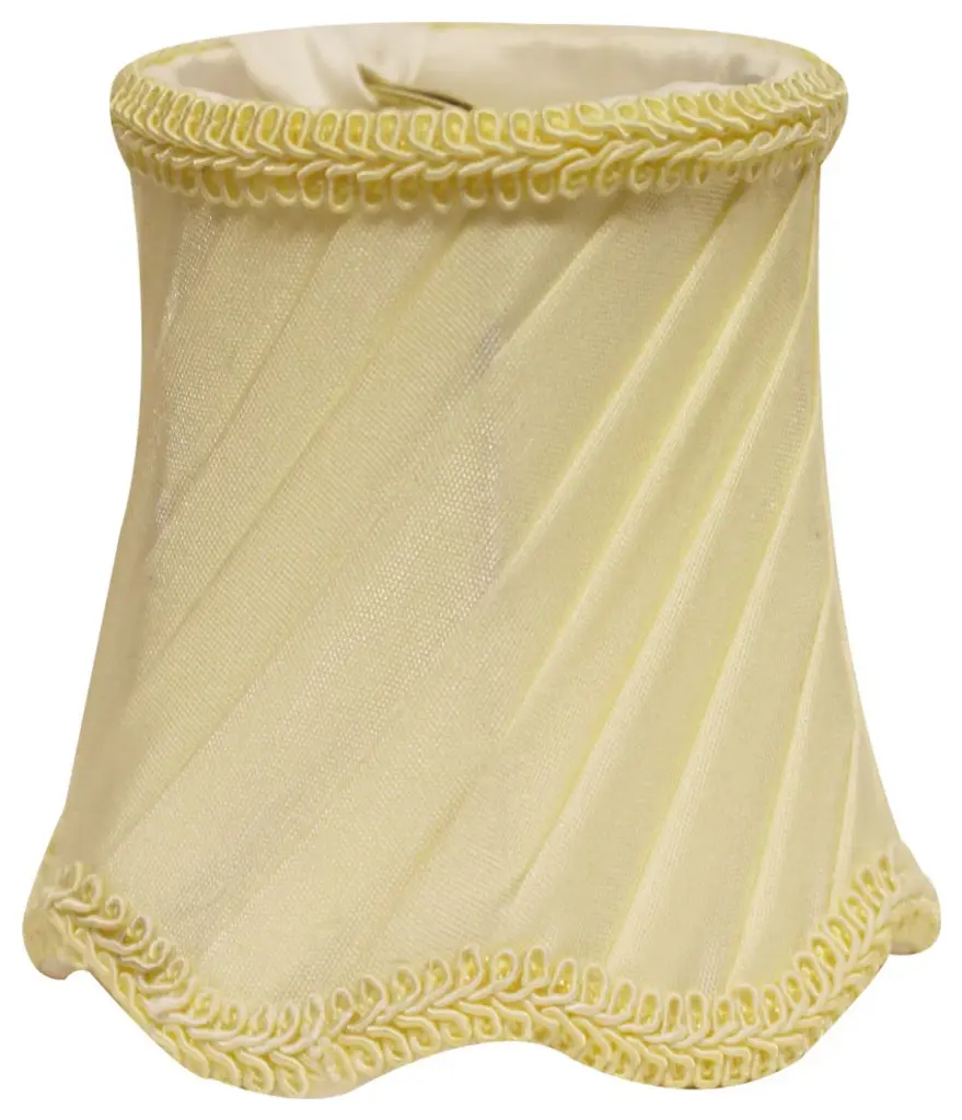 This Slate Gray Set of 6 Slanted Swirl Chandelier Silk Lampshades has a hint of farmhouse flair and will be a great addition to your lamp base. This hardback lampshade includes a standard flame clip that fits over a standard harp and can be used with your existing finial design. This high quality crafted drum shape has a slight slant to give it some visual interest and is crafted of the finest silk with a fold on top and bottom of the shade. 5" x 5" x 5"Set of High Quality Fabric Lamp Shades.This set of 6 chandelier shades features a sturdy brass finish metal Flame Clip that fits securely to your bulb.No finial is needed.Shade measures 3" top diameter x 5" bottom diameter x 4.5" slant heightSoftback chandelier shade with braided trim and white linerMade from high-quality Silk