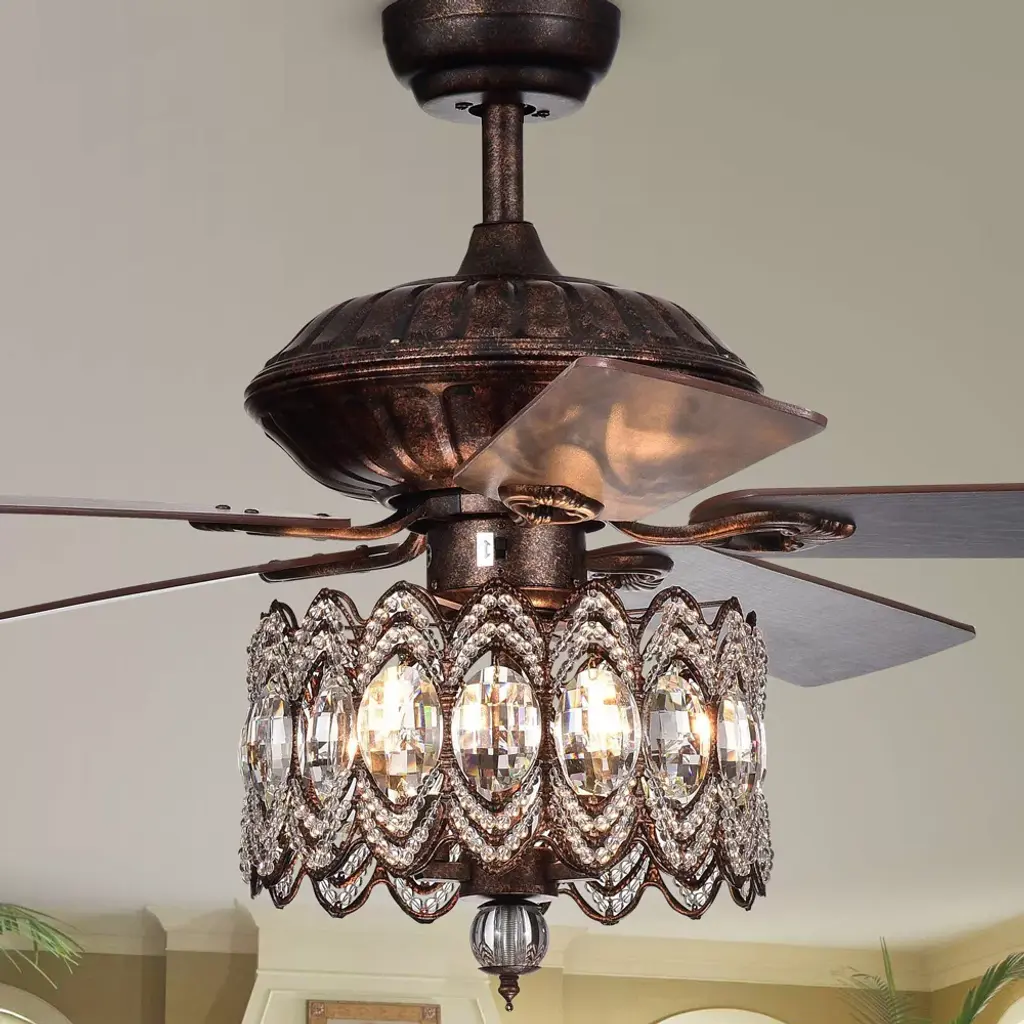 Simultaneously cool your home and add a regal elegance. Its rustic bronze finish, paired with a beautiful crystal- and glass-beaded, shaded light assembly, is a perfect compliment to traditionally styled spaces, while its matching stained wooden blades move enough air to ventilate you.