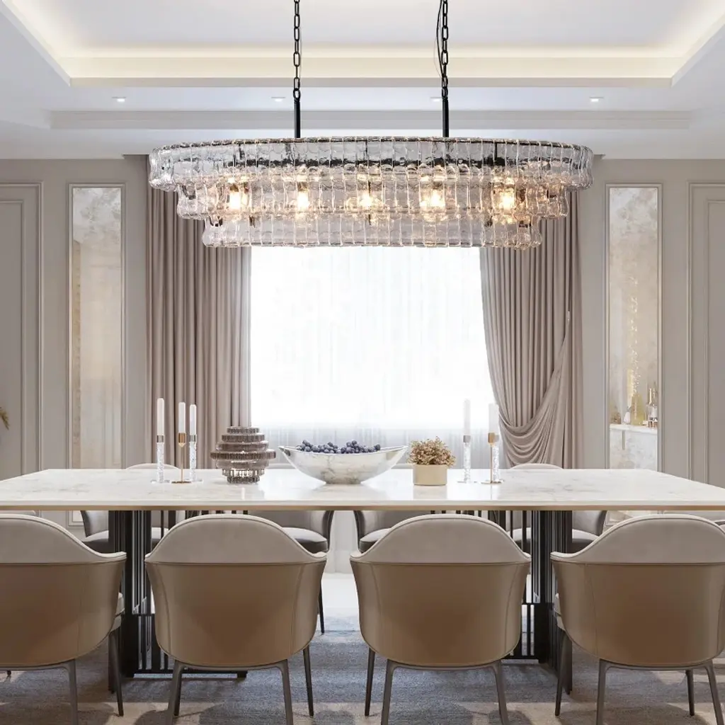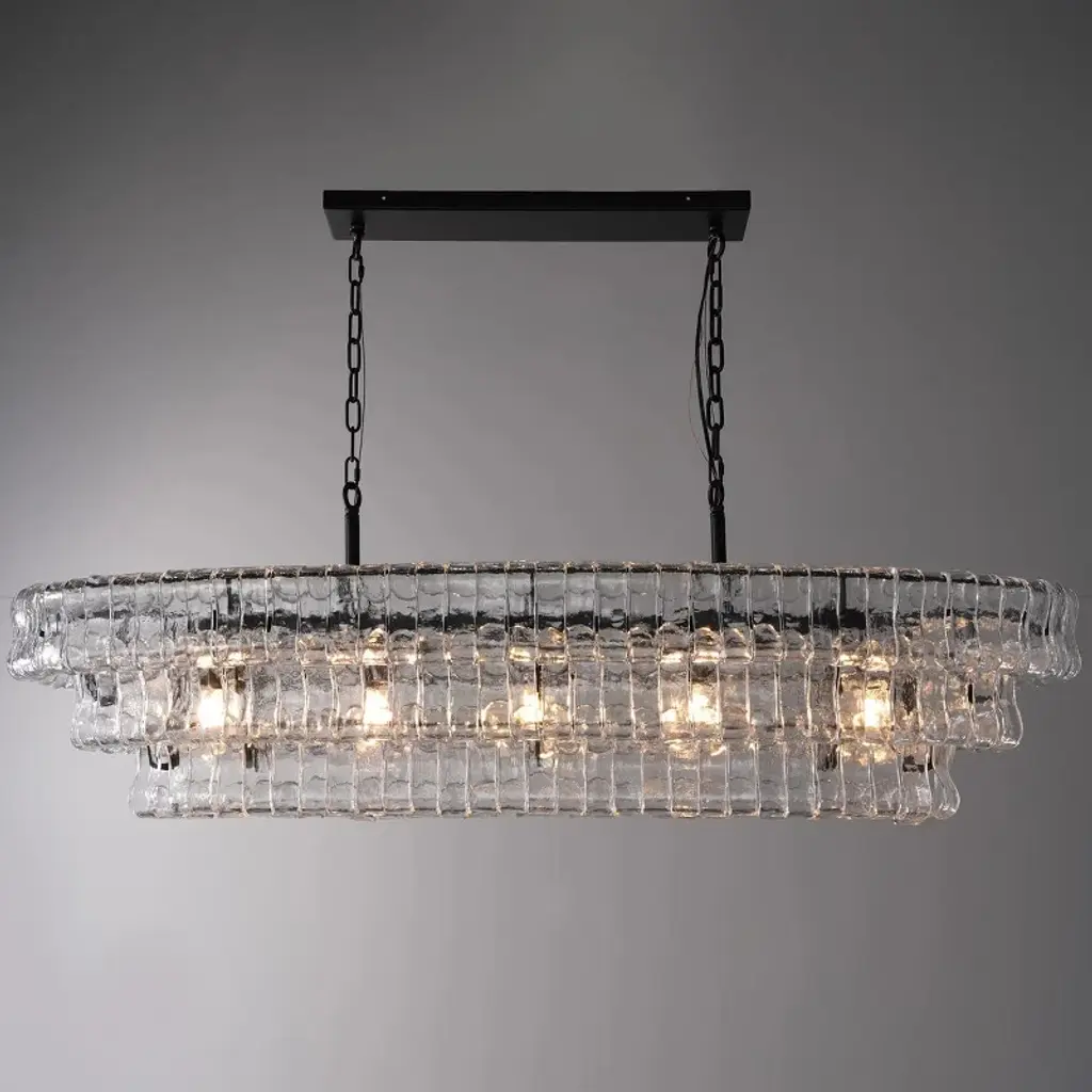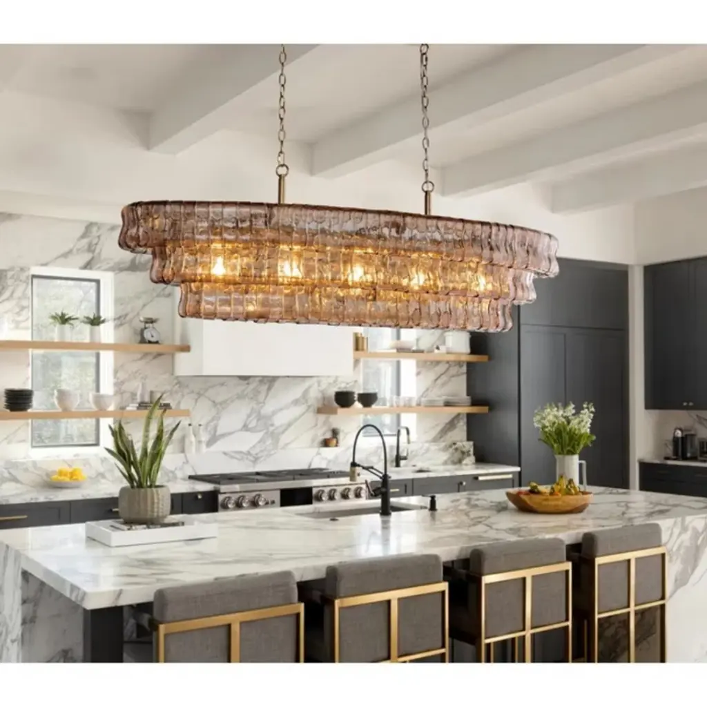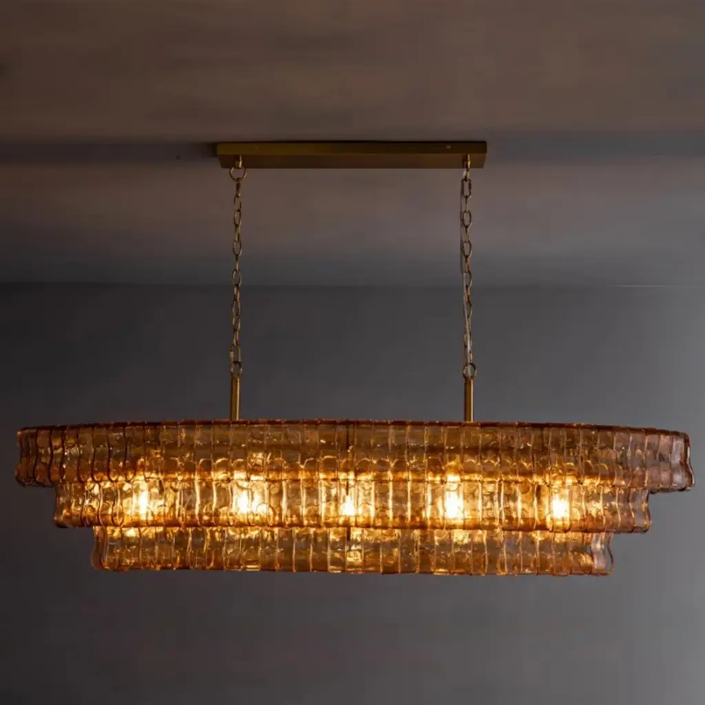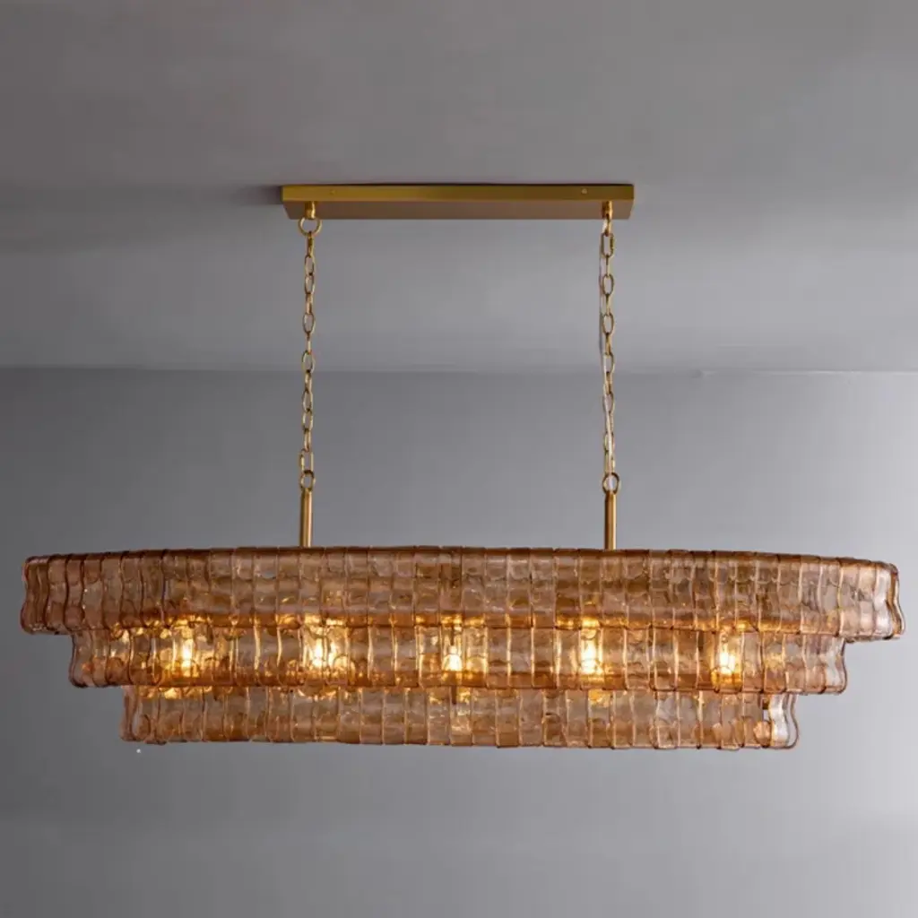 ransform your space with our exquisite country-inspired chandeliers. These stunning smoke-colored glass fixtures add elegance to any room. Perfect for living rooms and dining areas, they enhance your dining experience and create a warm, inviting atmosphere. Crafted with precision, the amber-colored glass rectangle chandeliers reflect light beautifully, making every space special. Whether you need a chandelier for the bedroom, living room, or kitchen island, our collection offers a variety of styles, including French country. Elevate your home with a functional and stylish lighting solution today!