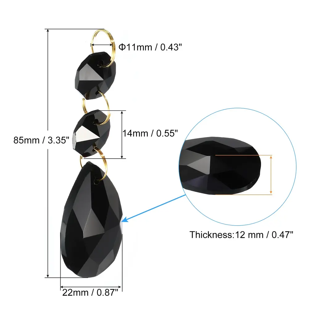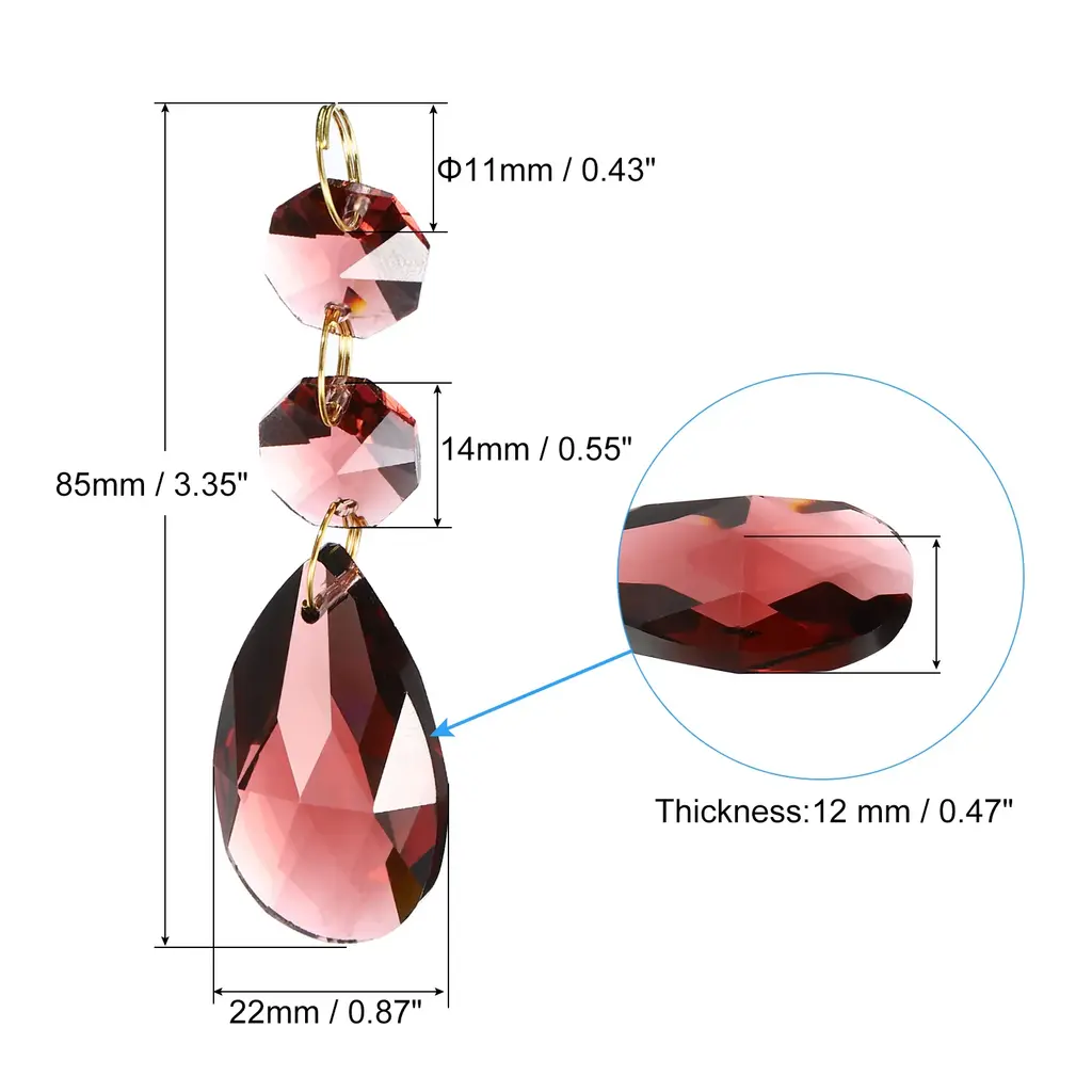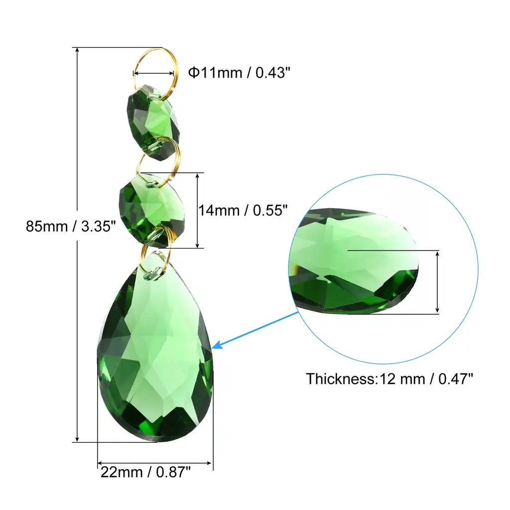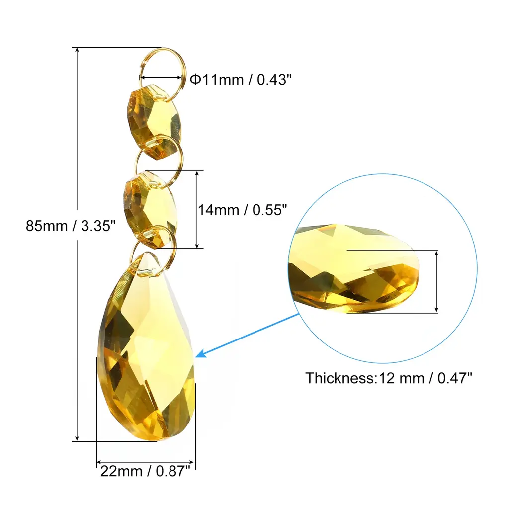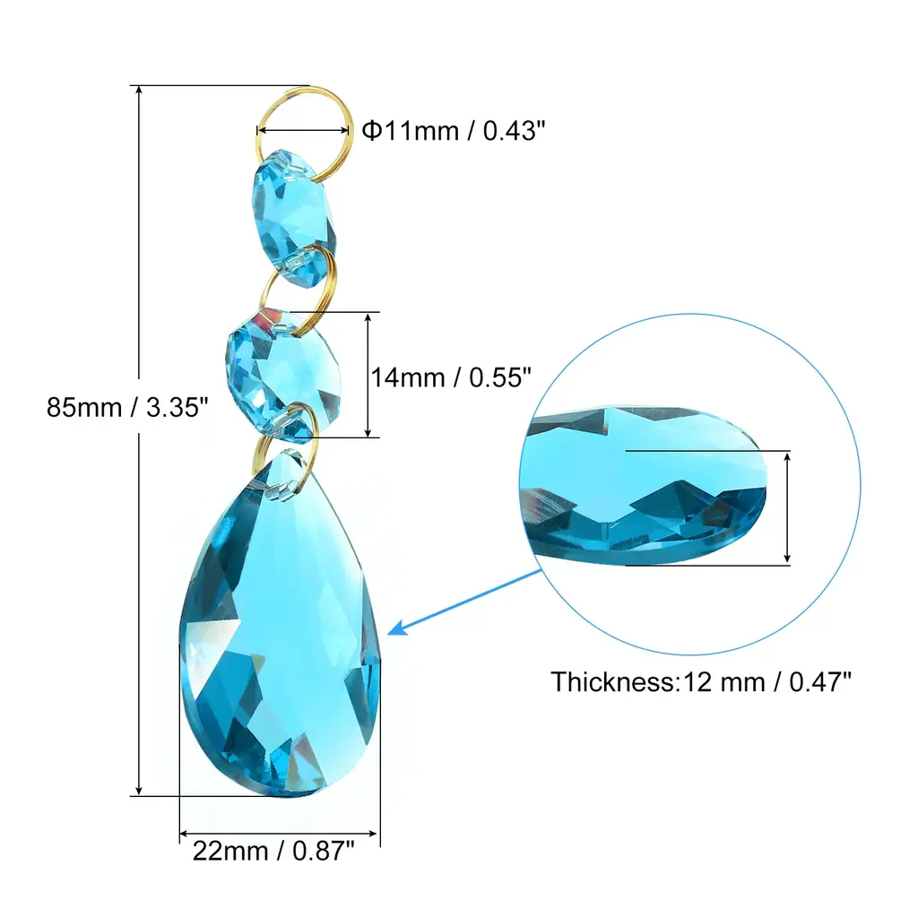 Crystal Teardrop are suitable to hang on chandeliers, sun catchers, crystal bead curtains, crystal lighting and other DIY decoration. They can be used in art projects, walls, window, families, weddings and Christmas tree decorations.SpecificationMaterial: Crystal, MetalOctagonal Bead Diameter: 14mm / 0.55 inchConnecting Ring Diameter: 11mm / 0.43 inchLength of the Whole Accessories: 85mm / 3.35 inchCrystal Teardrop Size: 22 x 12 mm / 0.87 x 0.47 inch (Width*Thickness)Packing List: 5 x Clear Crystal Teardrop with 2 x Octagonal BeadsAdvantageMade of crystal, which can reflect light or sunlight to form colorful colors. It is a sparkling and beautiful ornament with beautiful light reflection around the room.InstructionEasy to use, just hang it where you want to decorate.NOTE: Please select the appropriate size according to your needs.