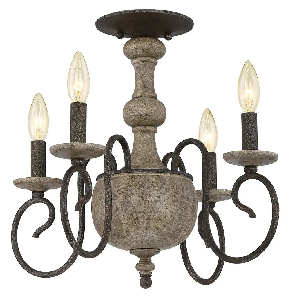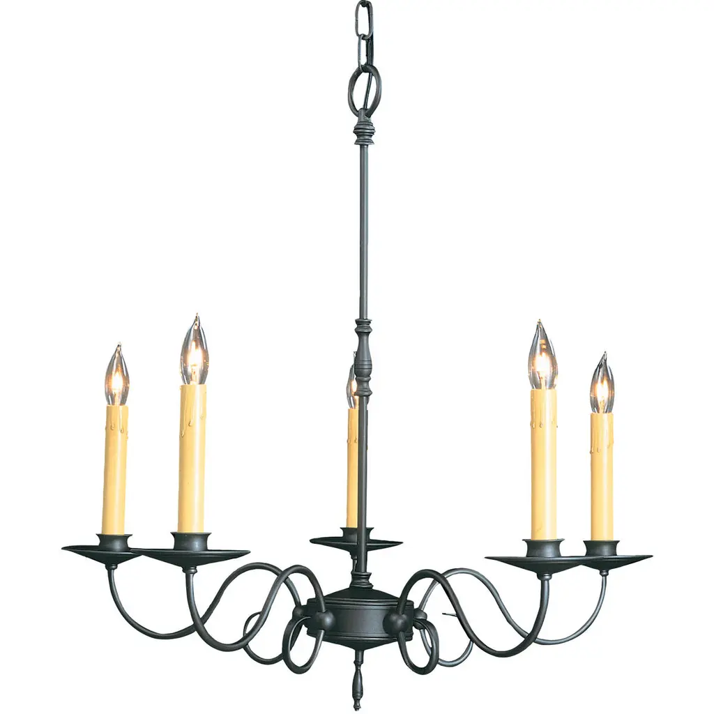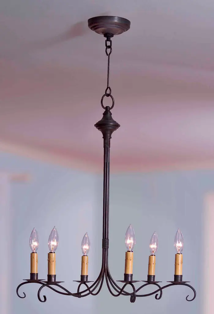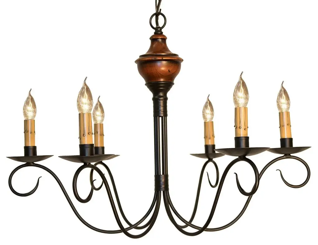 Wood & Metal Primitive Ceiling Light6 ARM CANDELABRAColonial ChandelierThis stunning primitive country chandelier will most certainly become the worthy centerpiece of whichever room you decide to grace with its simple yet stylish elegance!Our Washington Wood chandelier is handcrafted in the USA, using the perfect combination of wood and metal, giving it the look and feel of a wrought iron chandelier from centuries past. It features a total of six (6) elegantly sweeping arms with hand hammered scroll ends in "aged black". Available in assorted milk paint color combinations.This piece exudes the classic, rustic authentic look and workmanship of yesteryear!Comes with a canopy kit, including 3' of chain, a ceiling plate, and additional hardware. Additional chain & wire are available.Maximum Recommended Wattage Is 60 Watts Per Arm SocketUL ListedIncludes 3' Of ChainIncludes 5' Of WireLimited 5 Year WarrantyIndoor Dry Use OnlyBulbs Sold SeparatelyHandmade in the U.S.AMeasures Approx. 15" High x 24" WideMADE in the USAHigh quality colonial reproduction lighting handmade in Lancaster County Pennsylvania. Lathes, chisels, hammers, and bending tools, some more than a century old, are used to cut, carve and shape each piece to primitive perfection. American artisans then paint and distress our products by hand as well, producing some of the most beautiful and convincingly antique finishes available.Meanwhile, our tin products and components undergo a proprietary aging process that gives them the blackened appearance of genuine artifacts. Finally, each product goes through rigorous testing and inspection process to bring you the highest quality reproduction light fixtures possible.Since each light is made and finished by hand, no two are exactly alike. Each piece is unique, brimming with personality and character, providing the customer with an heirloom quality colonial lighting fixture. Built to stand the tests of time while complimenting both old and new design trends.Purchasing one of our Katie's Handcrafted Lighting fixtures will add lasting warmth and beauty to your home, while preserving the American heritage. Our American craftsmen take pride in their workmanship and are grateful for your patronage.