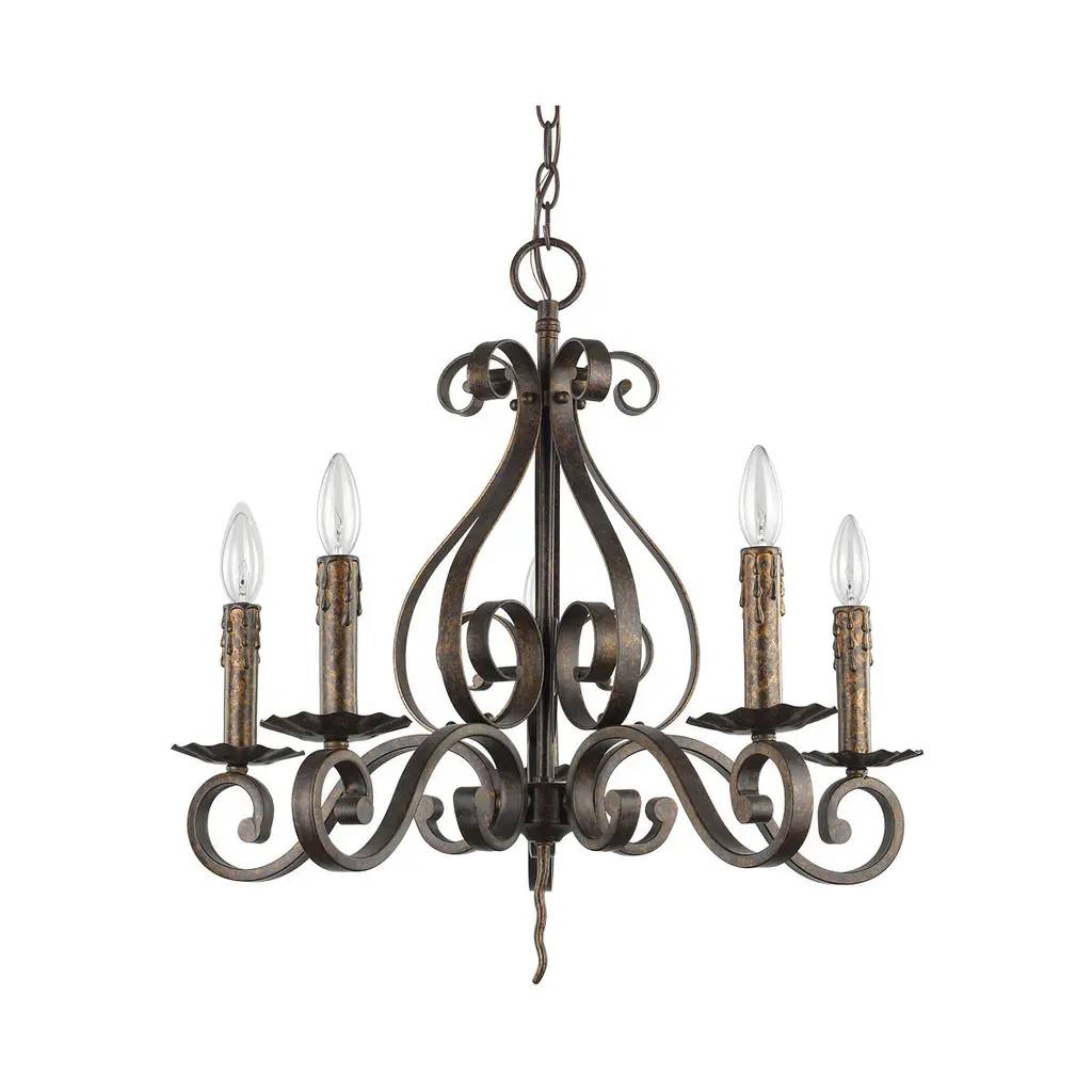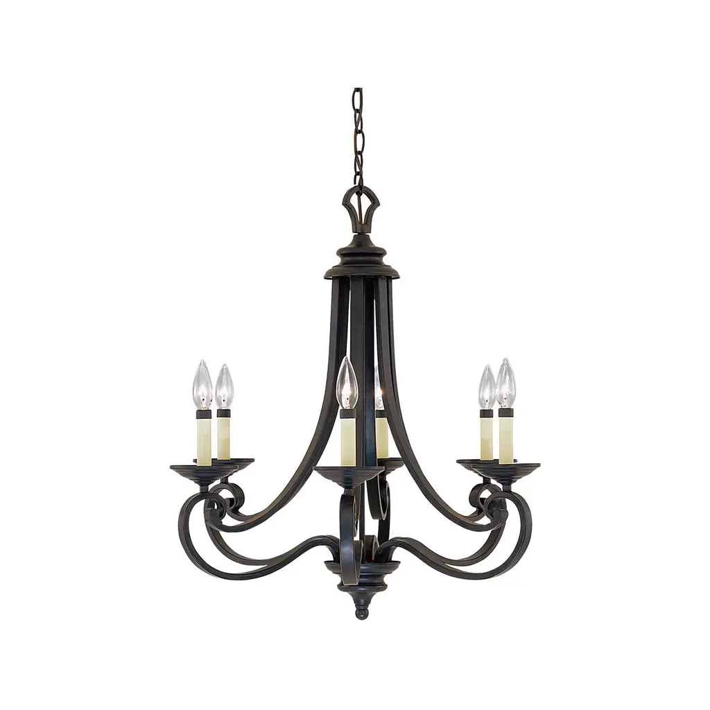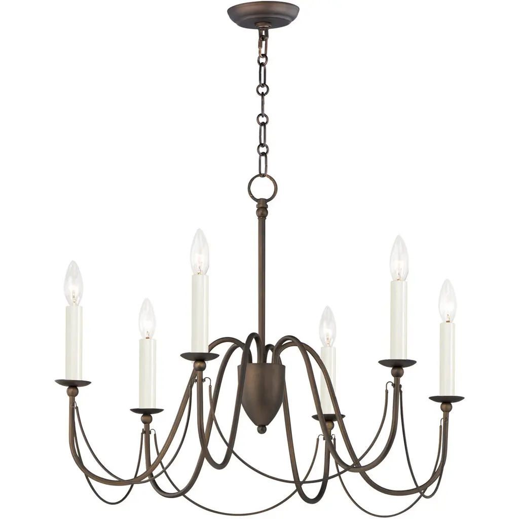 Wood & Metal Primitive Ceiling Light6 ARM CANDELABRAColonial ChandelierThis stunning primitive country chandelier will most certainly become the worthy centerpiece of whichever room you decide to grace with its simple yet stylish elegance!Our Washington Wood chandelier is handcrafted in the USA, using the perfect combination of wood and metal, giving it the look and feel of a wrought iron chandelier from centuries past. It features a total of six (6) elegantly sweeping arms with hand hammered scroll ends in "aged black". Available in assorted milk paint color combinations.This piece exudes the classic, rustic authentic look and workmanship of yesteryear!Comes with a canopy kit, including 3' of chain, a ceiling plate, and additional hardware. Additional chain & wire are available.Maximum Recommended Wattage Is 60 Watts Per Arm SocketUL ListedIncludes 3' Of ChainIncludes 5' Of WireLimited 5 Year WarrantyIndoor Dry Use OnlyBulbs Sold SeparatelyHandmade in the U.S.AMeasures Approx. 15" High x 24" WideMADE in the USAHigh quality colonial reproduction lighting handmade in Lancaster County Pennsylvania. Lathes, chisels, hammers, and bending tools, some more than a century old, are used to cut, carve and shape each piece to primitive perfection. American artisans then paint and distress our products by hand as well, producing some of the most beautiful and convincingly antique finishes available.Meanwhile, our tin products and components undergo a proprietary aging process that gives them the blackened appearance of genuine artifacts. Finally, each product goes through rigorous testing and inspection process to bring you the highest quality reproduction light fixtures possible.Since each light is made and finished by hand, no two are exactly alike. Each piece is unique, brimming with personality and character, providing the customer with an heirloom quality colonial lighting fixture. Built to stand the tests of time while complimenting both old and new design trends.Purchasing one of our Katie's Handcrafted Lighting fixtures will add lasting warmth and beauty to your home, while preserving the American heritage. Our American craftsmen take pride in their workmanship and are grateful for your patronage.
