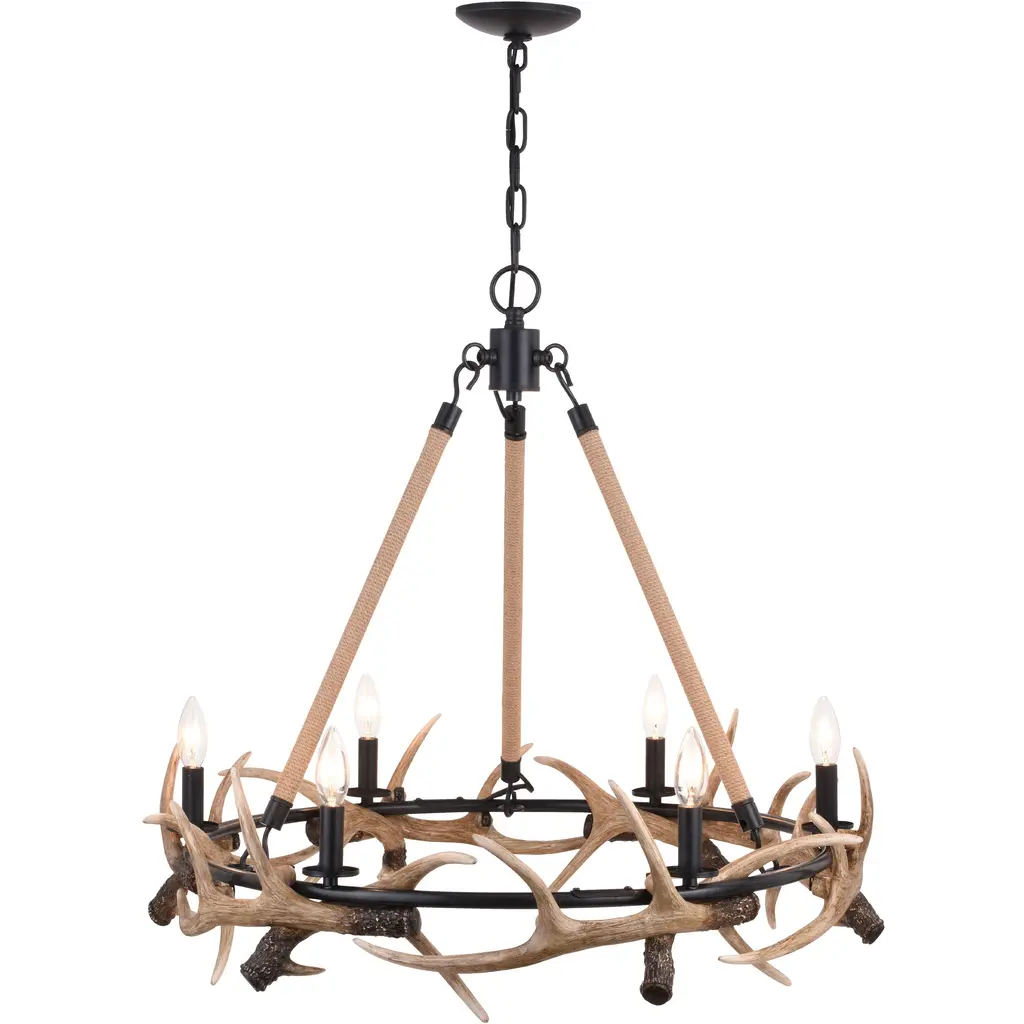 31.5 Inch Resin and Metal Chandelier in Rust finishDurable Steel and Resin Construction6 Foot ChainShips In One Cartonbase diameter: 26shade top 1: 0shade bottom 1: 0shade side: 0wattage: 60bulb base: E12shade color: n/aswitch type: Hardwiredlight: 6Light bulb(s) not included