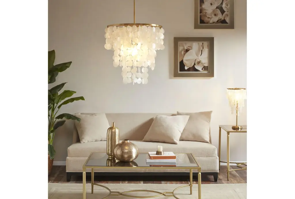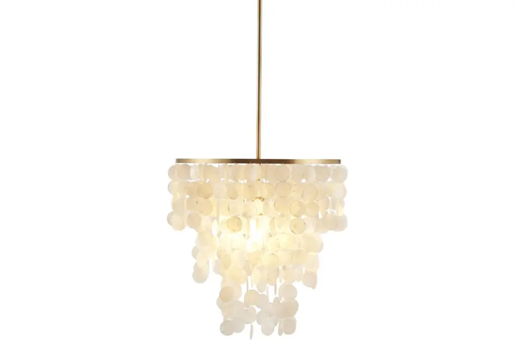 Transform your space with the Isla White Metal Layered Capiz Chandelier. This stunning chandelier features a blend of capiz shells and metal, creating a shimmering effect that adds a touch of sophistication to any room. With its neutral white color and modern design, it's perfect for contemporary and coastal interiors.