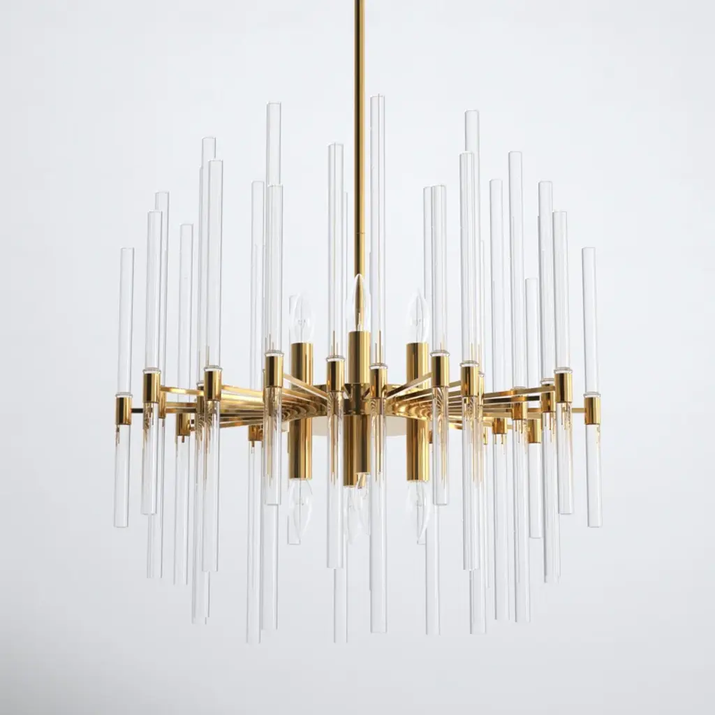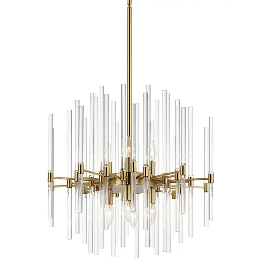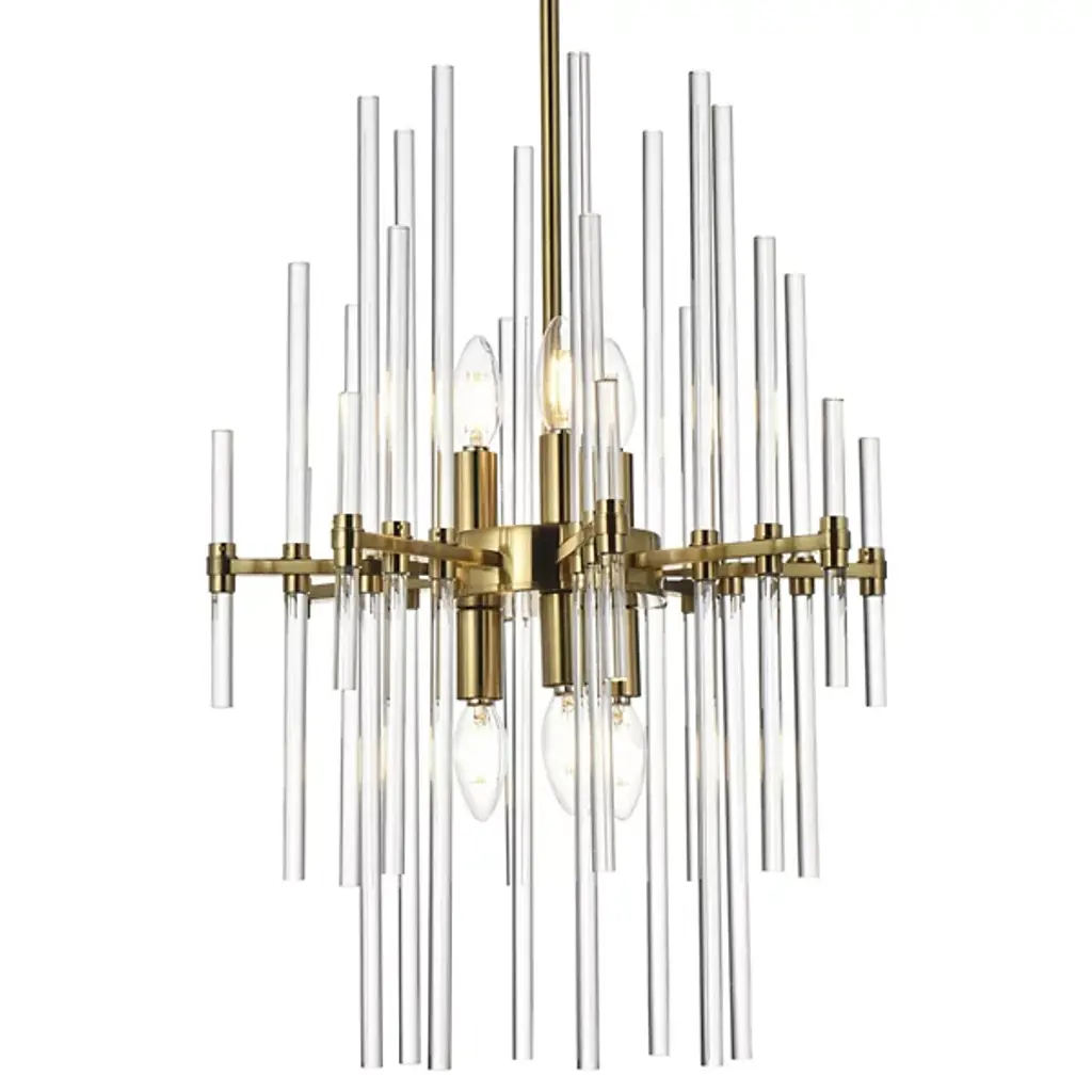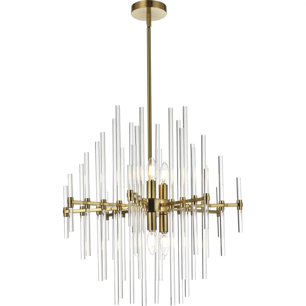 Streamlined forms create an unexpectedly lavish effect in this modern chandelier. Its eight lights are refracted through a nimbus of clear glass rods held at varying heights + lengths by slim steel arms in a polished finish. The smaller size makes a statement without overwhelming your space.
