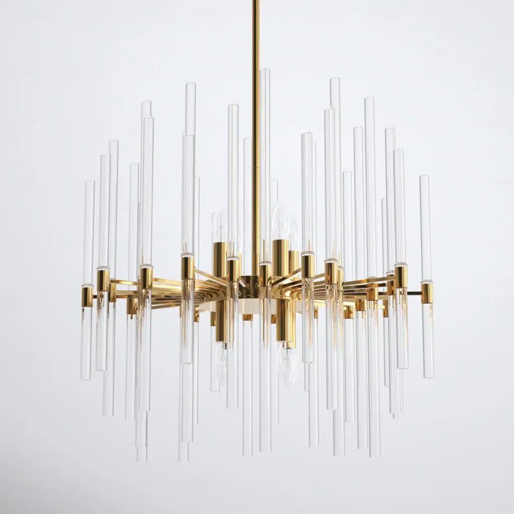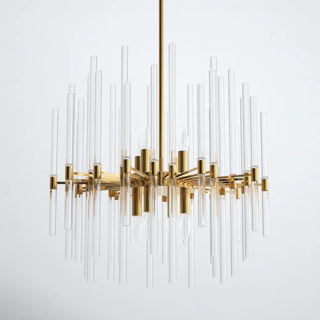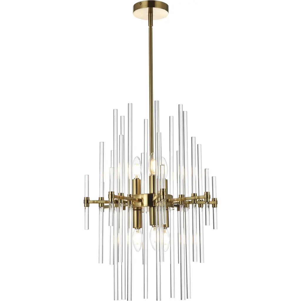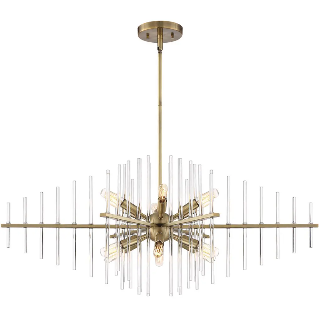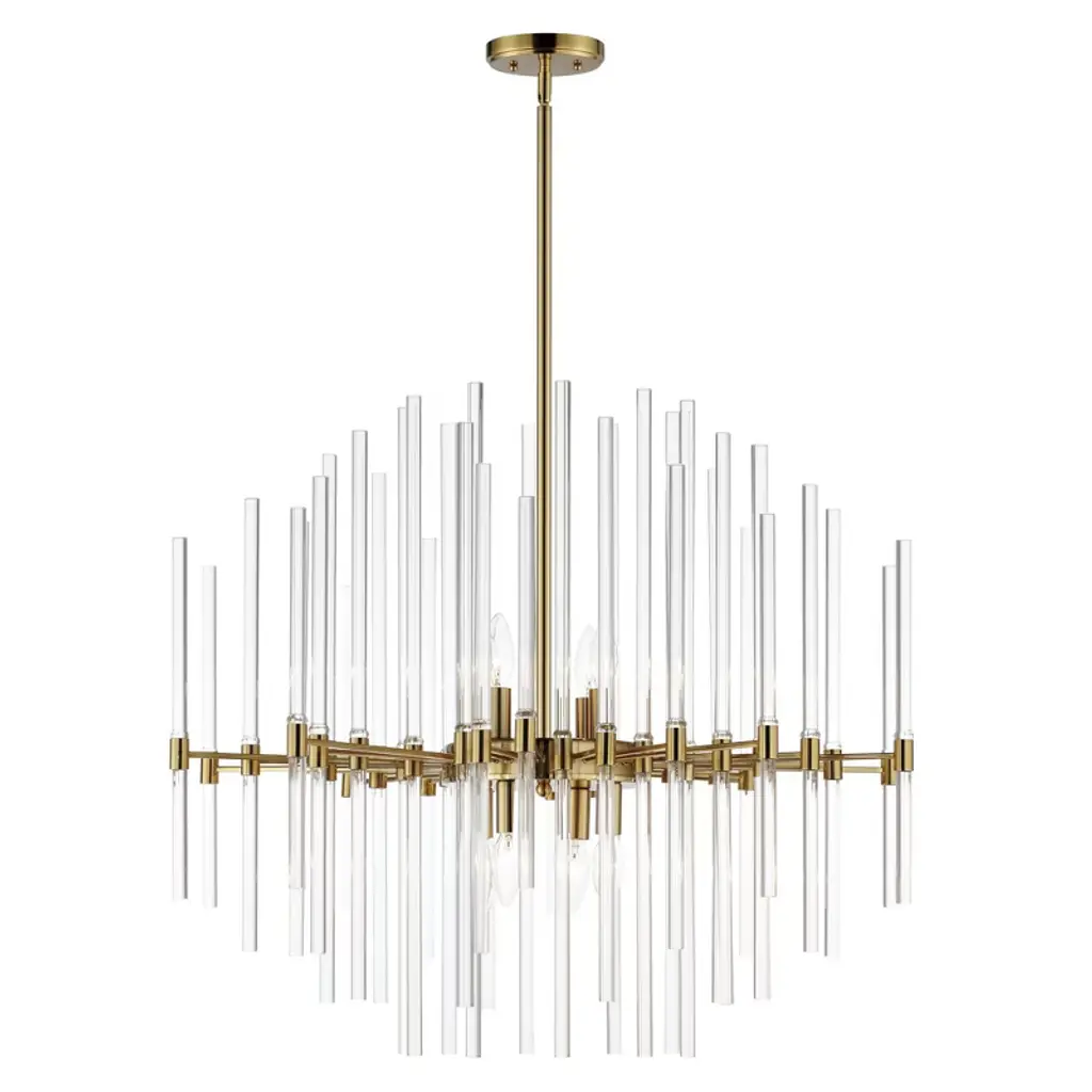 Streamlined forms create an unexpectedly lavish effect in this modern chandelier. Its eight lights are refracted through a nimbus of clear glass rods held at varying heights + lengths by slim steel arms in a polished finish. The smaller size makes a statement without overwhelming your space.