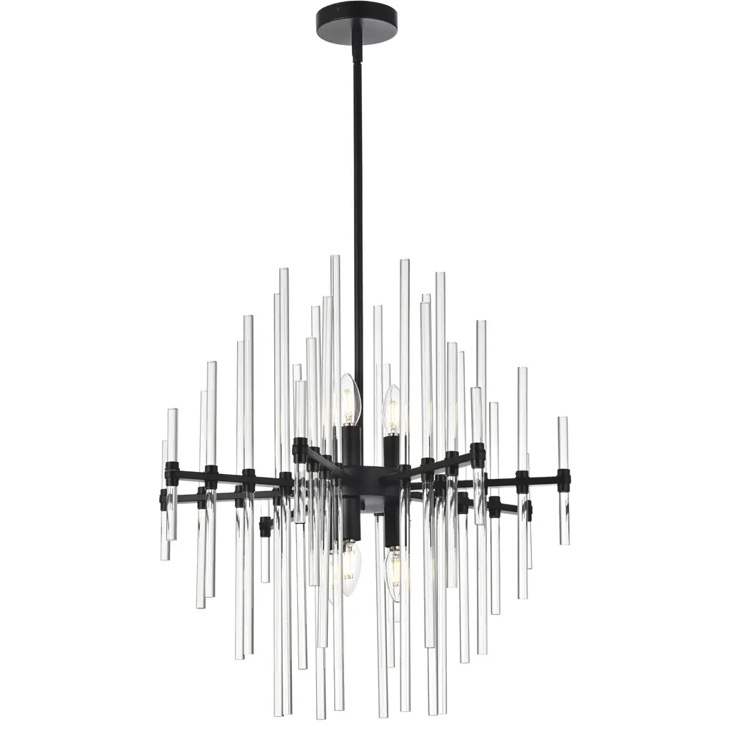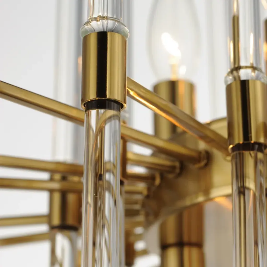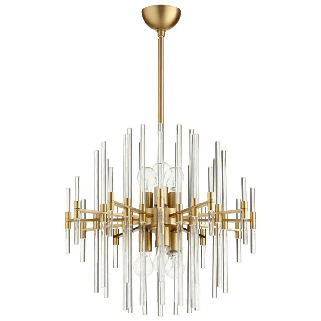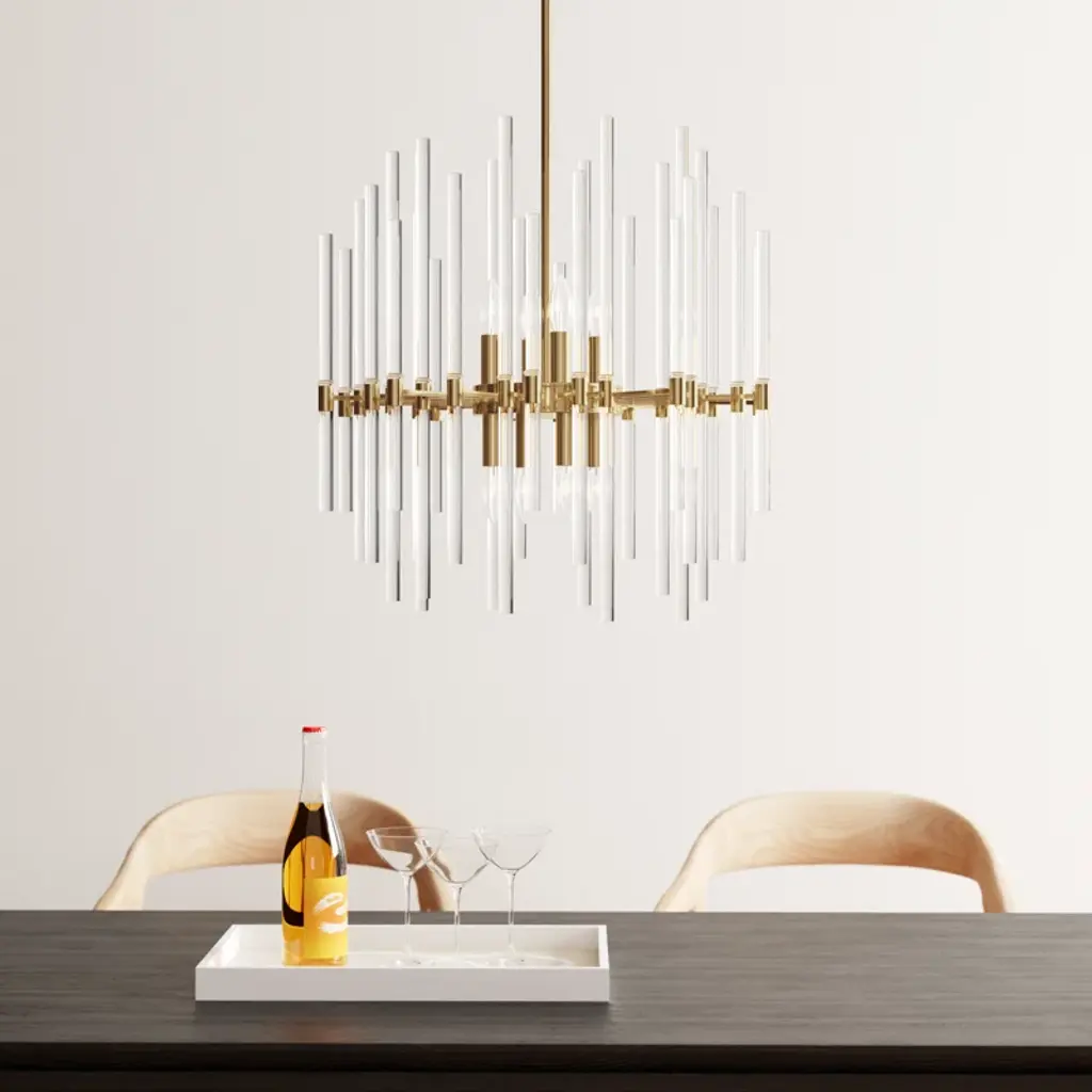 Streamlined forms create an unexpectedly lavish effect in this modern chandelier. Its eight lights are refracted through a nimbus of clear glass rods held at varying heights + lengths by slim steel arms in a polished finish. The smaller size makes a statement without overwhelming your space.