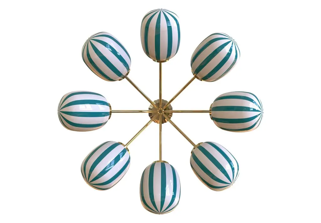 8 Module Blue And White Bullseye Candy Chandelier With Blown Glass And Brass