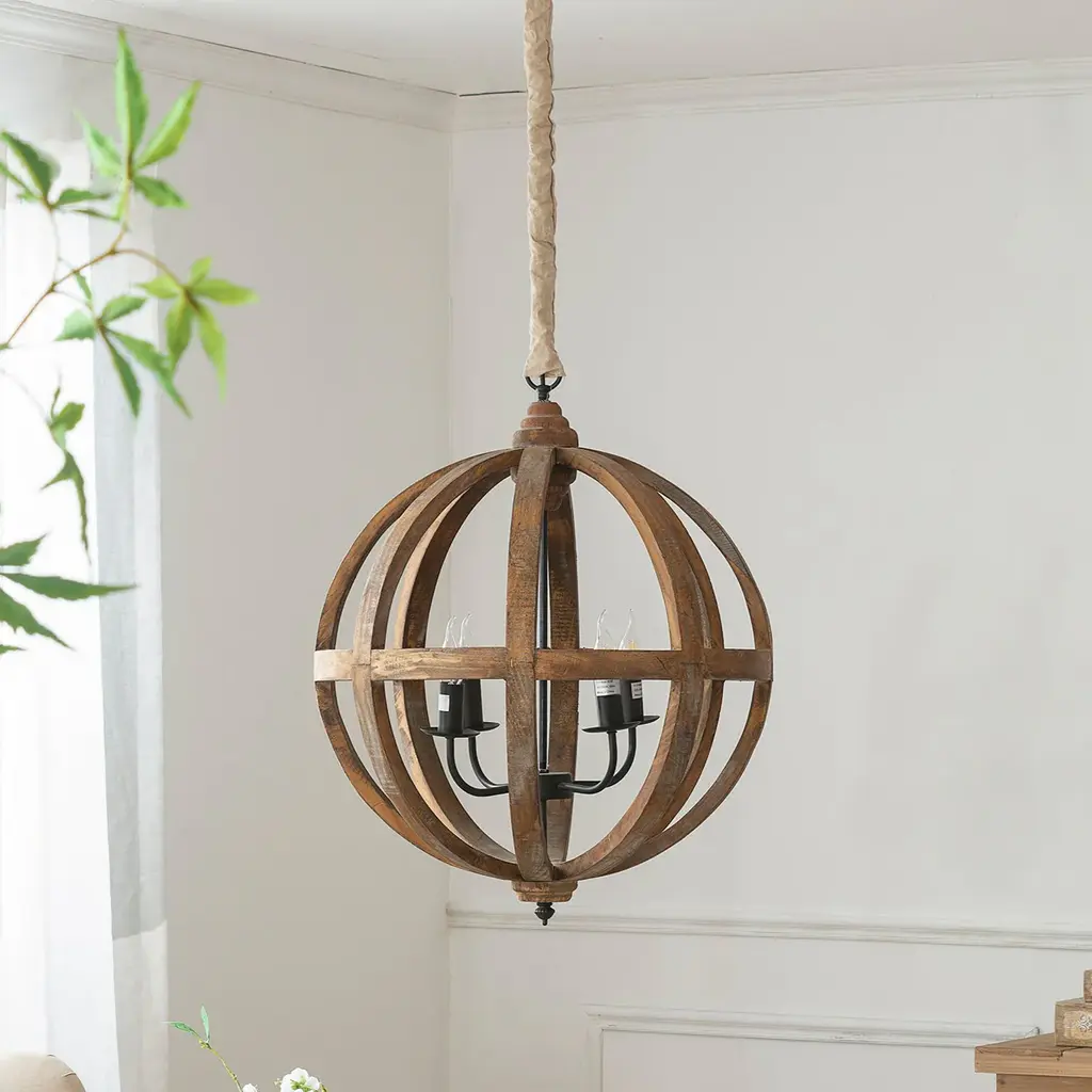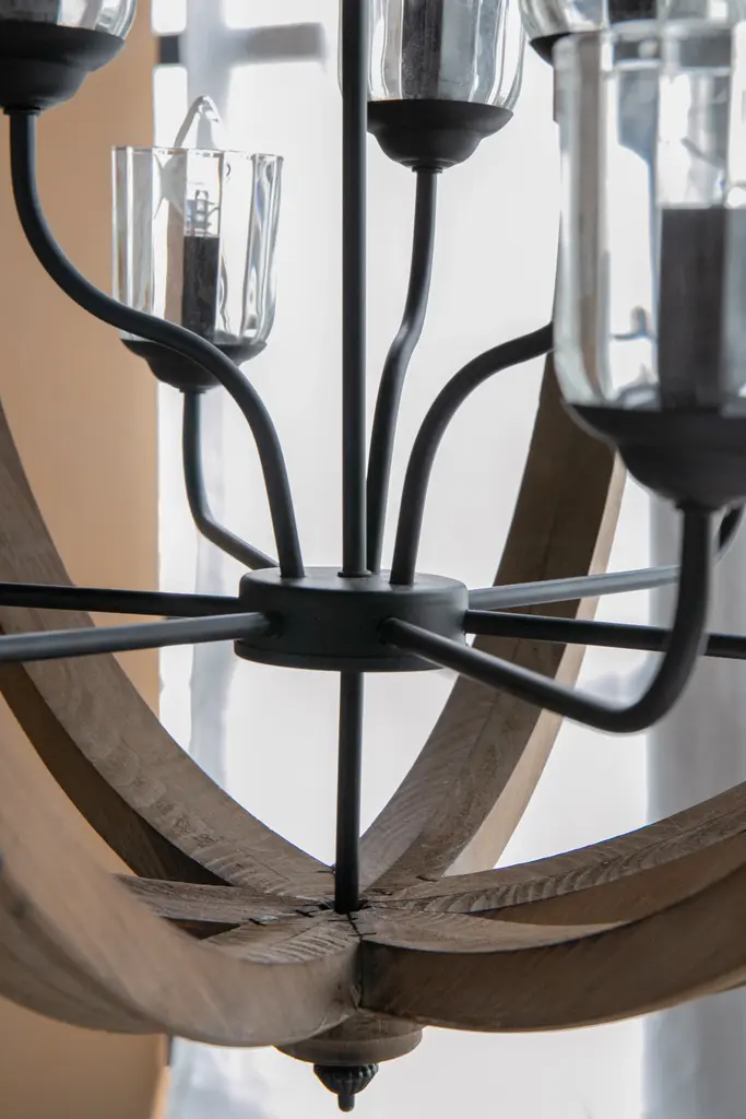 Features an open frame design. Fits industrial style home. Number of Light Sources: 9. Voltage: 110V. Wattage: 60W. Power Source: Hardwire. Bulb Base: 12. Product Details 80% Fir Wood,10% Iron,10% Glass. Measurement:31.5x31.5x34(Inches). Weight:21.2lbs.