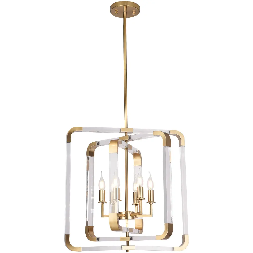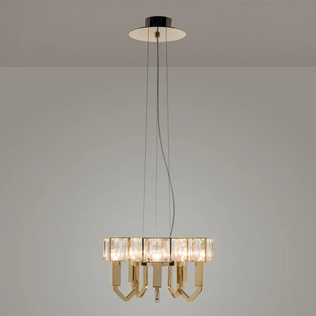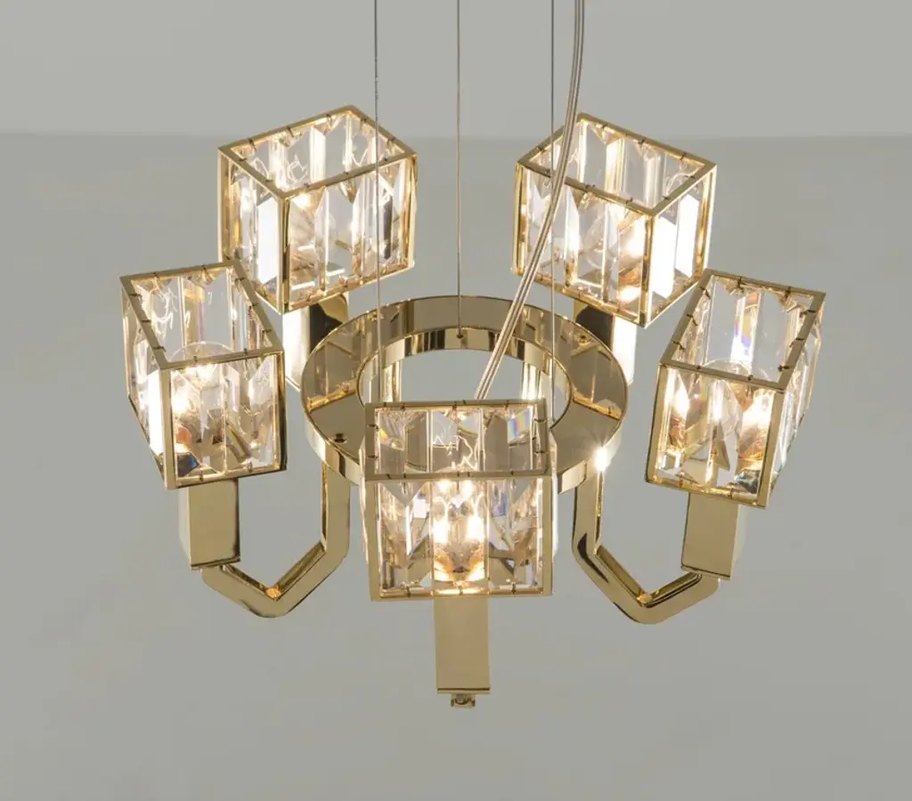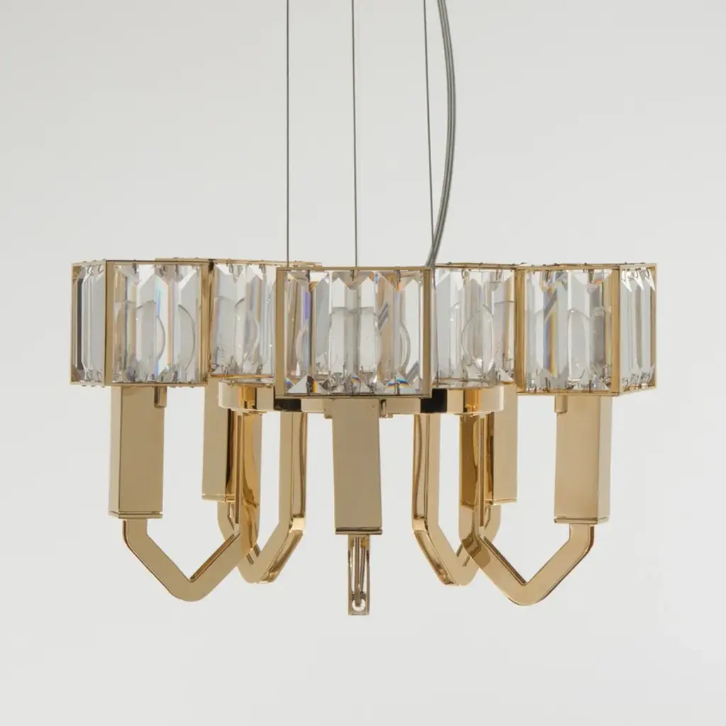 A07G1 is a 5 lights chandeliers, gold plated finish, clear cutted crystals lampshades.5x40W E14not suppliedA merry-go-round of geometries. Angie was born from a reinterpretation of the Holly collection, in 2011, but, aesthetically speaking, it chose to recount itself in a lighter, more modern and linear way. A language that combines classic opulence and contemporary design through the encounter of different elements and technologies. The lampshades, for example, are rethought as little metallic cubes, obtained through a laser cut and enriched by cristal lozenges, rigorously hand-assembled over rubber anti-vibrations supports. Geometric in their formal pureness, they are attached to the metallic structure through brackets available in three galvanic finishes: gold plated, chrome or gunmetal. A collection that draws inspiration from standard geometrical shapes – mostly oval or circular – but one that today finds its expression also in vertically developed installations, besides the longitudinal ones. It is available in different variations: suspended, tabletop, standing or wall lamp: whatever your choice is, Angie will always know what to say.