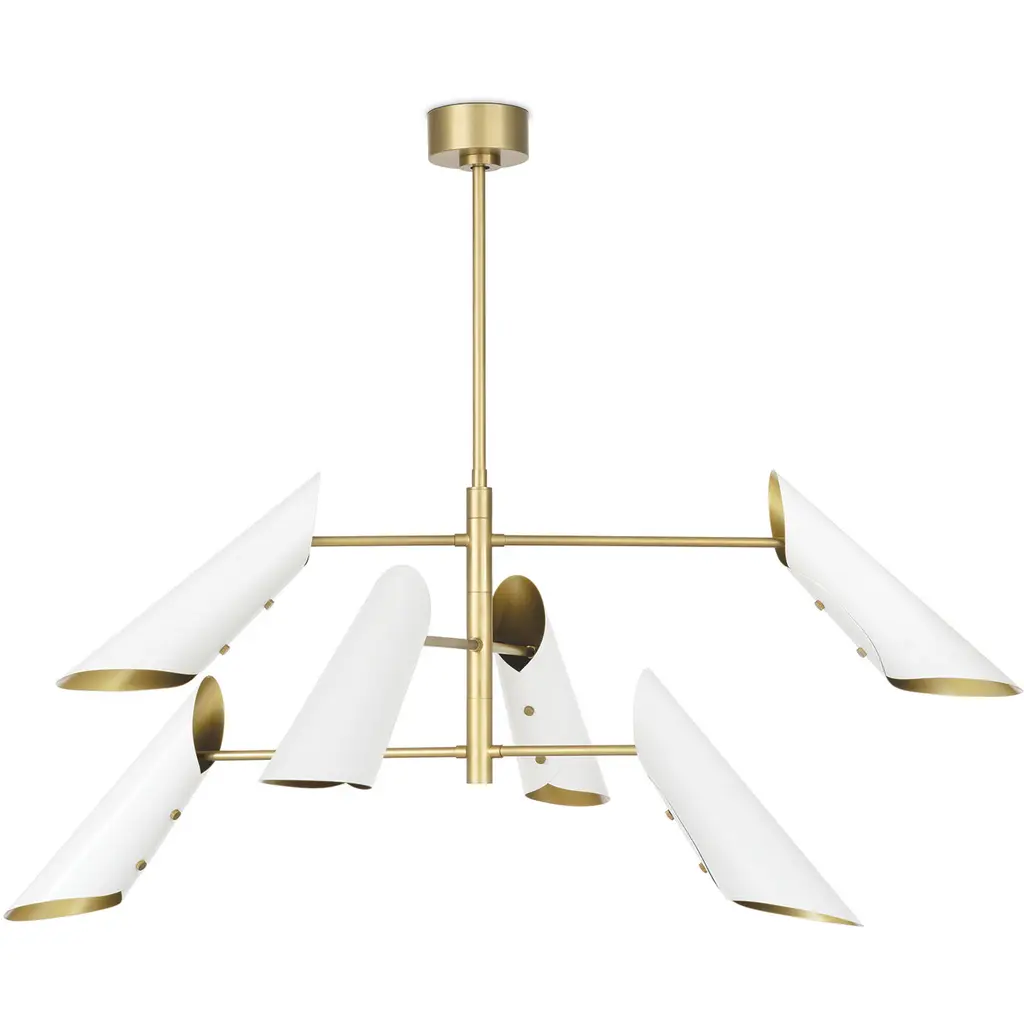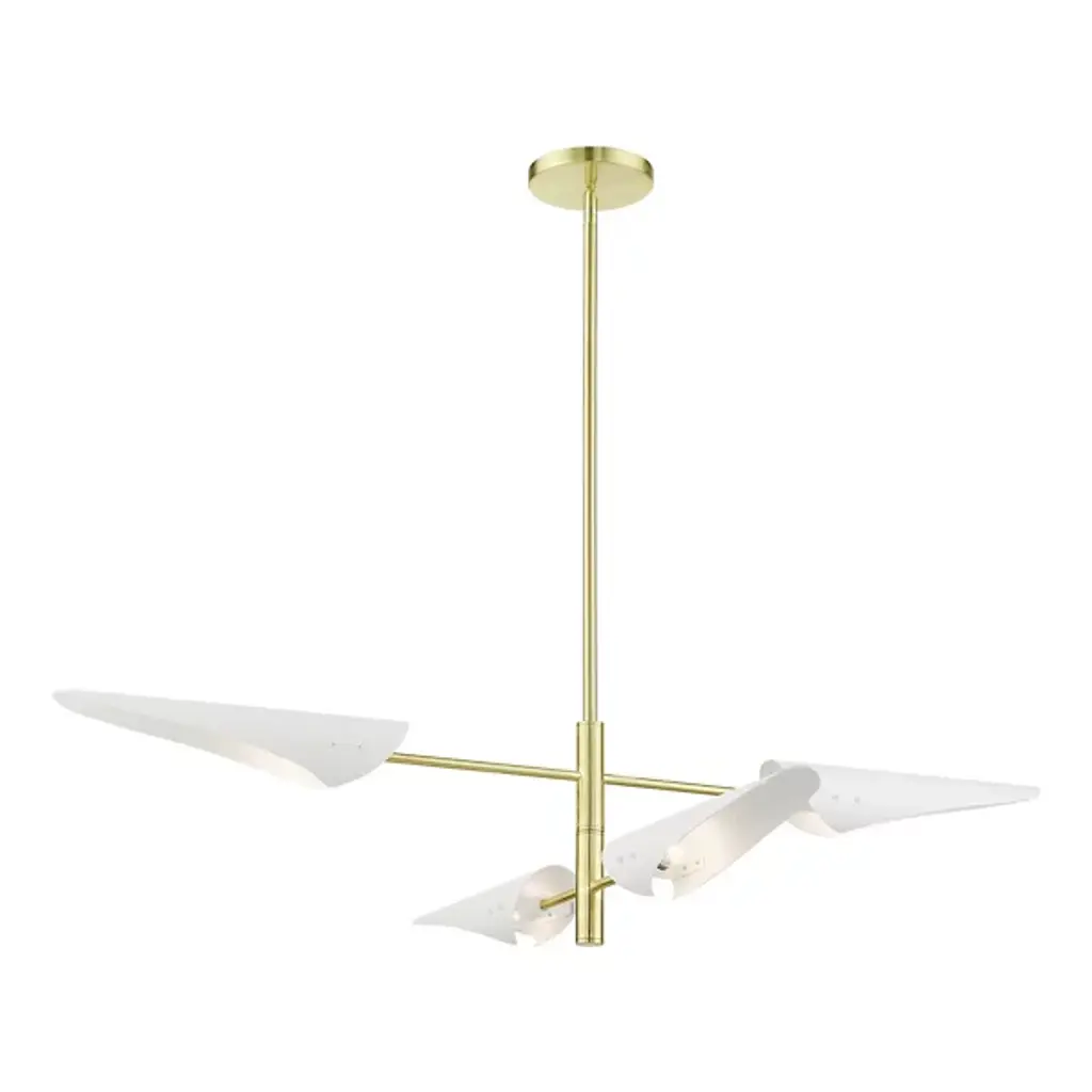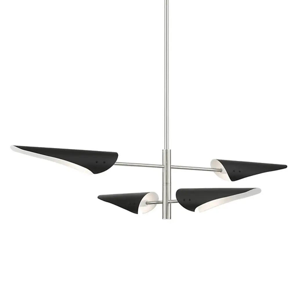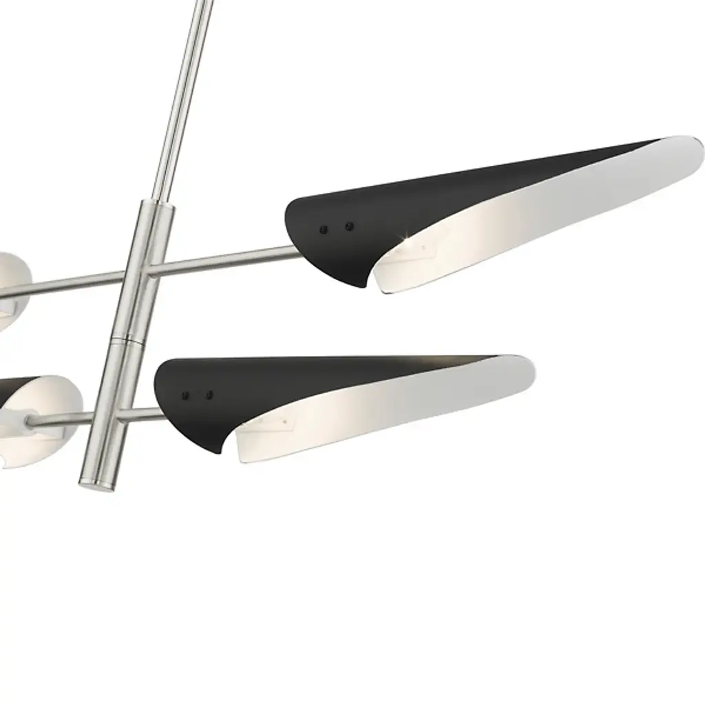 Gliding overhead with a soothing glow. Sweeping and aerodynamic like a bird’s wings, the Aaron Linear 2 Tier Chandelier from Alder & Ore draws a dramatic silhouette inspired by the clean visuals of mid-century and Scandinavian design. As a dynamic, sculptural piece, the chandelier treats everyone around the room to an eye-catching display. It gives off an effortless elegance as it suspends with a slim down rod. Horizontal arms are arranged in a cross to give the light a fully encompassing quality. Concealing the bulbs for reduced glare, the metal shades seduce with sweeping cuts. The shades funnel light outwards while letting light drop down, resulting in a comfortable, surrounding glow.