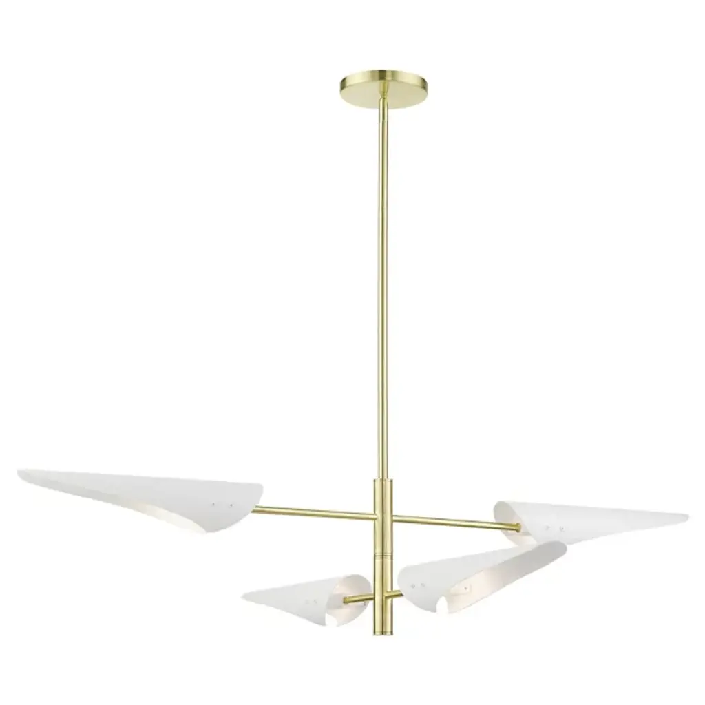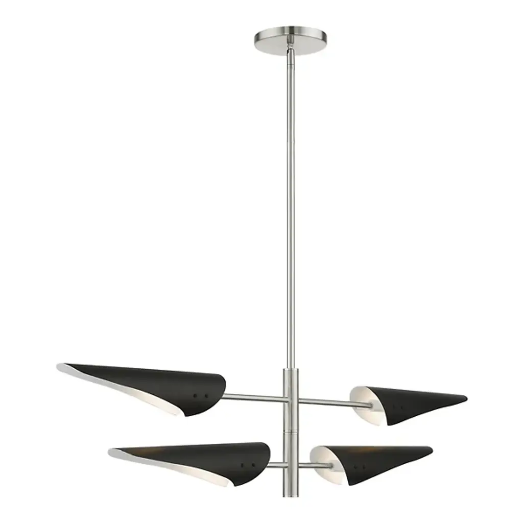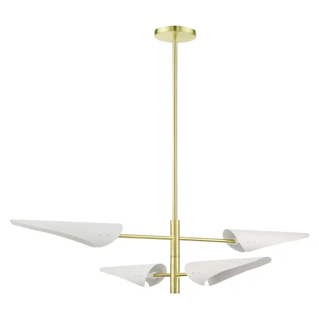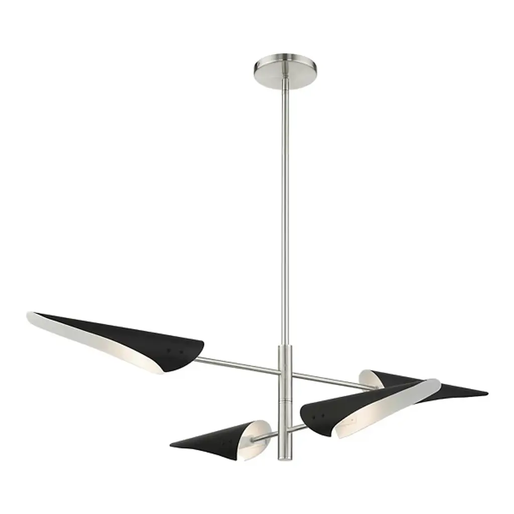 Gliding overhead with a soothing glow. Sweeping and aerodynamic like a bird’s wings, the Aaron Linear 2 Tier Chandelier from Alder & Ore draws a dramatic silhouette inspired by the clean visuals of mid-century and Scandinavian design. As a dynamic, sculptural piece, the chandelier treats everyone around the room to an eye-catching display. It gives off an effortless elegance as it suspends with a slim down rod. Horizontal arms are arranged in a cross to give the light a fully encompassing quality. Concealing the bulbs for reduced glare, the metal shades seduce with sweeping cuts. The shades funnel light outwards while letting light drop down, resulting in a comfortable, surrounding glow.