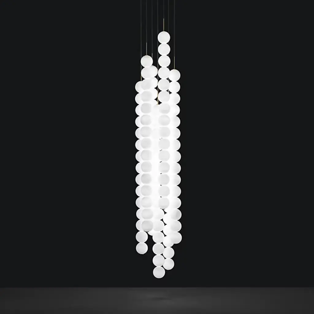 Modern lighting with a pure, mathematically inspired form. The Abacus 15 Sphere 7 LED Chandelier by Terzani was designed by the Draw team to evoke the look of an ancient abacus or, in fact, 7 abacuses. It features 7 strands adorned with 15 hand-blown Satin White Glass spheres each. The glass remains bright and clean looking even when the fixture is turned off and then, when the fixture is turned on, magnifies and diffuses the light created by the integrated LEDs into a vibrant, all-around glow. This sizable piece is the ideal choice for creating a big impression in a tall entryway or stairwell.