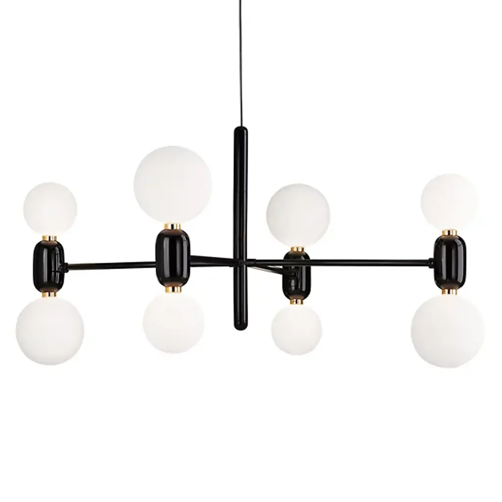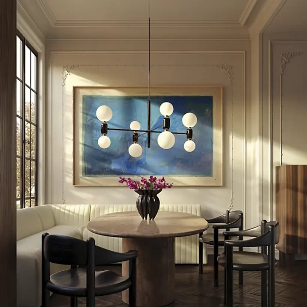 The Aballs 1 Tier Chandelier from Parachilna provides a meticulously crafted to embody a retro-modern aesthetic through its captivating layered composition. Designed by the renowned Jaime Hayon, this fixture gracefully descends from a sleek stepped circular ceiling mount, extending a rounded structure below. The curved structure, accented by a series of small metal collars, separates the handblown glass shades from the fixture body, putting subtle differences in each finely crafted glass sphere diffuser on full display and revealing the brilliance of its ambient lighting. The intersection of opulent materials and minimalist design elements creates smooth sophistication, making it a distinguished addition to any interior décor design.
