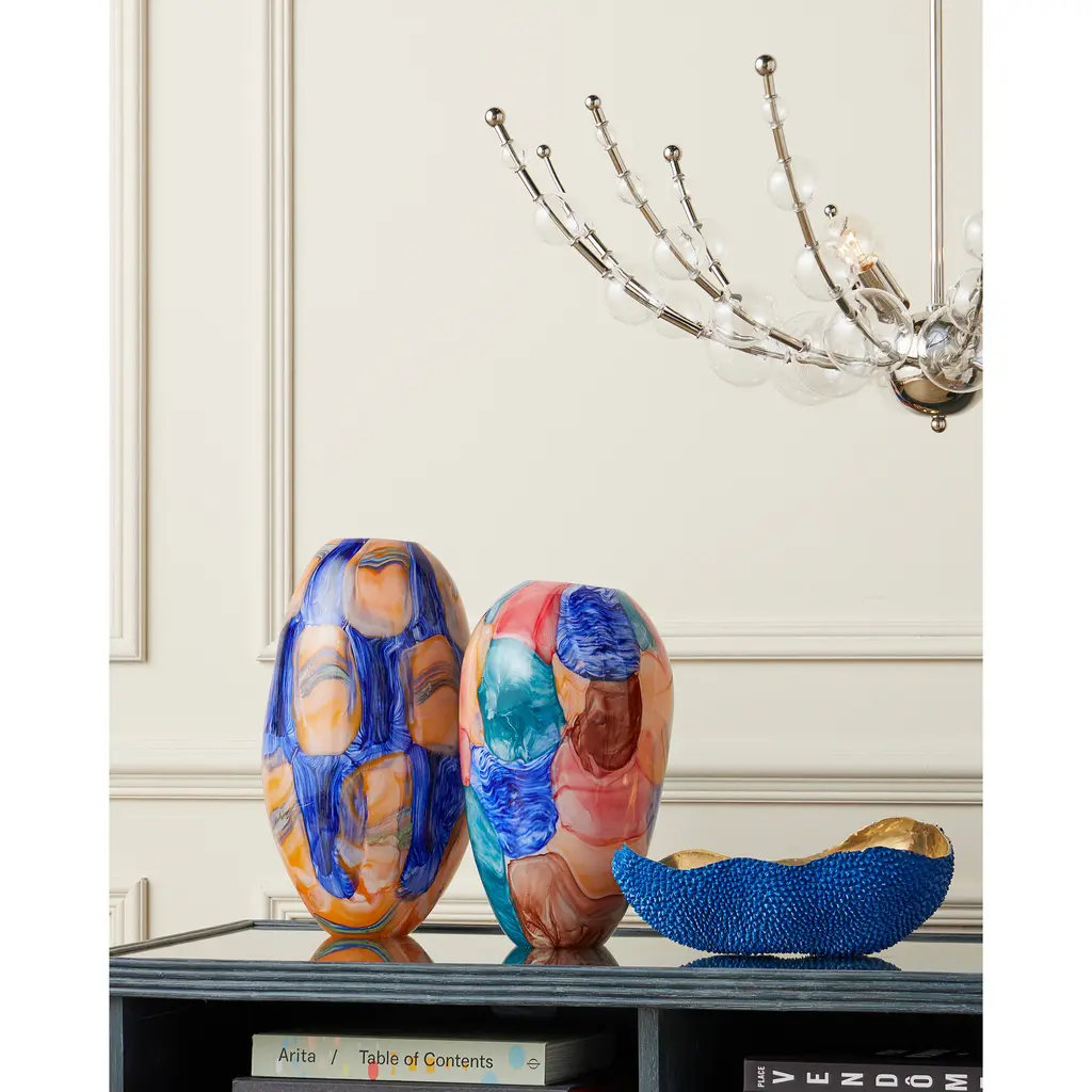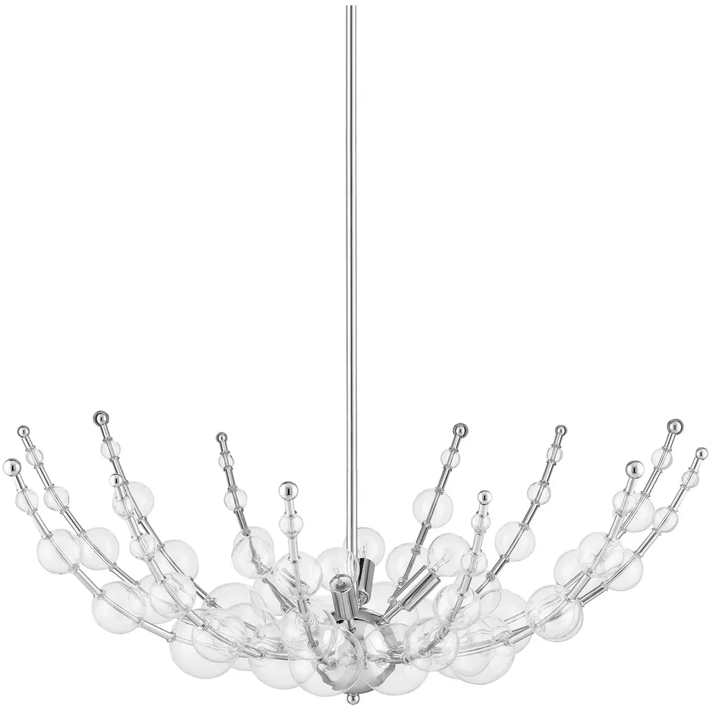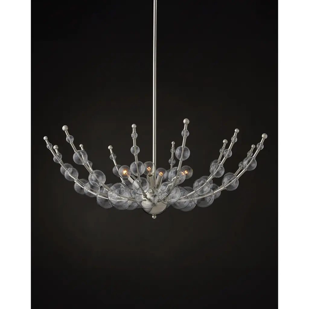The Abberton Chandelier will bring a wow-factor to any room it illuminates. Designed by Ian Thornton, the silver chandelier with its polished nickel finish will effervesce when the lights are switched on as the glow reflects on and through the glass globes that graduate from large at the fixture’s central cog to small near the apex of each stem. Design details of note are the rod stem from which it hangs, the bulbs that echo the roundness of the glass globes, and the circular accent on the ends of the stems that mimic the shape of the smallest ones.