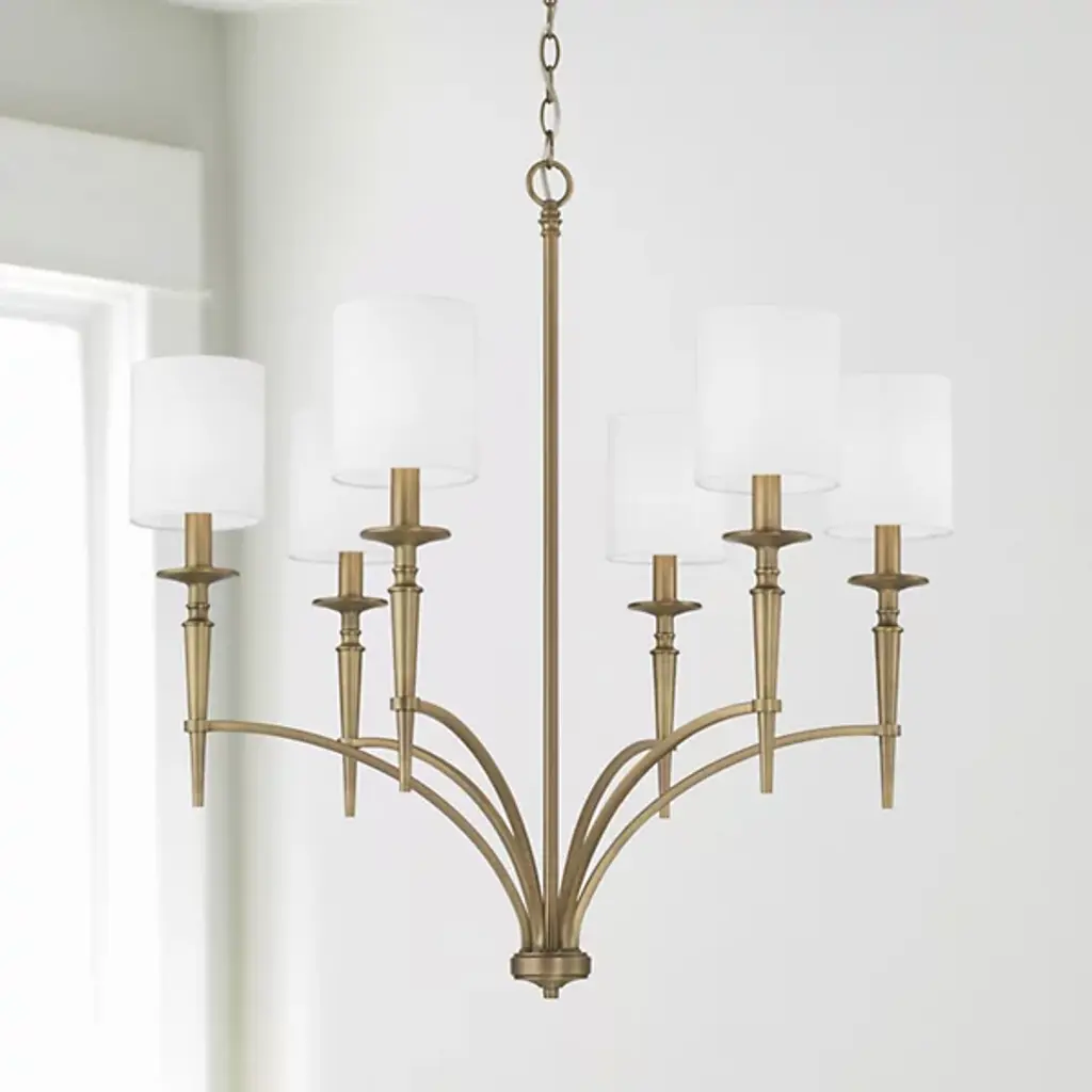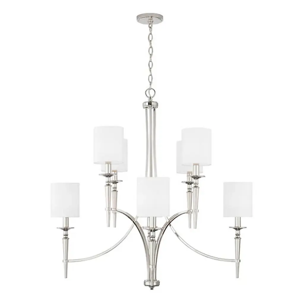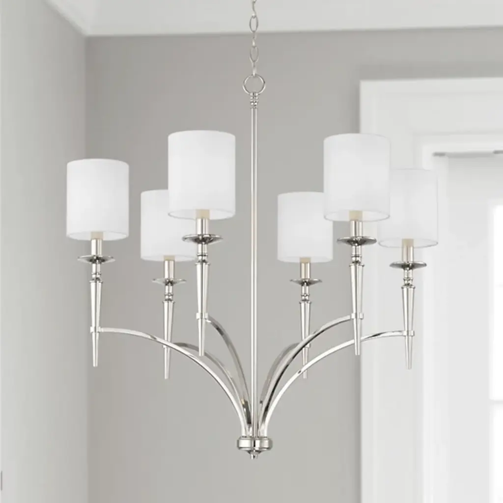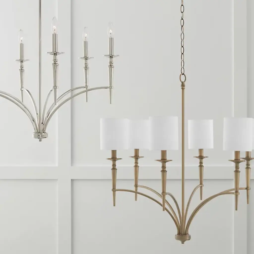 The Abbie Chandelier from Capital Lighting provides a stunning blend of shapes and angles that embodies transitional style. The fixture extends from a stepped circular canopy, with a slender central stem blooming curving arms from a lower hub, featuring a captivating combination of straight edges and striking curves, adding layers of drama to your decor. The smooth metal faux-candlestick detailing brings a glamorous touch to this decadent design. What makes this fixture truly versatile is its adaptable lighting—choose to style it with or without the included shades, allowing you to customize the look to suit your taste, adding direct illumination, or softening the light with the translucent fabric shades.