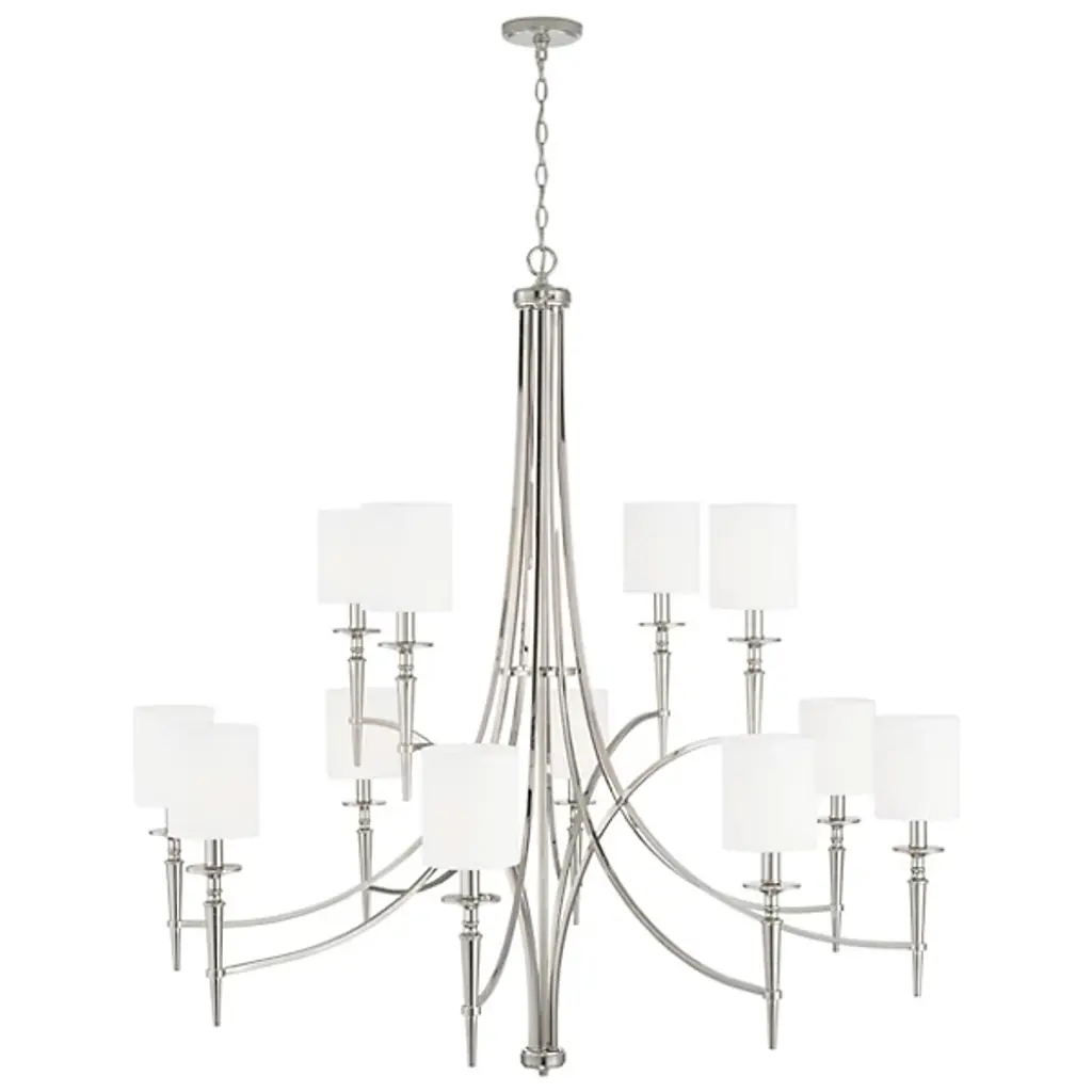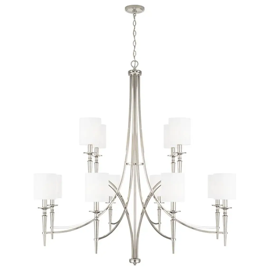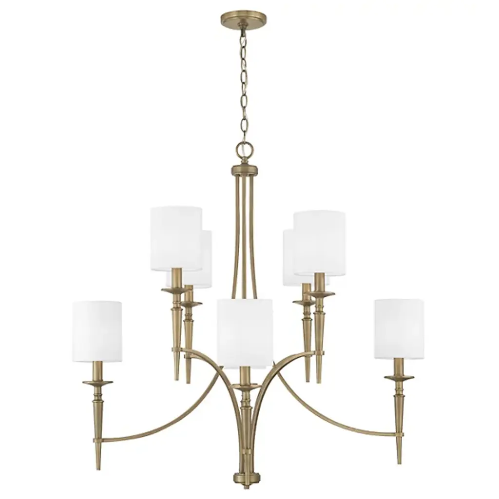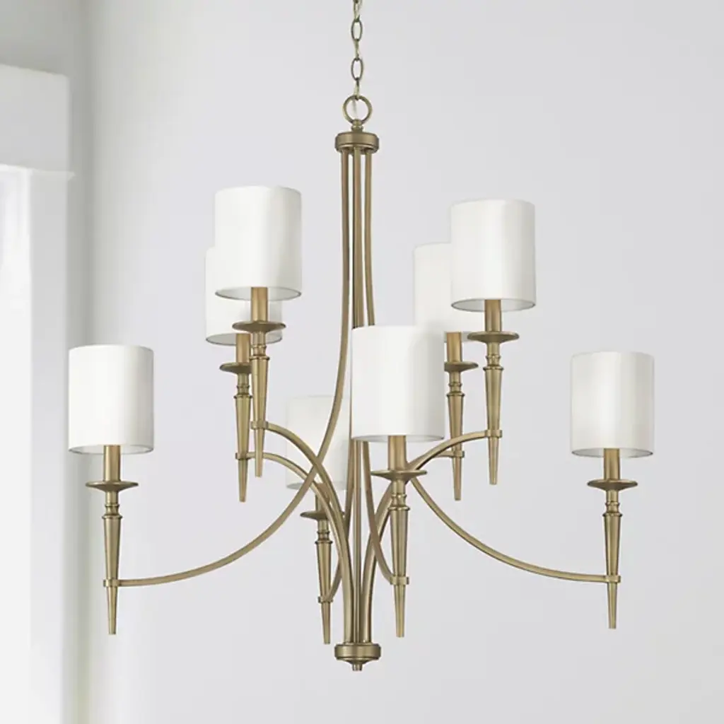 The Abbie Chandelier from Capital Lighting provides a stunning blend of shapes and angles that embodies transitional style. The fixture extends from a stepped circular canopy, with a slender central stem blooming curving arms from a lower hub, featuring a captivating combination of straight edges and striking curves, adding layers of drama to your decor. The smooth metal faux-candlestick detailing brings a glamorous touch to this decadent design. What makes this fixture truly versatile is its adaptable lighting—choose to style it with or without the included shades, allowing you to customize the look to suit your taste, adding direct illumination, or softening the light with the translucent fabric shades.