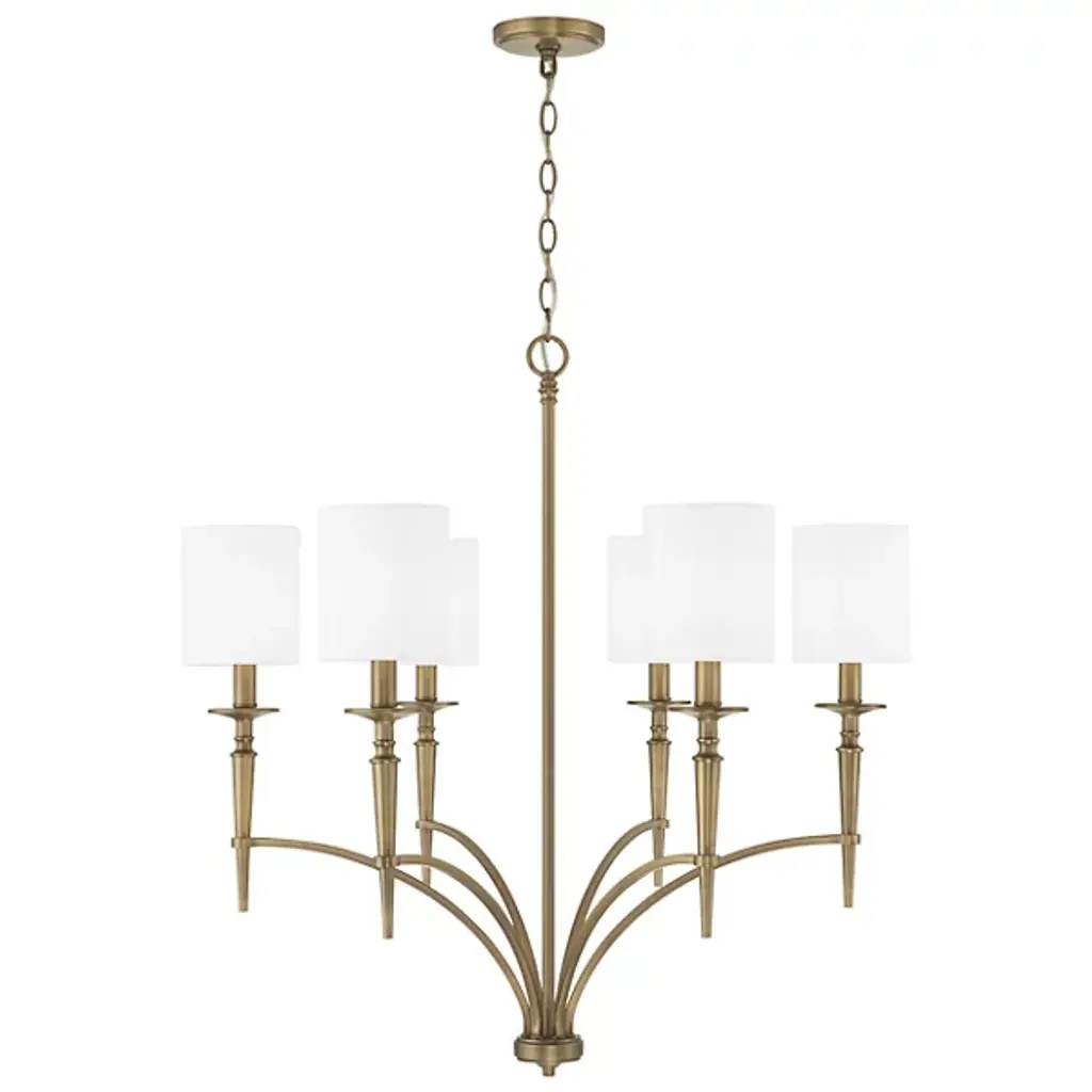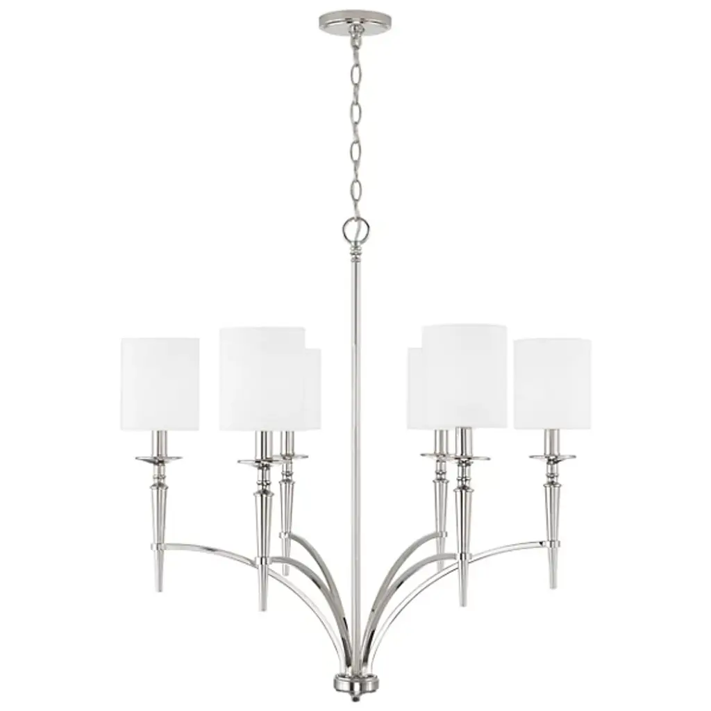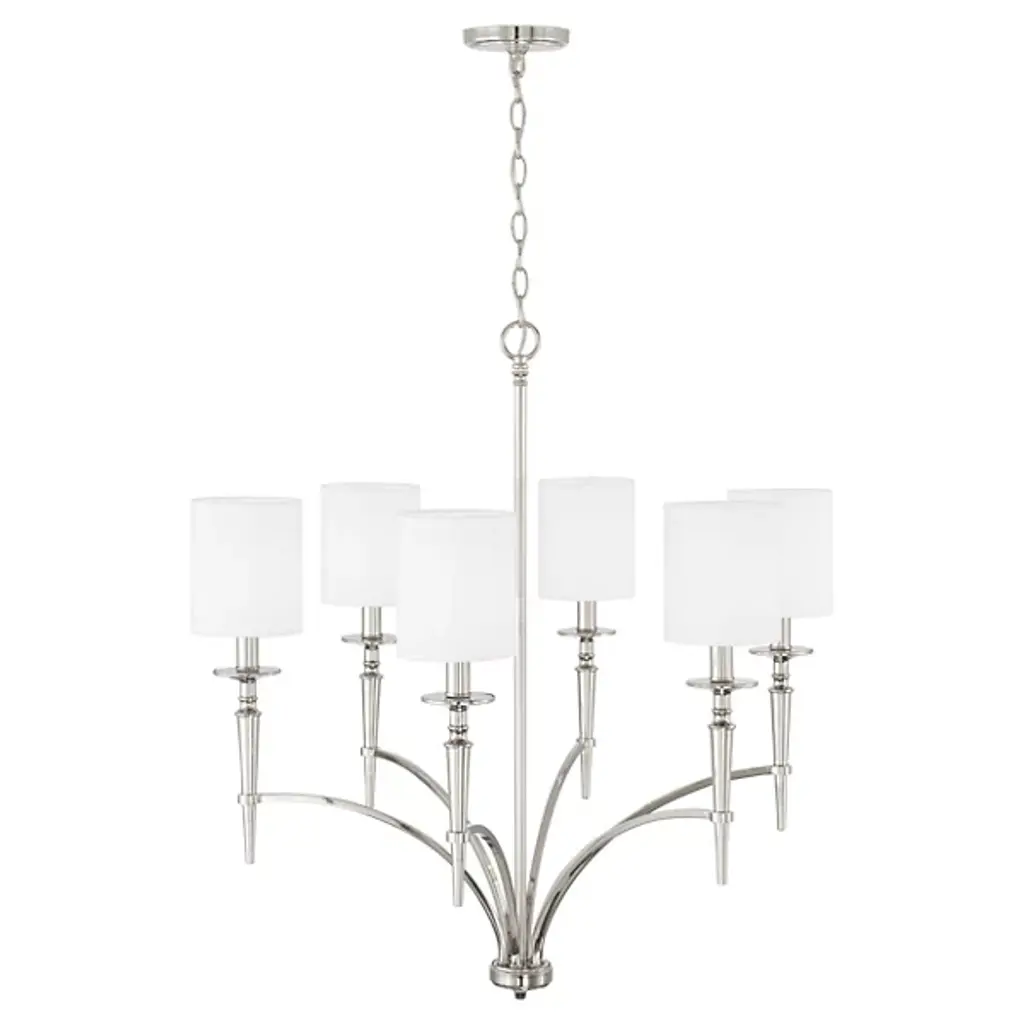 The Abbie Chandelier from Capital Lighting provides a stunning blend of shapes and angles that embodies transitional style. The fixture extends from a stepped circular canopy, with a slender central stem blooming curving arms from a lower hub, featuring a captivating combination of straight edges and striking curves, adding layers of drama to your decor. The smooth metal faux-candlestick detailing brings a glamorous touch to this decadent design. What makes this fixture truly versatile is its adaptable lighting—choose to style it with or without the included shades, allowing you to customize the look to suit your taste, adding direct illumination, or softening the light with the translucent fabric shades.