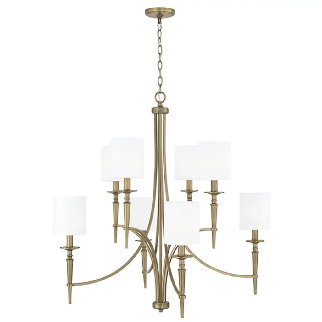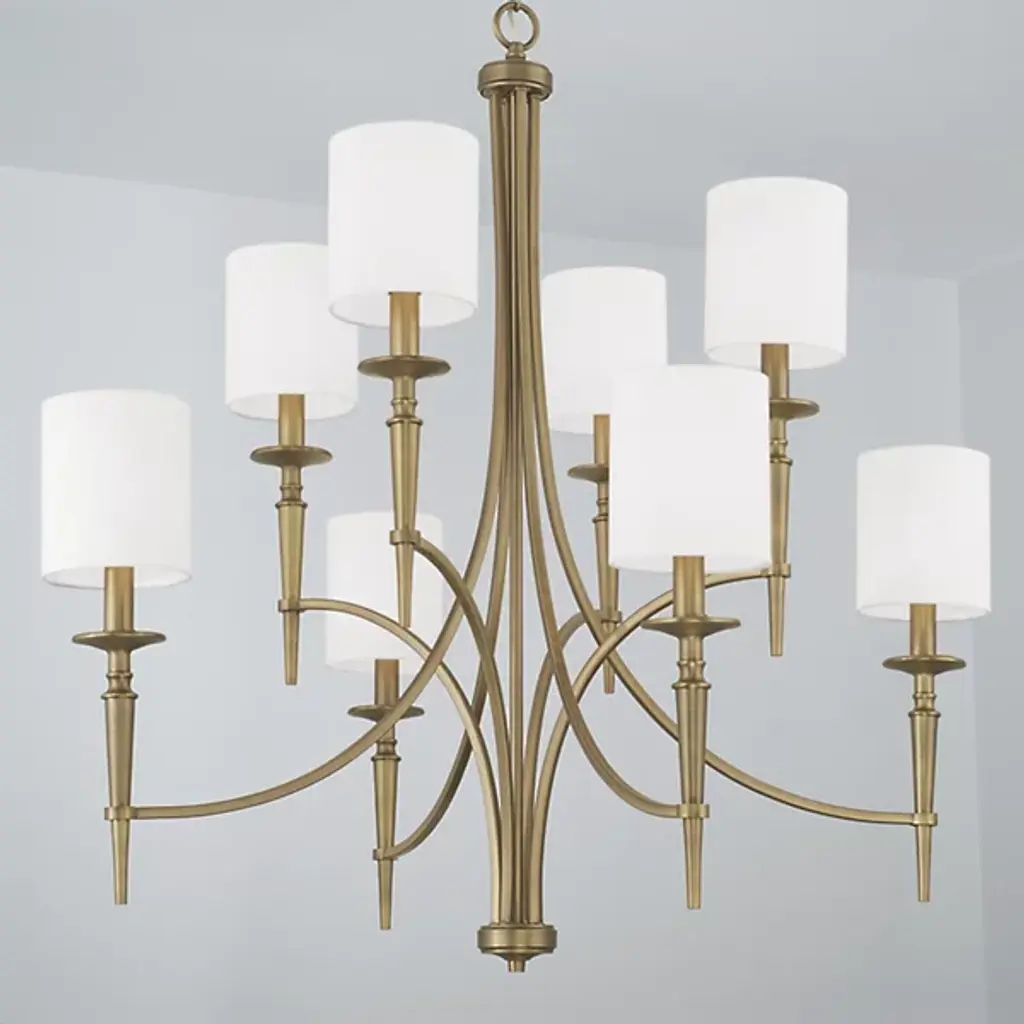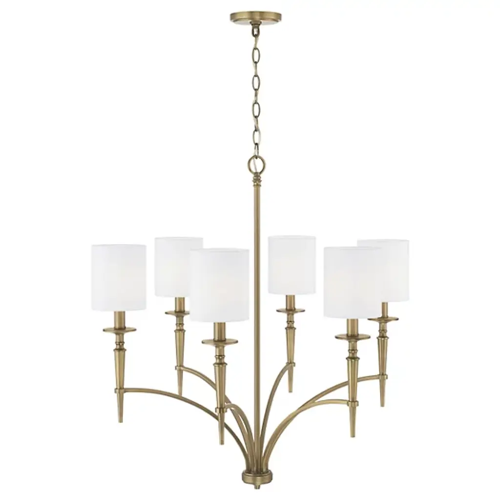 The Abbie Chandelier from Capital Lighting provides a stunning blend of shapes and angles that embodies transitional style. The fixture extends from a stepped circular canopy, with a slender central stem blooming curving arms from a lower hub, featuring a captivating combination of straight edges and striking curves, adding layers of drama to your decor. The smooth metal faux-candlestick detailing brings a glamorous touch to this decadent design. What makes this fixture truly versatile is its adaptable lighting—choose to style it with or without the included shades, allowing you to customize the look to suit your taste, adding direct illumination, or softening the light with the translucent fabric shades.