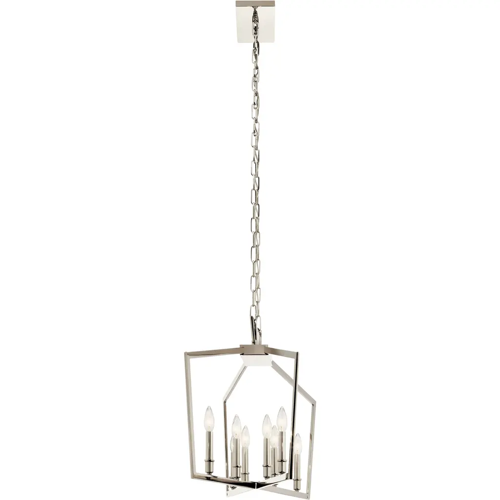 The open cage style of Abbotswell linear chandelier makes maximum impact with minimal lines. Intersecting pentagons in a cool Polished Nickel finish create a look that works in a variety of decors: updated traditional, transitional or modern farmhouse.