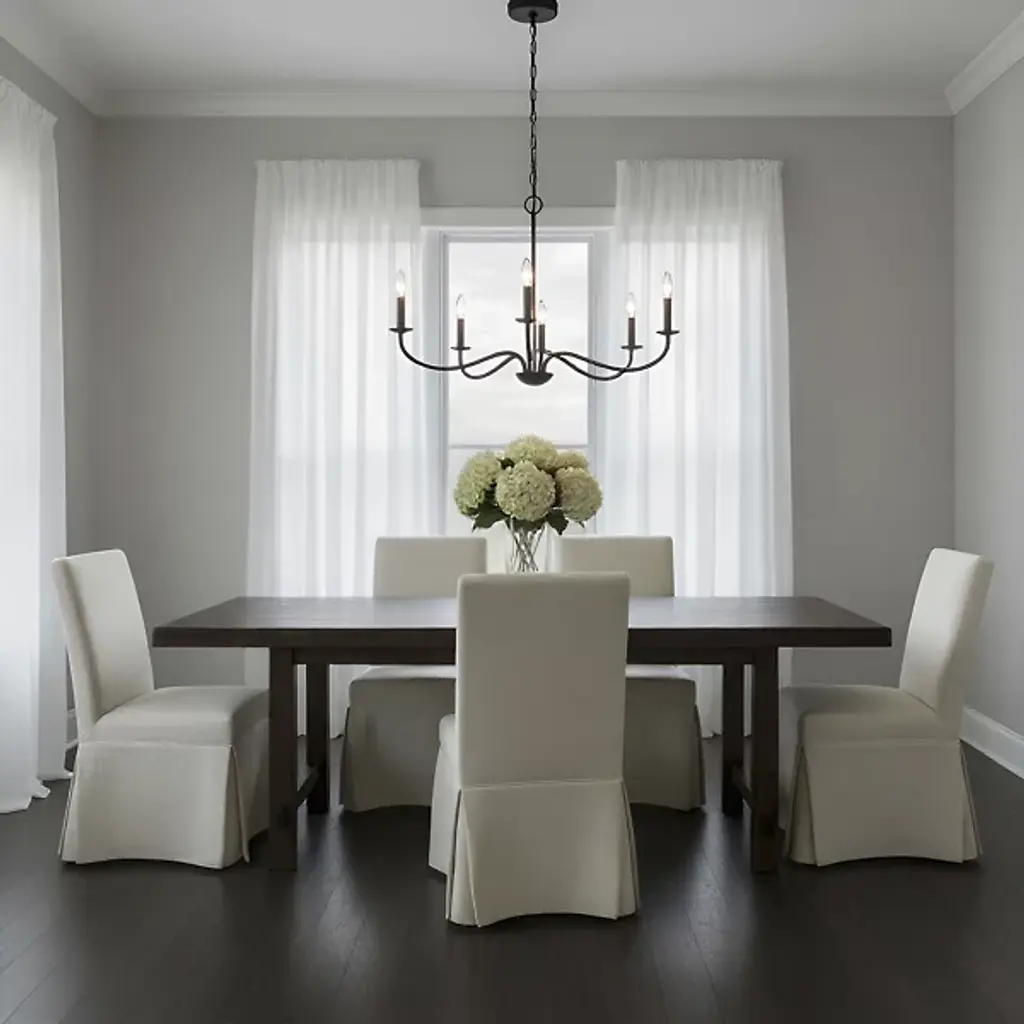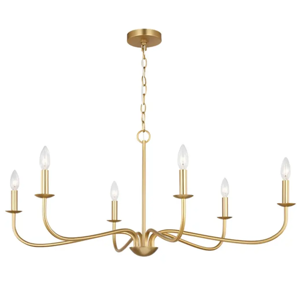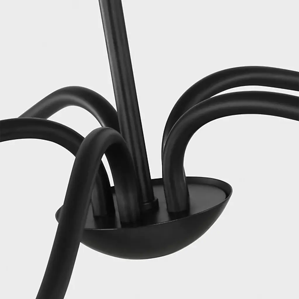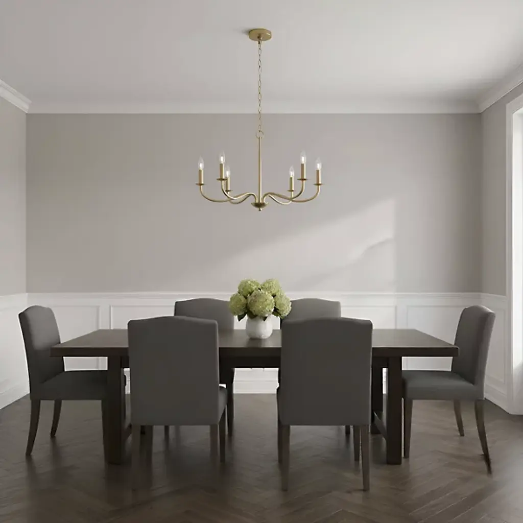 The Abells Multi-Light Chandelier from Generation Lighting employs soft sweeping arms that curve gracefully outward from a central hub to create its signature wide, low profile. The exposed candelabra-style sockets eliminate traditional shades, allowing the bulb forms to become integral design elements. Each arm follows a gentle arc that establishes rhythmic balance across the fixture's horizontal span. This chandelier can accommodate sloped ceiling installations and offers full dimming capabilities for varied atmospheric control throughout different lighting scenarios.