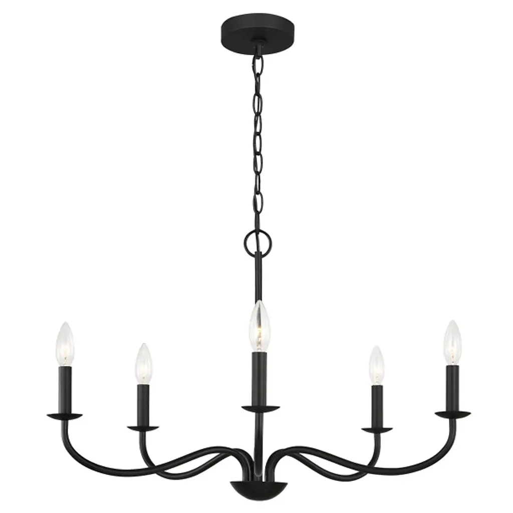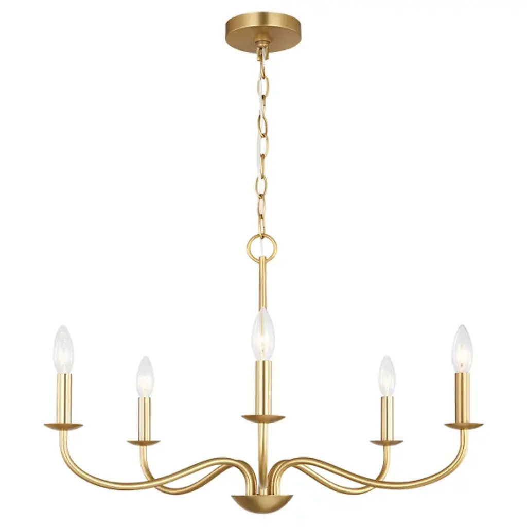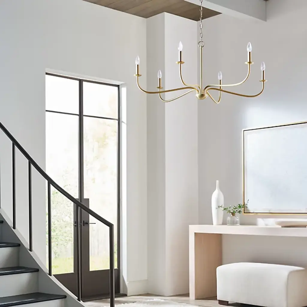 The Abells Multi-Light Chandelier from Generation Lighting employs soft sweeping arms that curve gracefully outward from a central hub to create its signature wide, low profile. The exposed candelabra-style sockets eliminate traditional shades, allowing the bulb forms to become integral design elements. Each arm follows a gentle arc that establishes rhythmic balance across the fixture's horizontal span. This chandelier can accommodate sloped ceiling installations and offers full dimming capabilities for varied atmospheric control throughout different lighting scenarios.