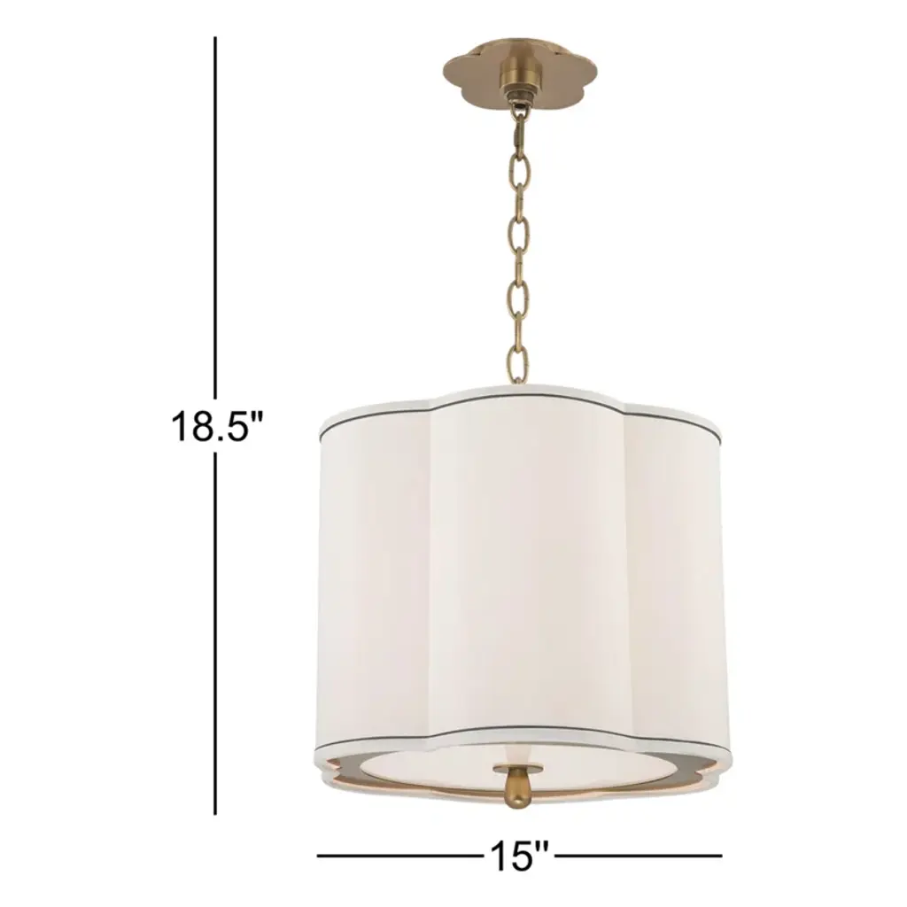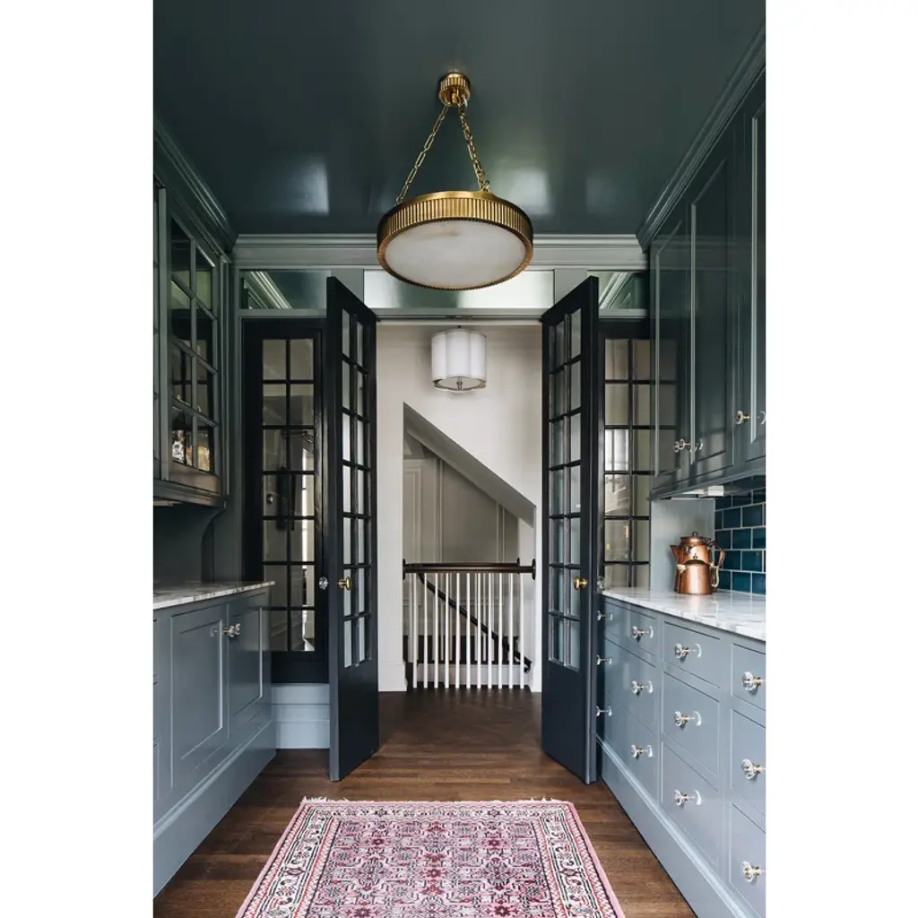 The soft curves of the fixture’s fabric shade with its navy blue pinstripes are the first thing you’ll notice. Its plate glass diffuser and knob-like finial, its mirroring canopy, are all things that become apparent with lingering consideration. The fixture has a lovely light diffusion and looks great from every angle.