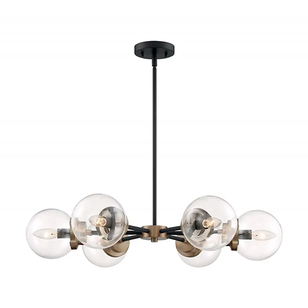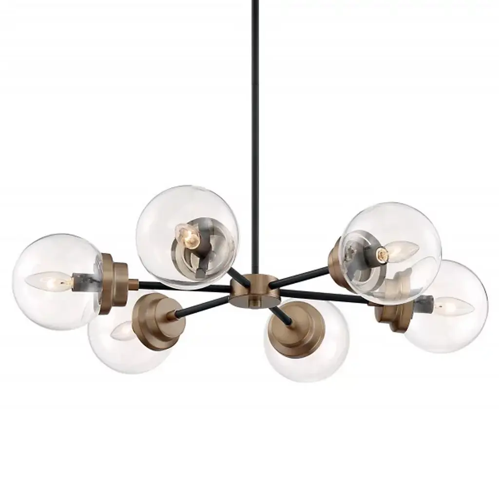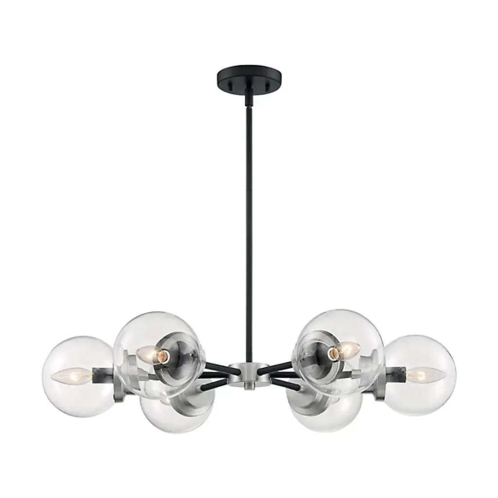 The Abraham Chandelier by Alder & Ore is a handsome addition to spaces that has a cool, modern feel. Supported by a single down rod, an array of simple, metal stems reach outward to create a circular composition of smooth, spherical glass shades. Within each shade, a visible bulb shines, offering a bright and beautiful touch to surroundings, and a mix of finishes gives this chandelier a tailored, sophisticated look.