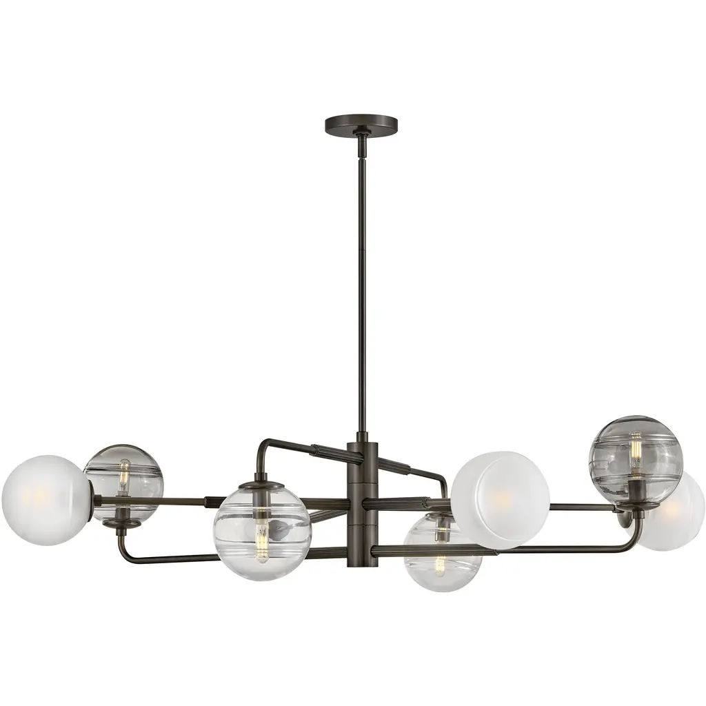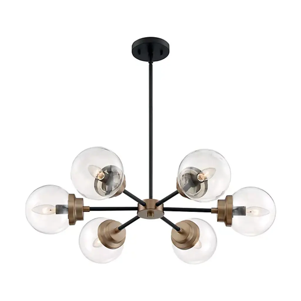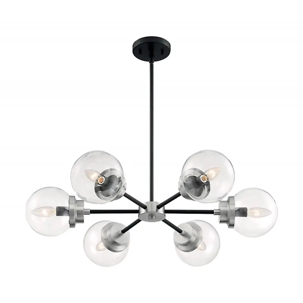 The Abraham Chandelier by Alder & Ore is a handsome addition to spaces that has a cool, modern feel. Supported by a single down rod, an array of simple, metal stems reach outward to create a circular composition of smooth, spherical glass shades. Within each shade, a visible bulb shines, offering a bright and beautiful touch to surroundings, and a mix of finishes gives this chandelier a tailored, sophisticated look.