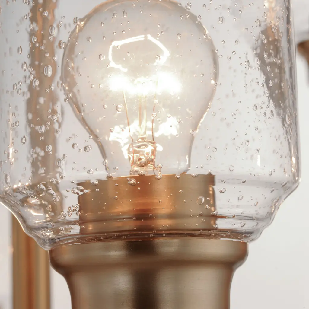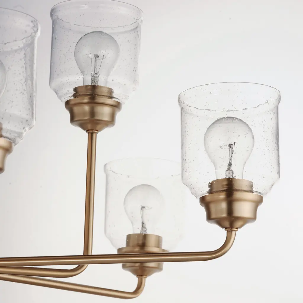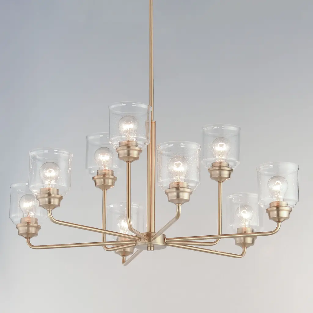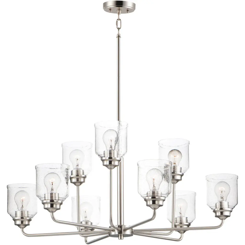 A modest frame of steel tubing gently bends to support a cluster of Clear Seedy bell-shaped glass. Similarly the bobeches and other metal accents echo that traditional bell shape creating an instant classic. An easy choice with transitional appeal, choose from a variety of complimentary finishes including matte Black, Heritage Brass or Satin Nickel.