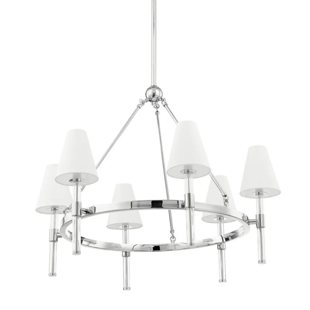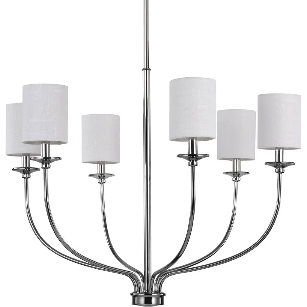 An uplifting vertical design in oil rubbed bronze with crystal bobeches and fabric shades Comes with 5' of chain and 12' of wire Canopy Included: TRUE / Shade Included: TRUE / Canopy Diameter: 5.25. , Material: Steel, Finish Color: Polished Nickel, Width: 28", Height: 24.5", Chain Length: 60", Number Of Bulbs: 5, Wattage: 60 Watts, Dimmable: No, Moisture Rating: Dry Rated