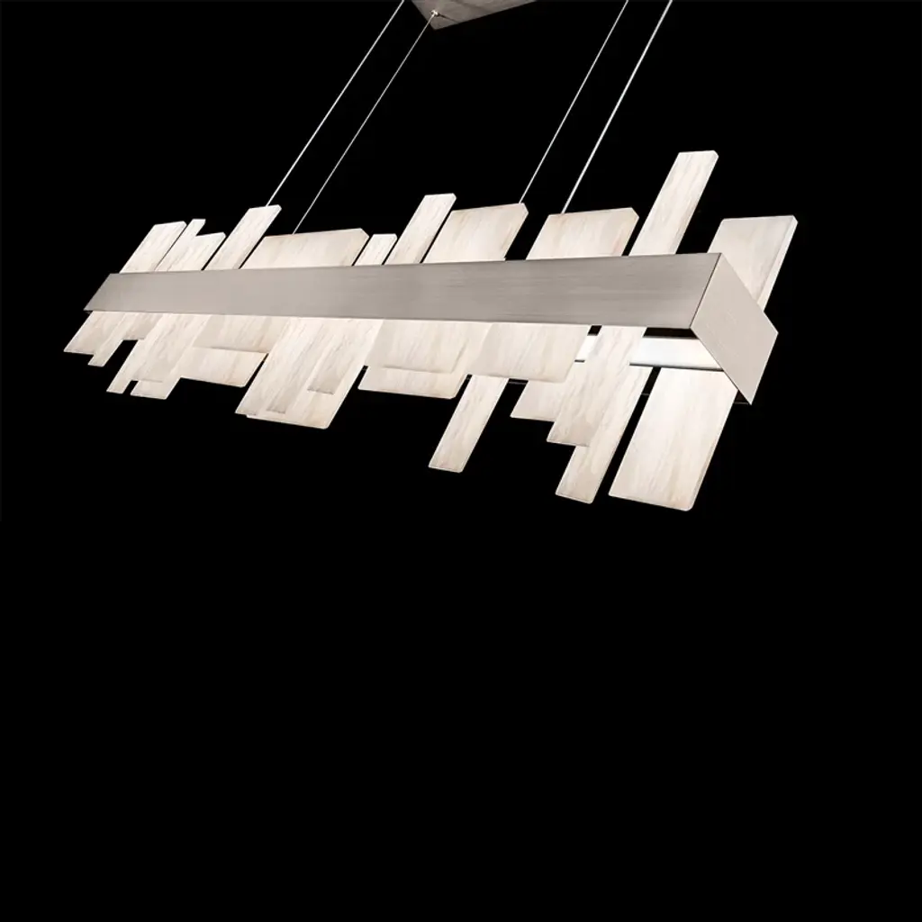 From the shining city on a hill, our visual vocabulary gives us a statement piece for the ages. This abstract lightscape features undulating Spanish natural alabaster forms reflected below a luminous aged brass band in peaceful symmetry. Ultra-thin power cables and minimal hardware complete a clean architectural design.