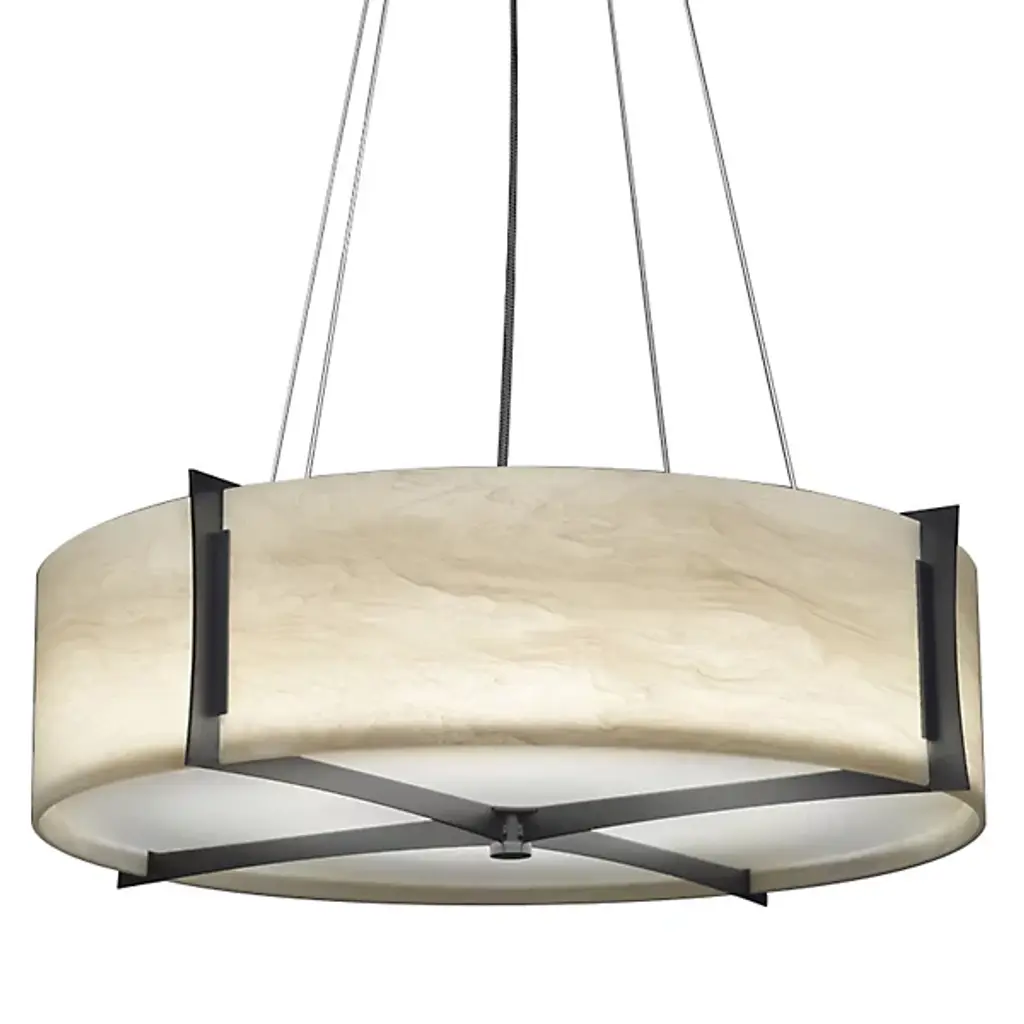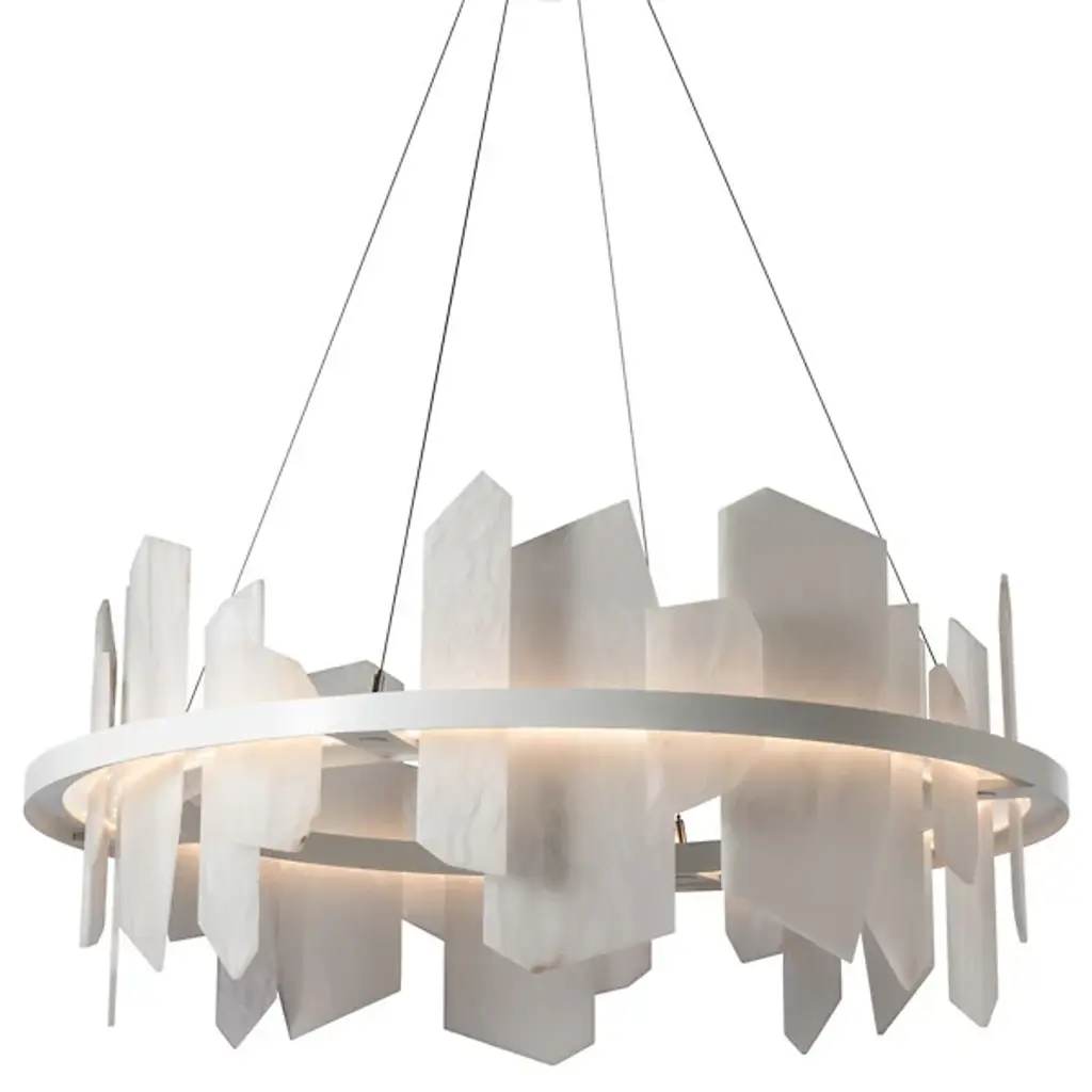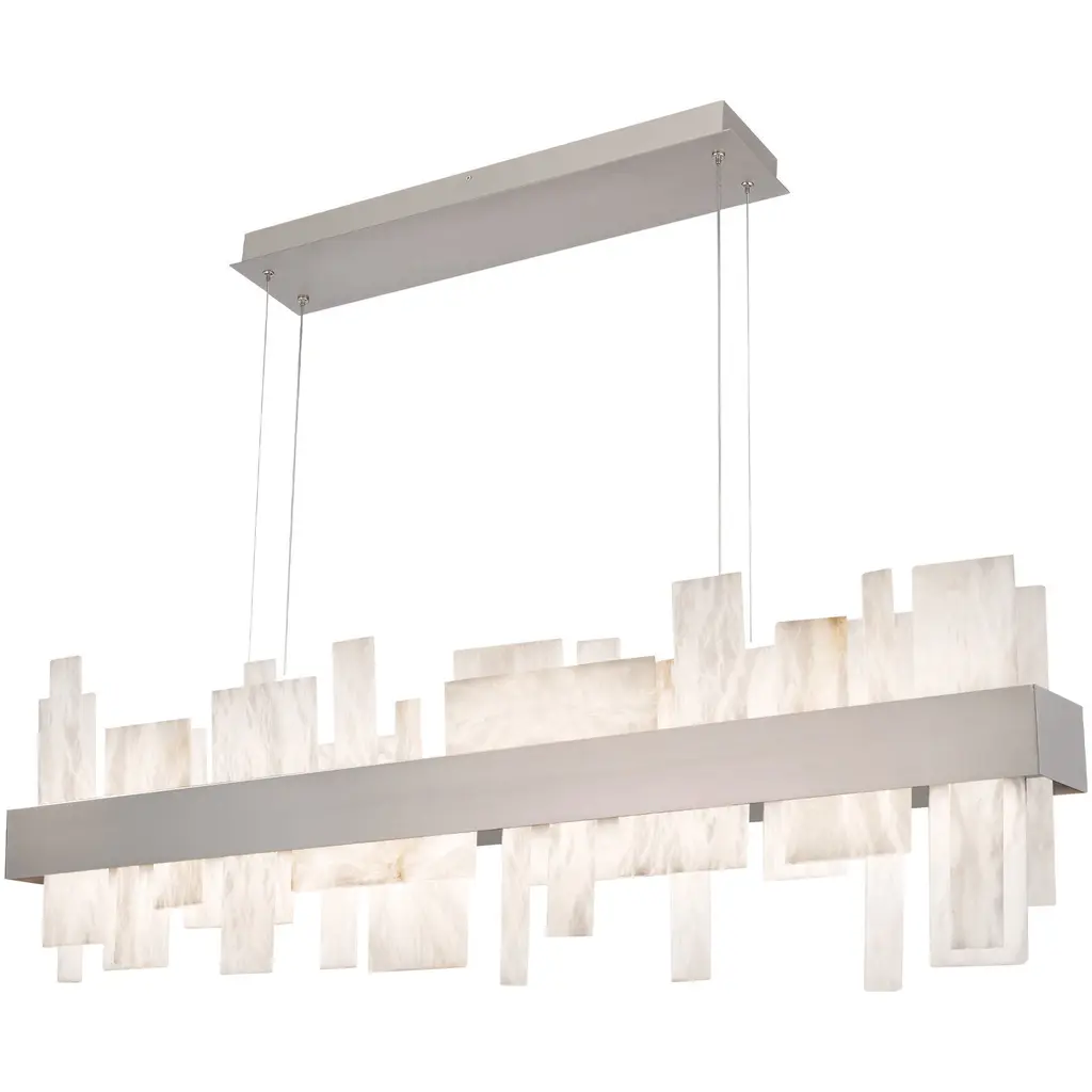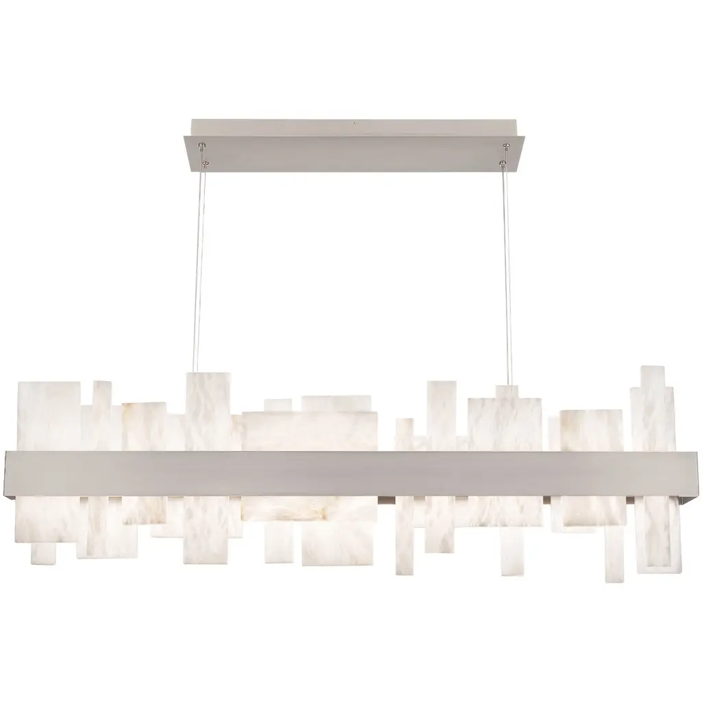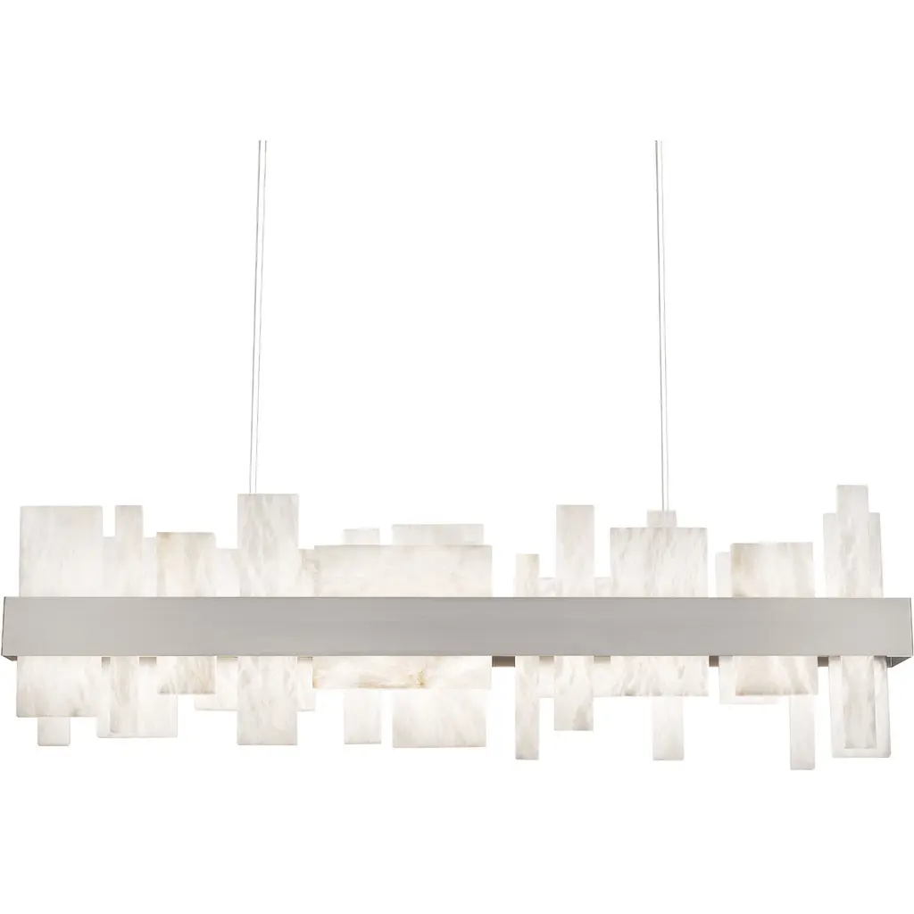 From the shining city on a hill, our visual vocabulary gives us a statement piece for the ages. This abstract lightscape features undulating Spanish natural alabaster forms reflected below a luminous aged brass band in peaceful symmetry. Ultra-thin power cables and minimal hardware completes a clean architectural design. Energy efficient integrated LED's provide a long-lasting maintenance-free bright and even illumination throughout any space.