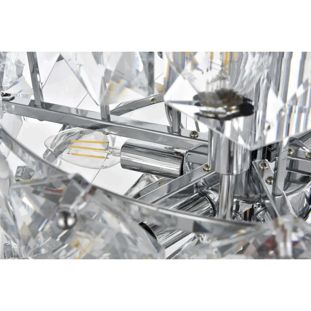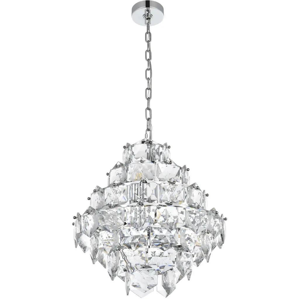 Transform your space with this cascading multi-tier pendant light that combines striking design with meticulous craftsmanship. Crafted from a sturdy iron frame and adorned with six-sided faceted crystals, this lighting piece exudes charm through its ability to diffuse light into a soft, radiant glow. With finishes available in both sleek chrome for a contemporary feel and satin gold for a warmer, refined touch, it complements a range of decor styles. The adjustable height, from 29 inches to 89 inches with the included 59-inch chain, ensures it fits seamlessly in any setting. Equipped with eleven E12 sockets and dimmable functionality, you can customize the lighting to suit your mood or occasion. Its matching canopy and chain finish complete the cohesive design, making it perfect for kitchens, dining rooms, living rooms, or offices. A statement piece that transforms your space into a work of art, this pendant is the perfect blend of style and functionality.