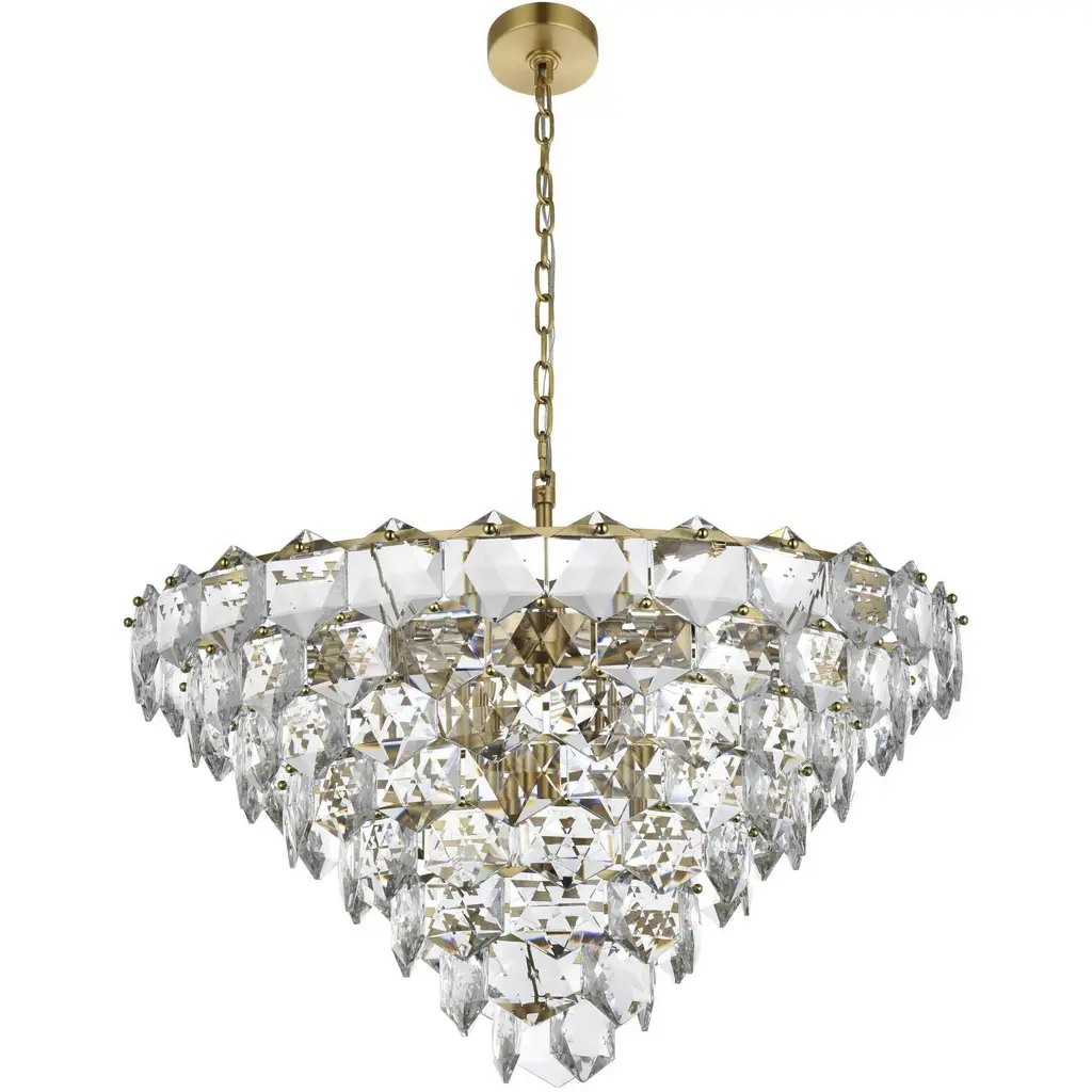 Transform your space with this cascading multi-tier pendant light that combines striking design with meticulous craftsmanship. Crafted from a sturdy iron frame and adorned with six-sided faceted crystals, this lighting piece exudes charm through its ability to diffuse light into a soft, radiant glow. With finishes available in both sleek chrome for a contemporary feel and satin gold for a warmer, refined touch, it complements a range of decor styles. The adjustable height, from 27 inches to 87 inches with the included 59-inch chain, ensures it fits seamlessly in any setting. Equipped with fifteen E12 sockets and dimmable functionality, you can customize the lighting to suit your mood or occasion. Its matching canopy and chain finish complete the cohesive design, making it perfect for kitchens, dining rooms, living rooms, or offices. A statement piece that transforms your space into a work of art, this pendant is the perfect blend of style and functionality.