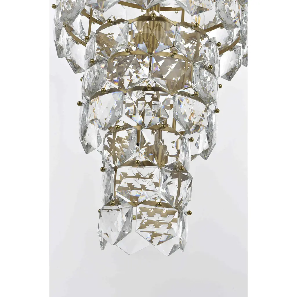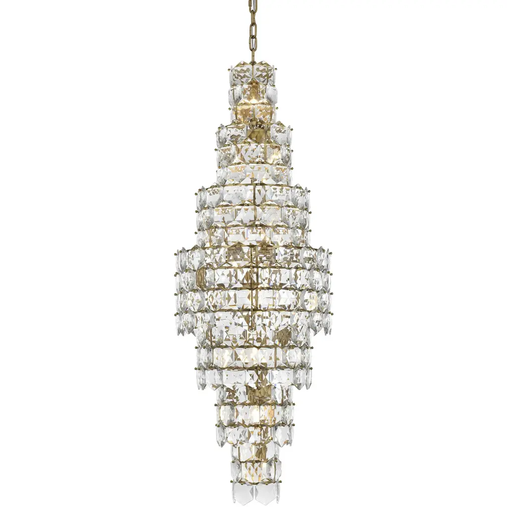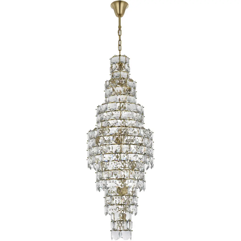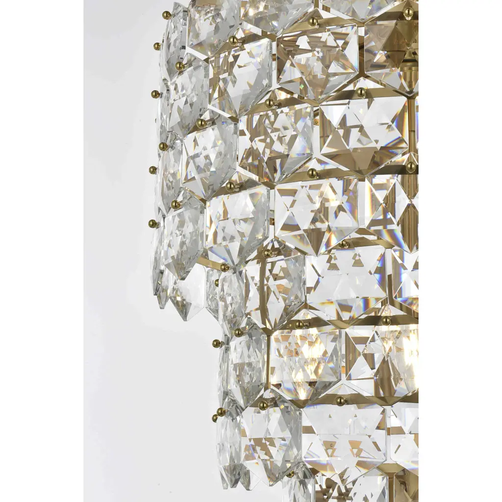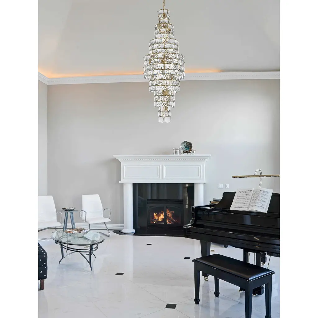 Transform your space with this spectacular crystal pendant that redefines modern luxury. The masterfully engineered design features ten graduating tiers that create a dramatic tapered silhouette, reminiscent of a frozen waterfall captured in mid-descent. Each precisely cut hexagonal crystal is strategically positioned to maximize light play, creating mesmerizing displays of fractured light and shadow throughout your space. The substantial scale and architectural presence make this fixture an ideal centerpiece for grand entryways, sophisticated dining rooms, or executive offices. The thoughtful construction incorporates 26 light sources distributed throughout the tiers, ensuring both spectacular illumination and enchanting crystal animation. The robust iron framework provides a secure foundation while maintaining visual lightness, allowing the crystals to appear as if floating in space. Whether styled in reflective chrome or warm satin gold, this pendant makes an unforgettable statement while maintaining sophisticated restraint. The cascading arrangement creates a sense of movement and flow, while the geometric precision of each crystal adds contemporary edge to the classical form. This is more than a light fixture it's an architectural feature that transforms your space through its commanding presence and spectacular light performance.