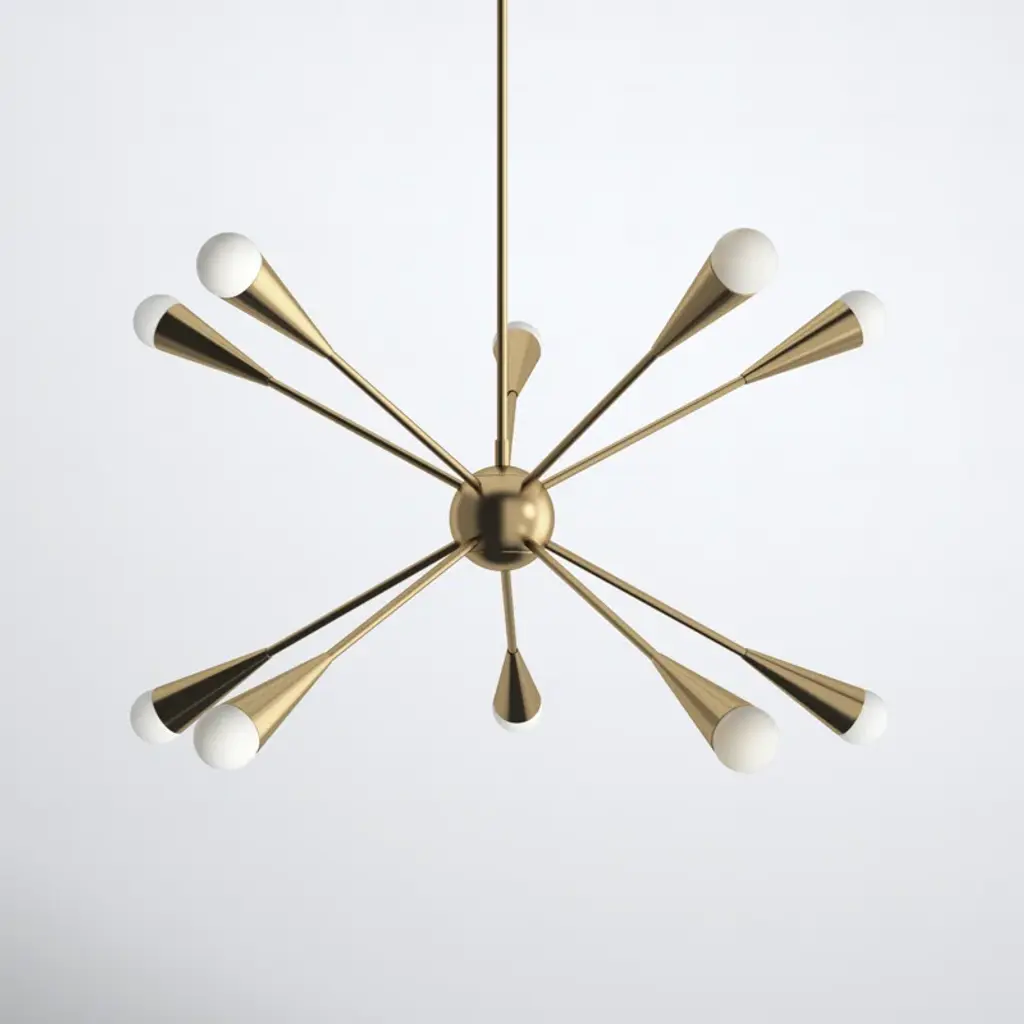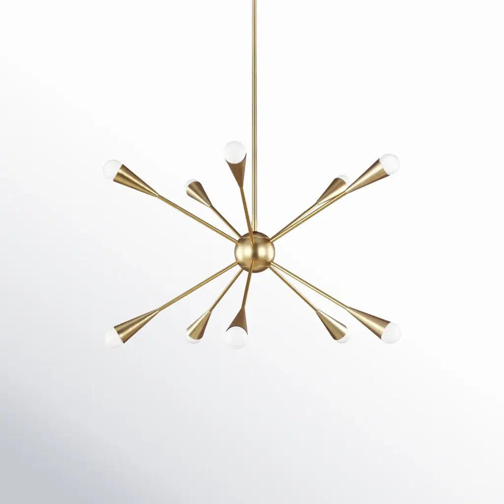 The 10 - Light Sputnik Sphere Chandelier in burnished brass is the perfect way to achieve your desired fashion or functional needs in your home. Addley channels the celestial allure of a starburst silhouette, celebrating its iconic status within classic art deco design.