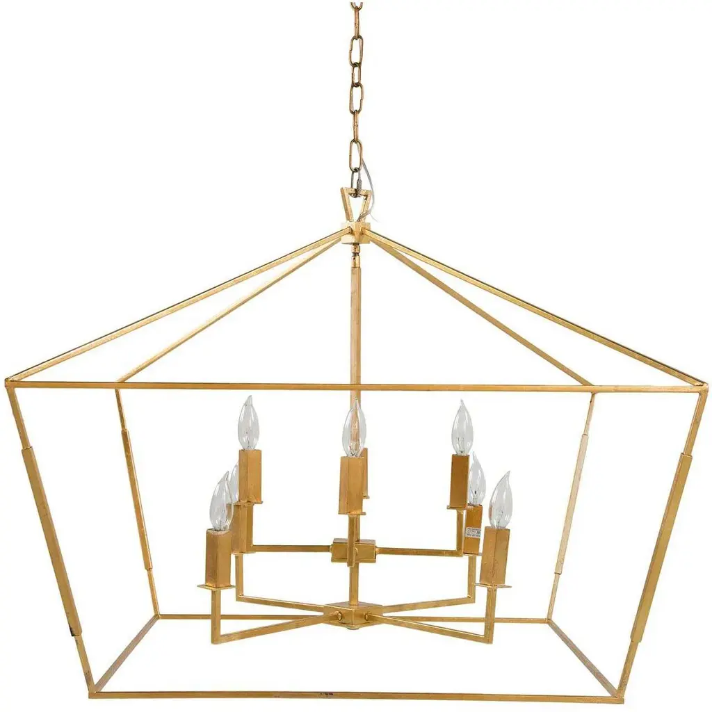 Structured yet open, this fixture is crafted of iron with a geometric silhouette and antiqued gold finish. Hardwired.