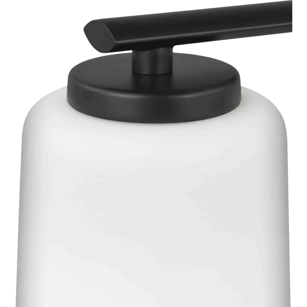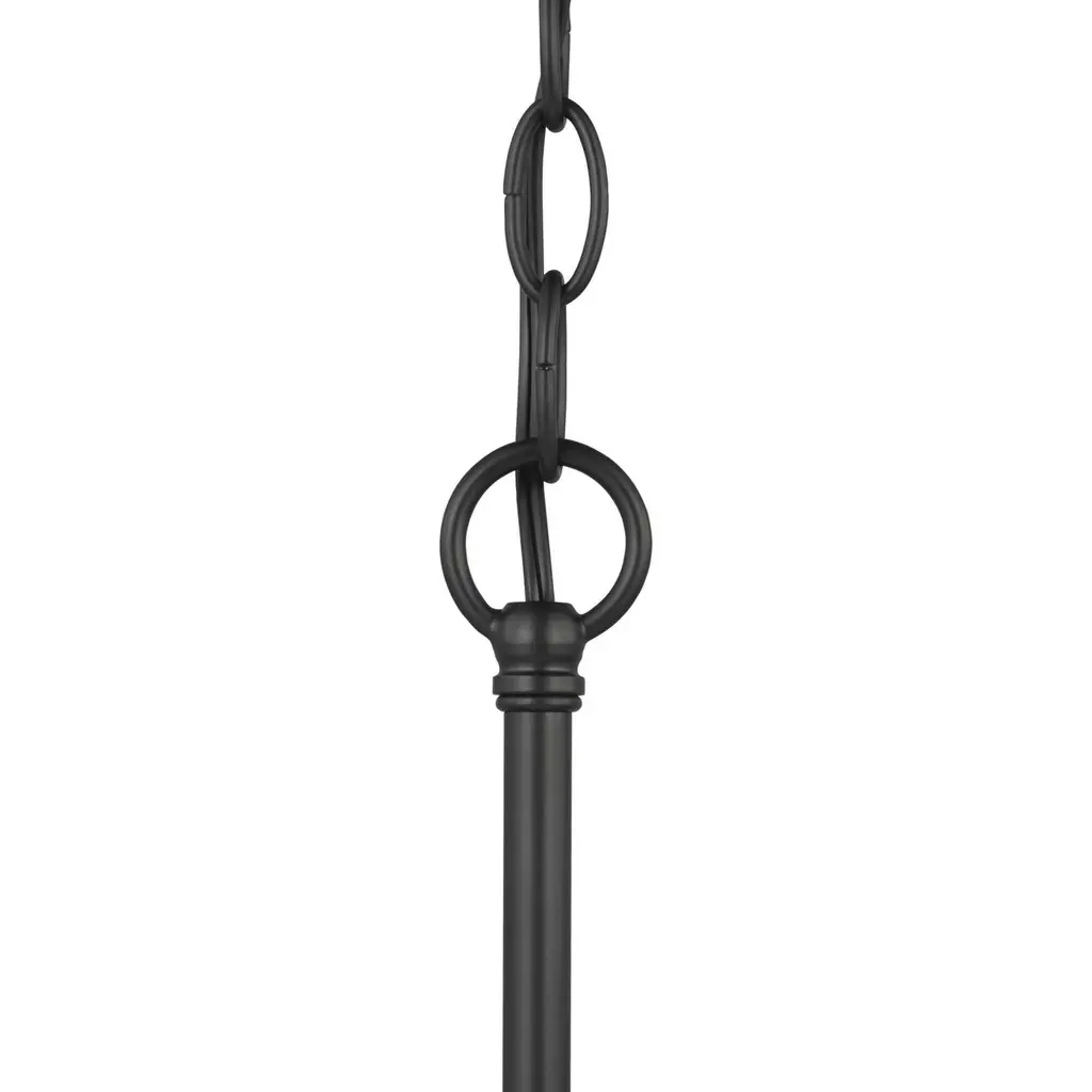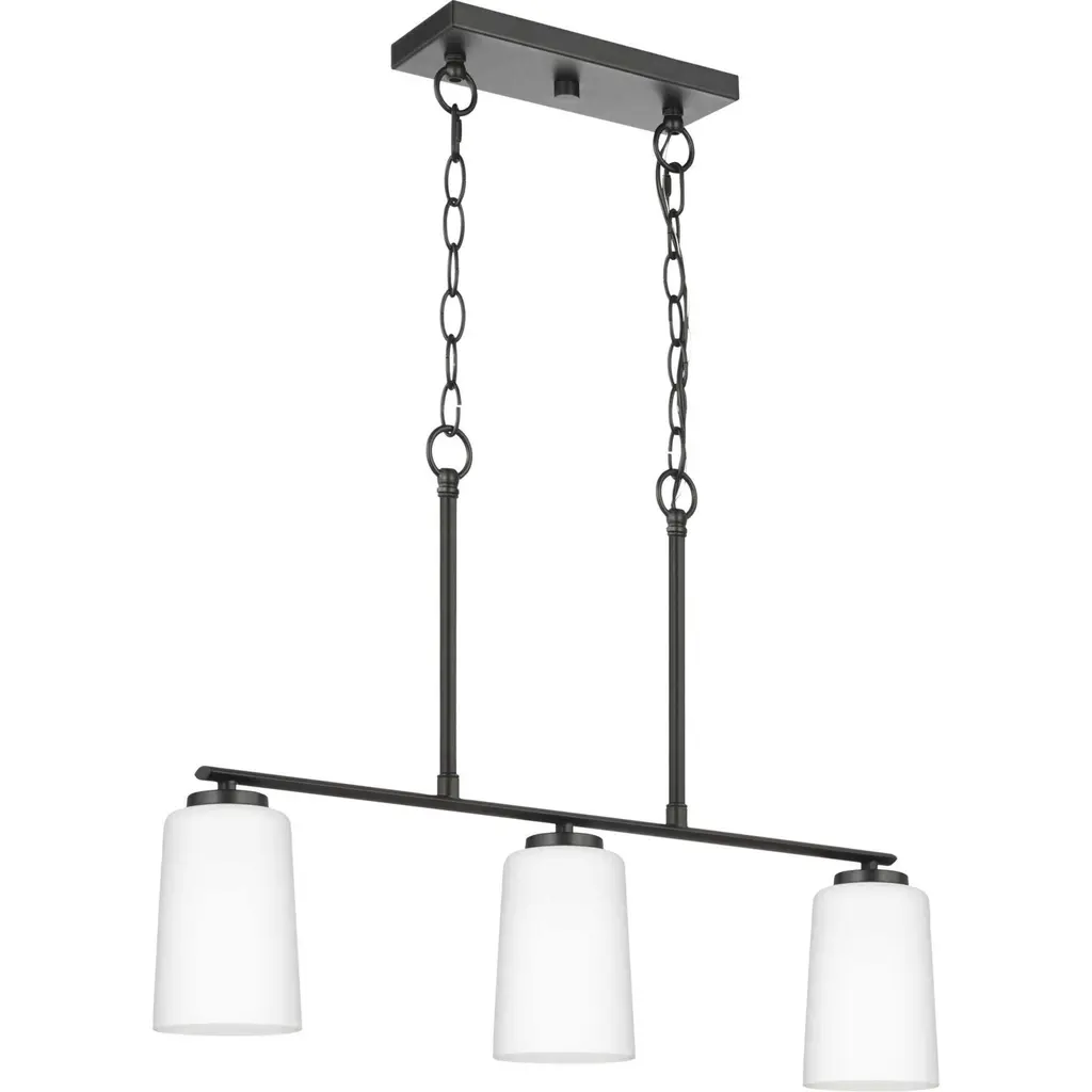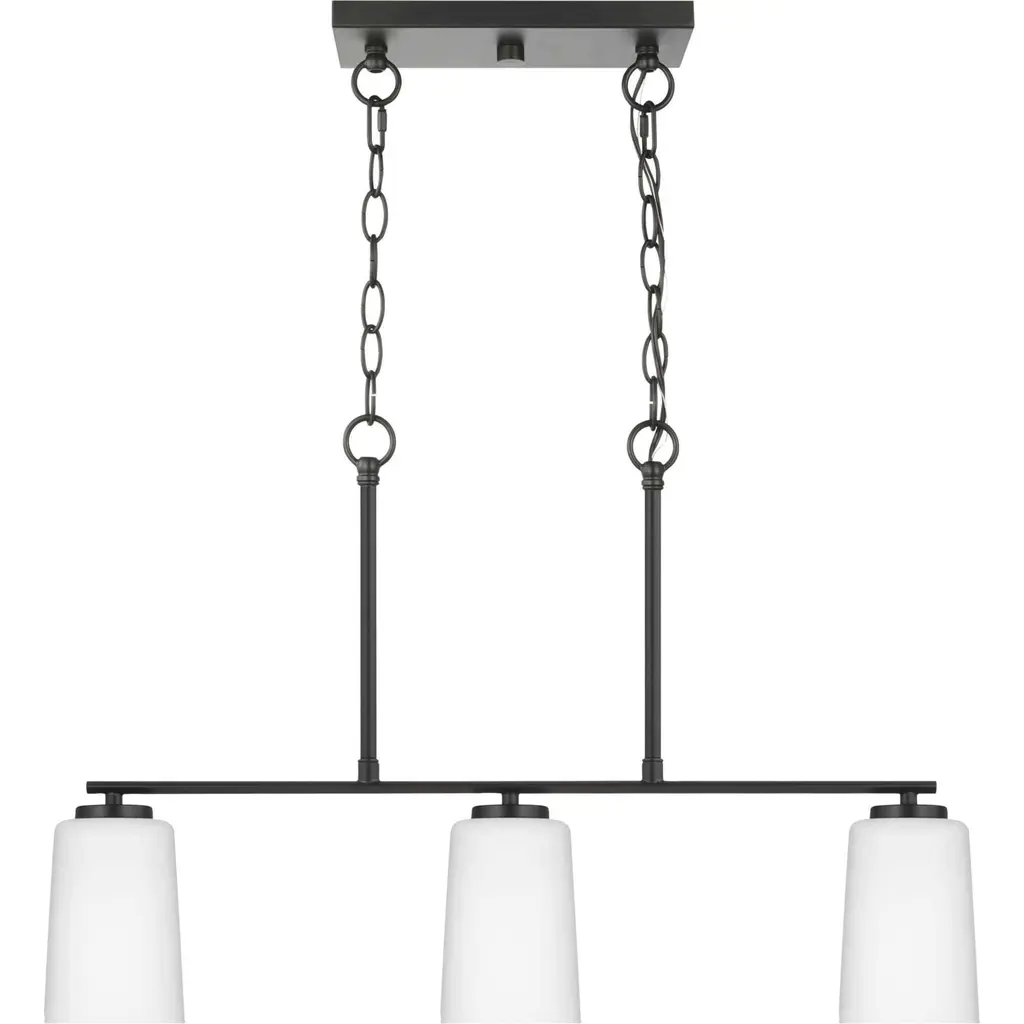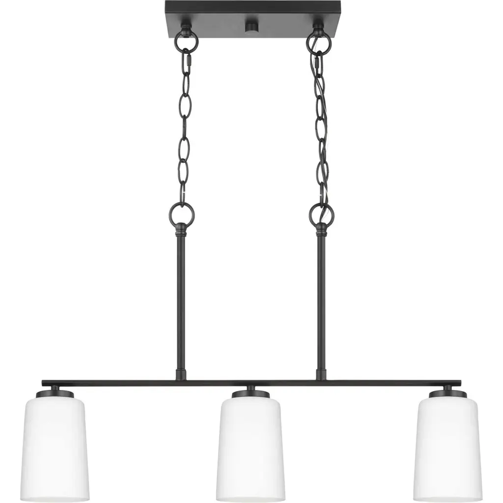Fundamentally modern but with a traditional twist, the Adley linear chandelier combines etched white glass shades with simple, straight bars finished in matte black. This light is an elegant choice for illuminating kitchen, bars and dining rooms in transitional settings and contemporary settings. The fixture has 48 in. of chain to customize it for a variety of ceiling heights and can be used on a sloped ceiling.