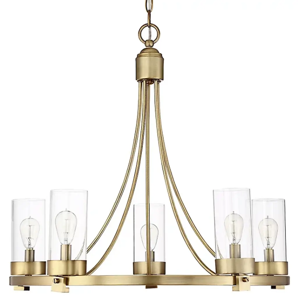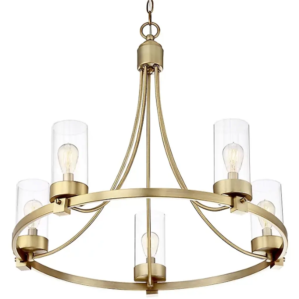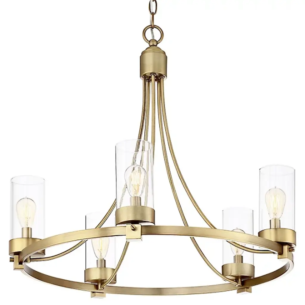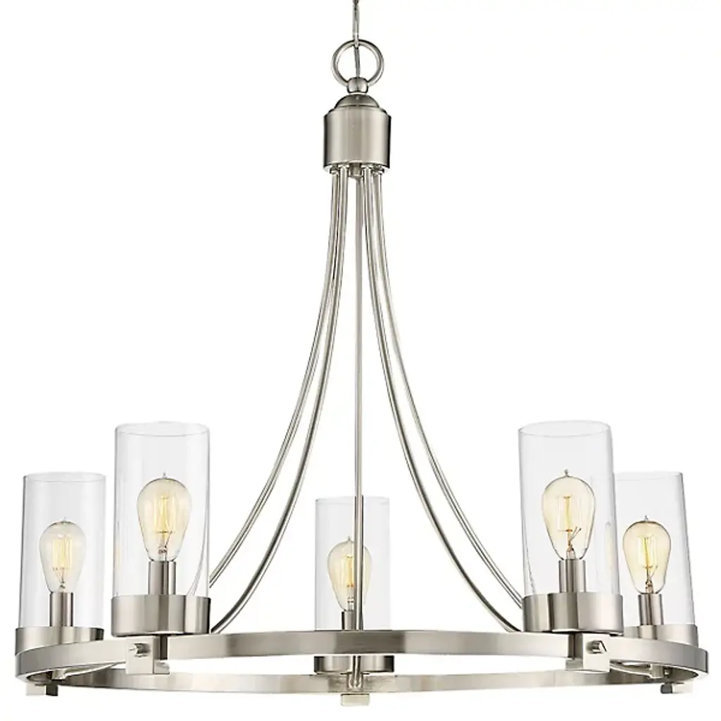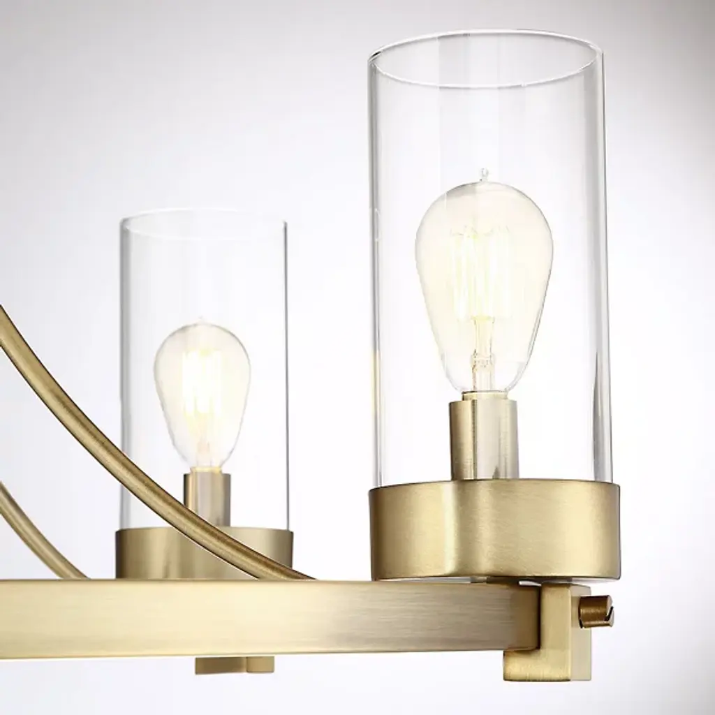 Round and radiant. The Aerin Chandelier by Alder & Ore is an effortless way to give a room an upscale update. Crafted from metal with a circular frame hosting clear glass cylindrical shades, this fixture provides a comfortable overall level of light perfect for dining rooms and conversation areas. Curved arm detail in the center of the piece add a graceful touch and the chandelier is available in multiple finish options for decorating convenience.
