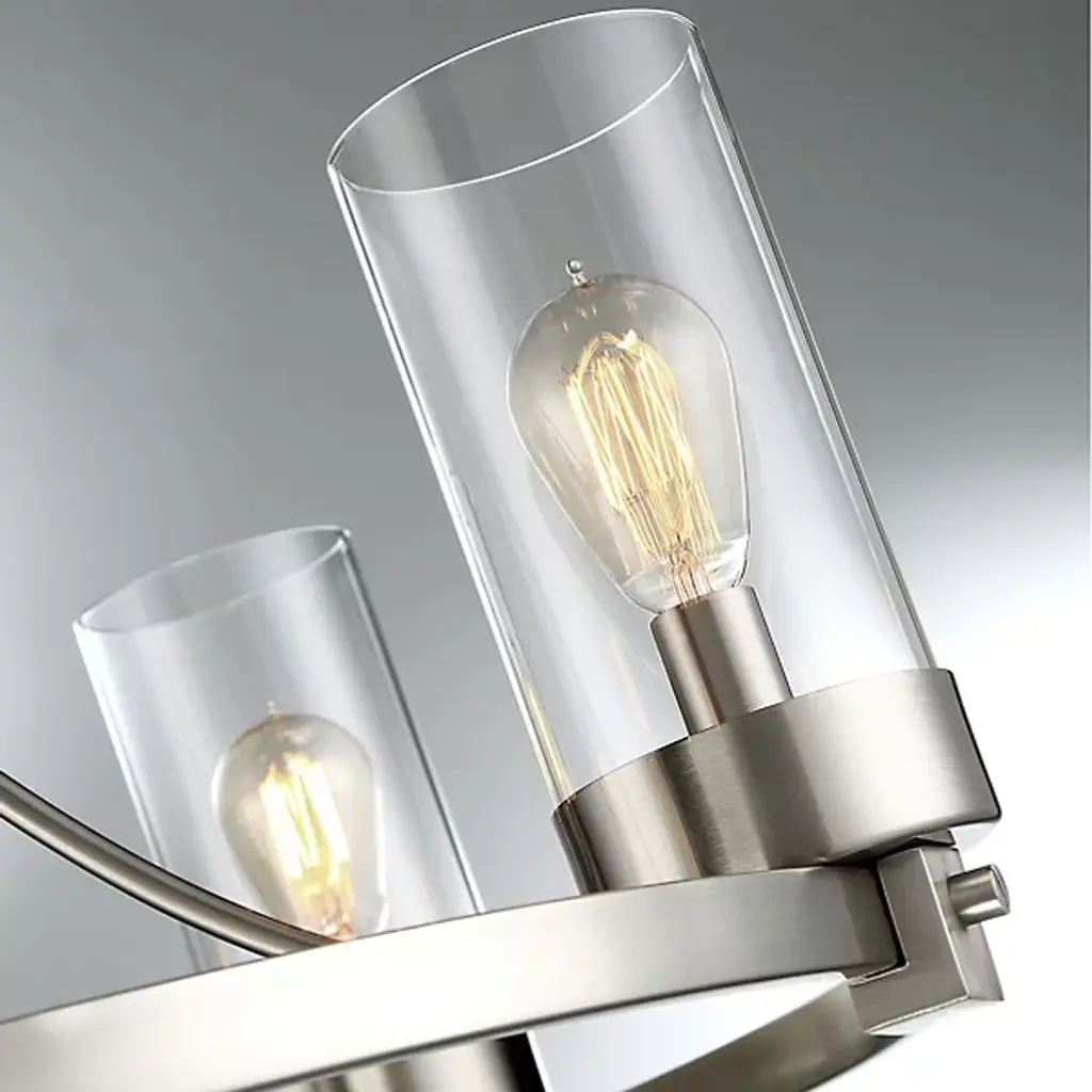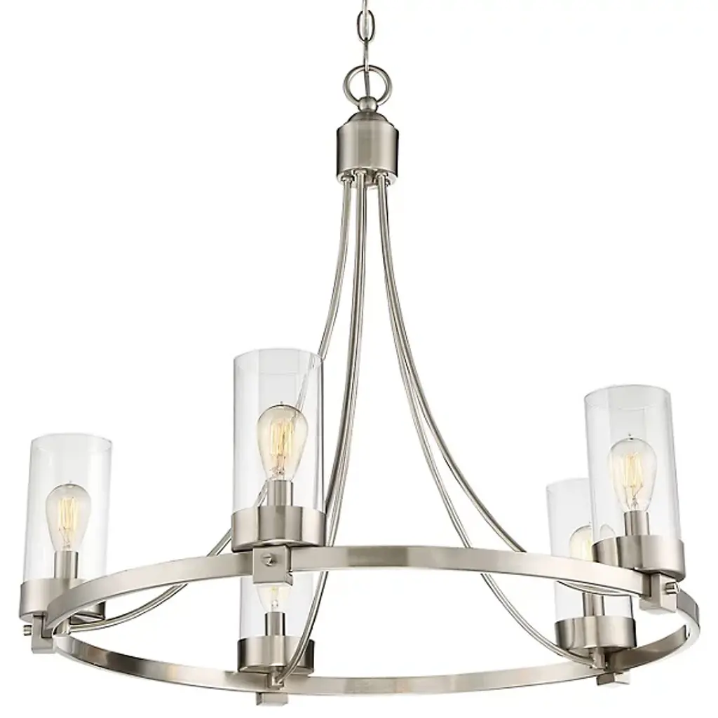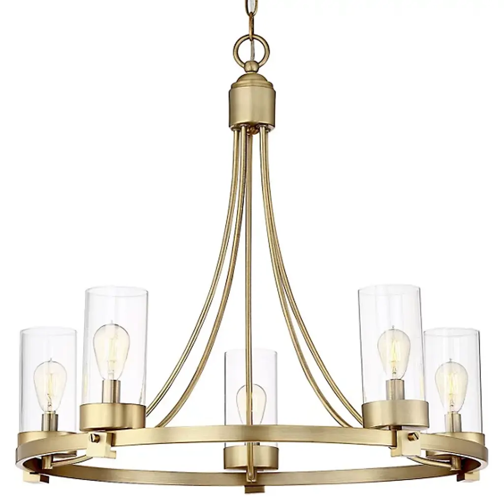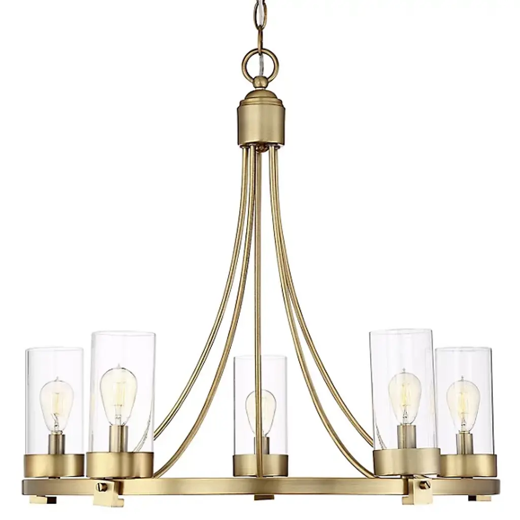 Round and radiant. The Aerin Chandelier by Alder & Ore is an effortless way to give a room an upscale update. Crafted from metal with a circular frame hosting clear glass cylindrical shades, this fixture provides a comfortable overall level of light perfect for dining rooms and conversation areas. Curved arm detail in the center of the piece add a graceful touch and the chandelier is available in multiple finish options for decorating convenience.