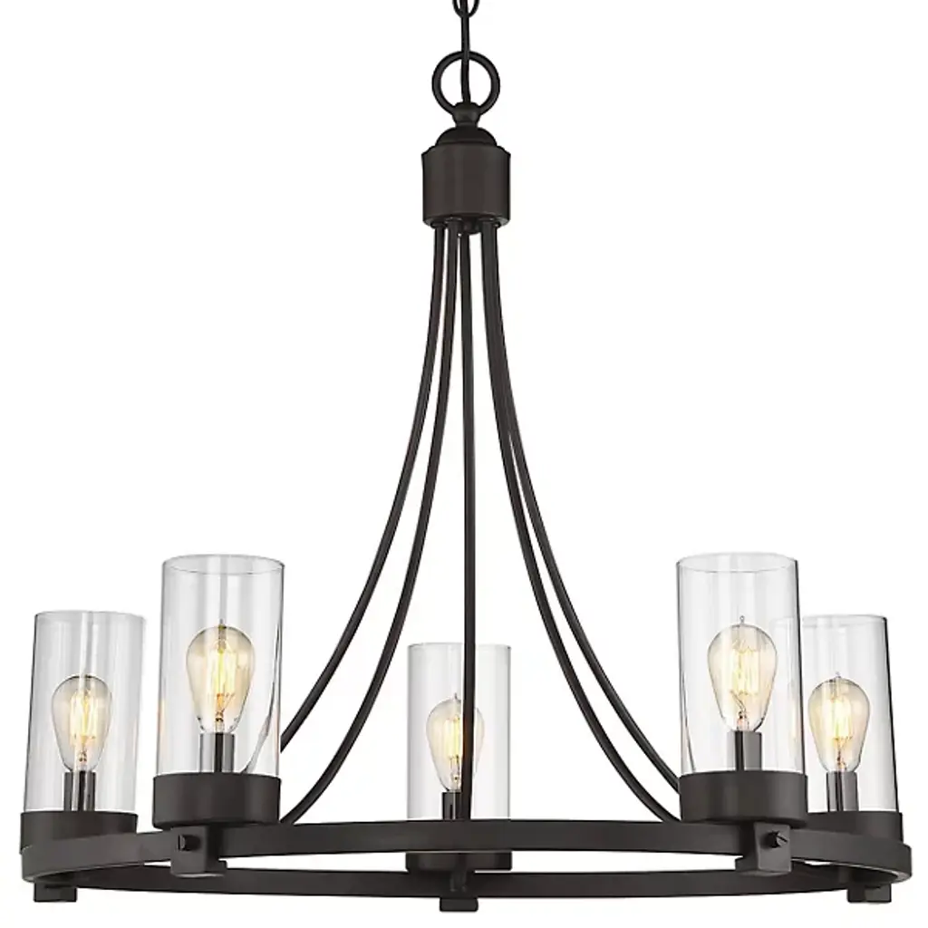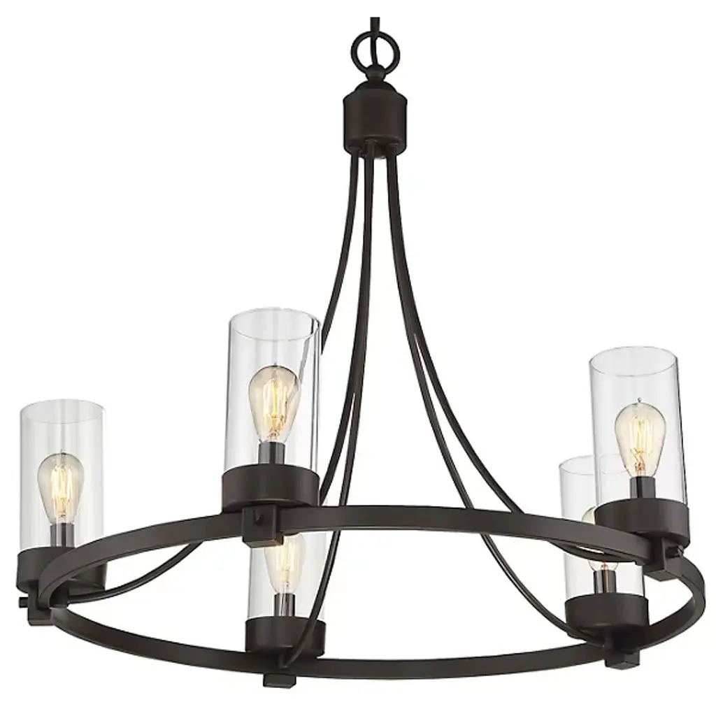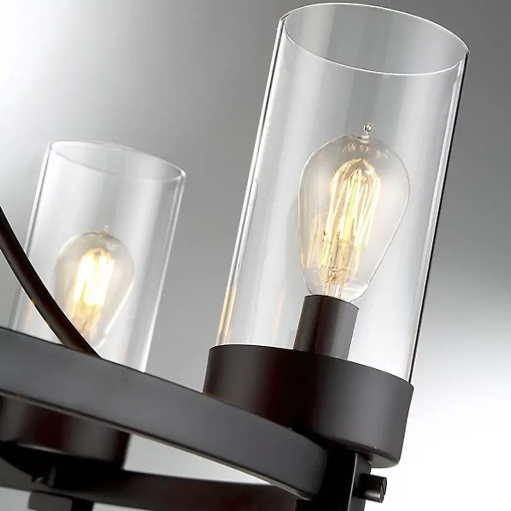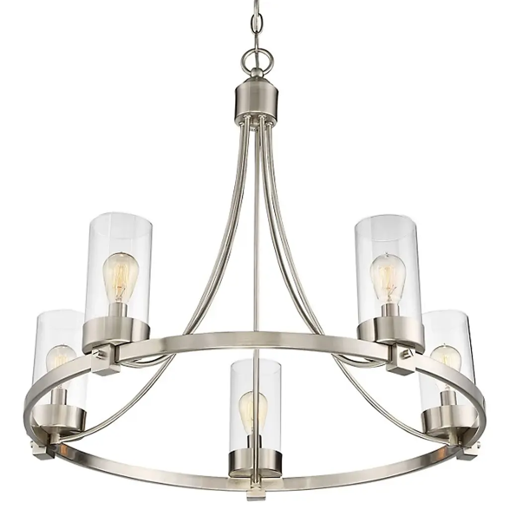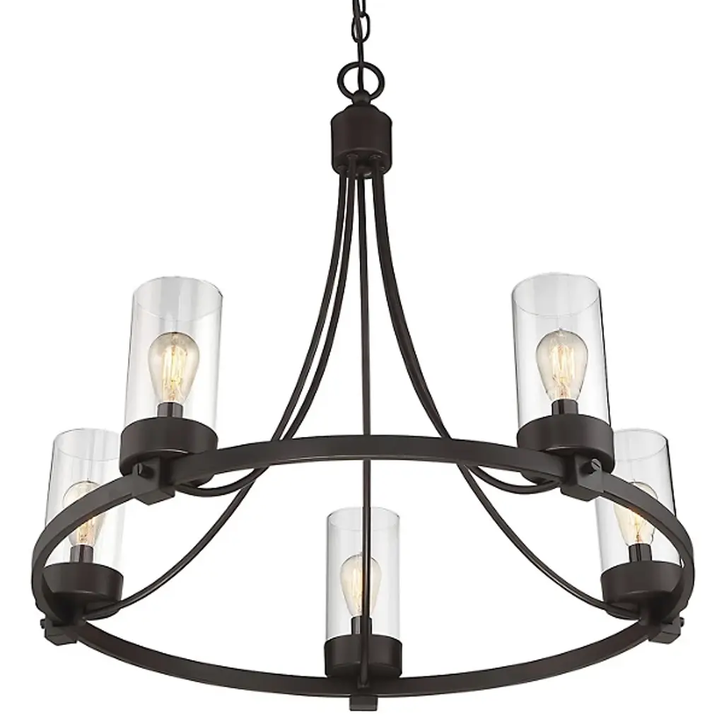 Round and radiant. The Aerin Chandelier by Alder & Ore is an effortless way to give a room an upscale update. Crafted from metal with a circular frame hosting clear glass cylindrical shades, this fixture provides a comfortable overall level of light perfect for dining rooms and conversation areas. Curved arm detail in the center of the piece add a graceful touch and the chandelier is available in multiple finish options for decorating convenience.