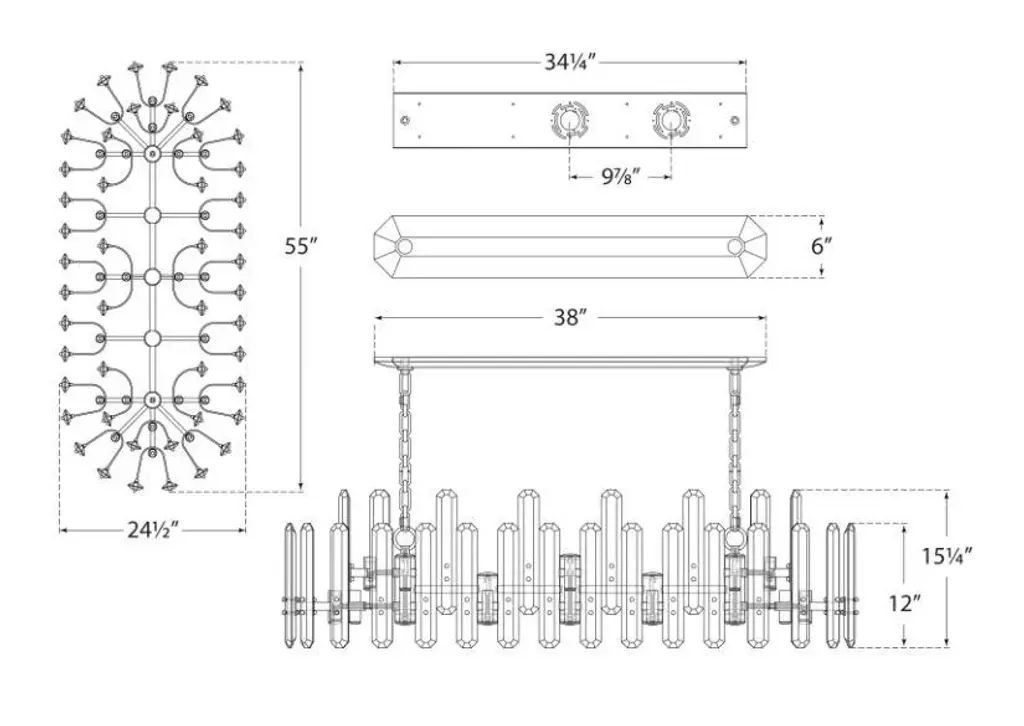 Bonnington Large Linear Chandelier in Polished Nickel with Crystal Designer: AERIN Canopy: 6" x 38" Oval Mounting: Chain Shade Detail: Crystal Socket: 24 - E12 Candelabra Wattage: 24 - 25 B11 Safety Rating Location: DAMP Note: Requires Special Assembly and Installation