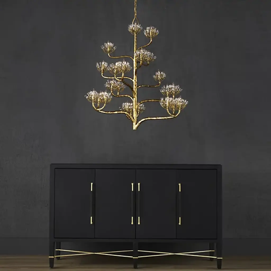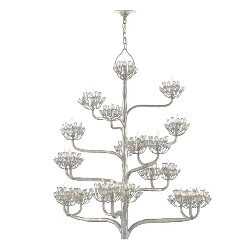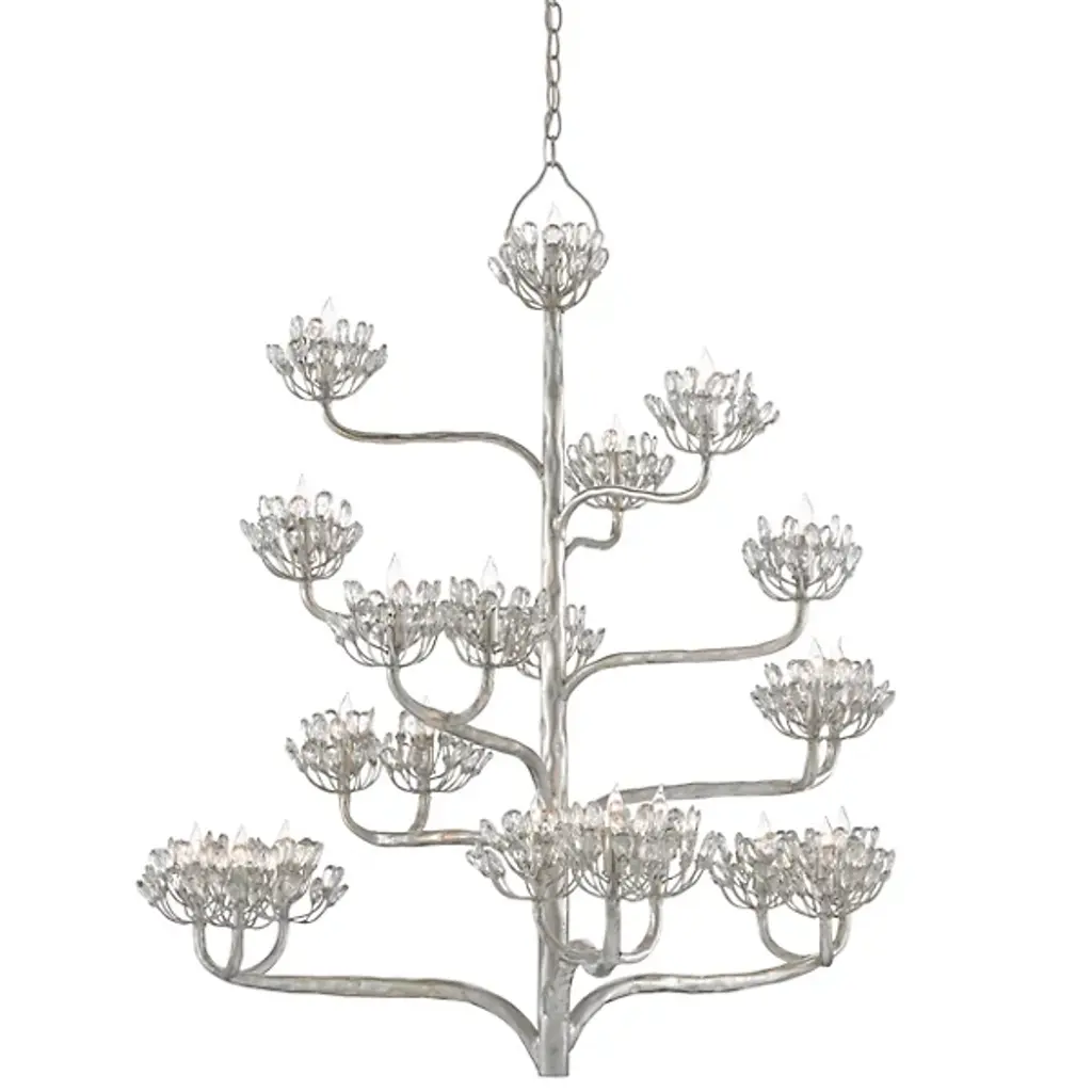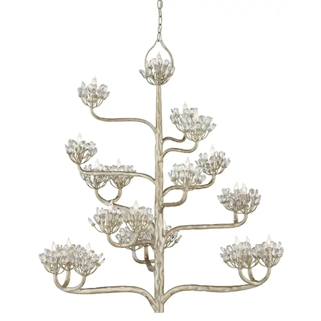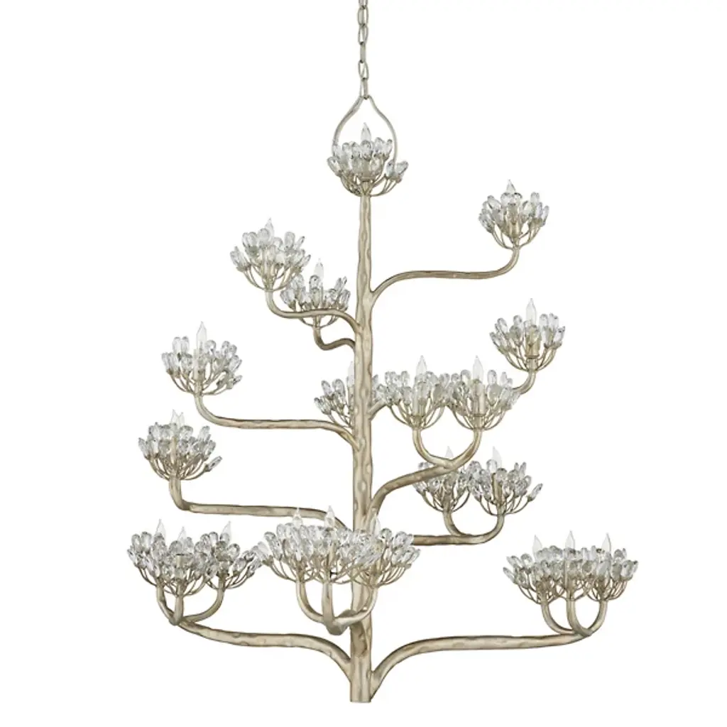Inspiring in the open air like the agave plant towering over the arid landscape. The Agave Americana Chandelier from Currey & Company is a handcrafted piece floating overhead with flowers of shimmering crystal glass. The chandelier adds a sculptural presence to the space. It descends into the room with chain-link and a hand-forged metal structure. This structure breaks up the home’s strict architectural lines through its flowing, branching contours. The texture branches produce clear crystal bunches that evoke an agave flower. Bulbs inside produce festive highlights on the raised metal and the reflective crystal. This grand display translates to a grand aura of warmth. • S/F • Metal structure is hand-forged • Clear crystals clusters are handcrafted and hand-composed • Sculptural organic design takes inspiration from the American Agave desert plant