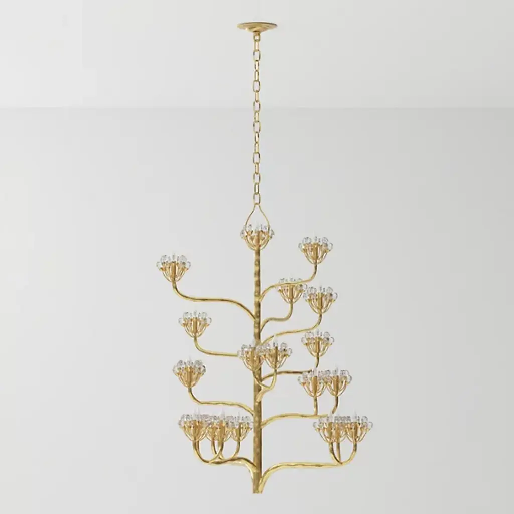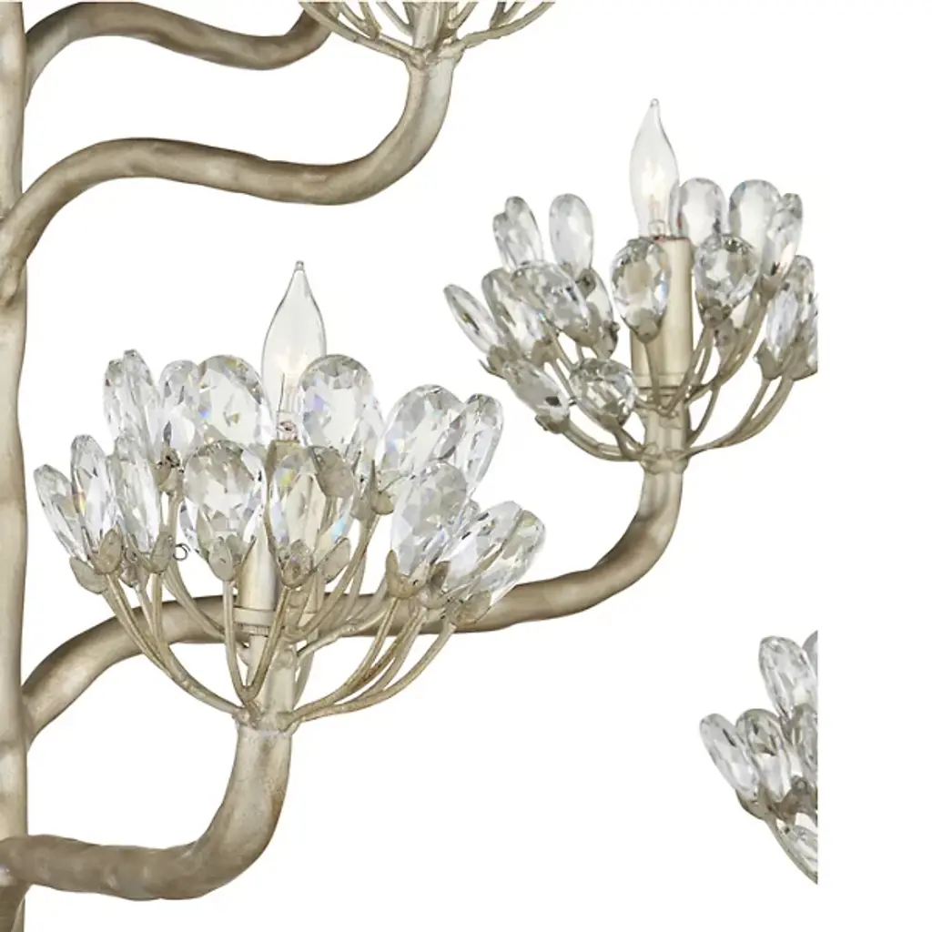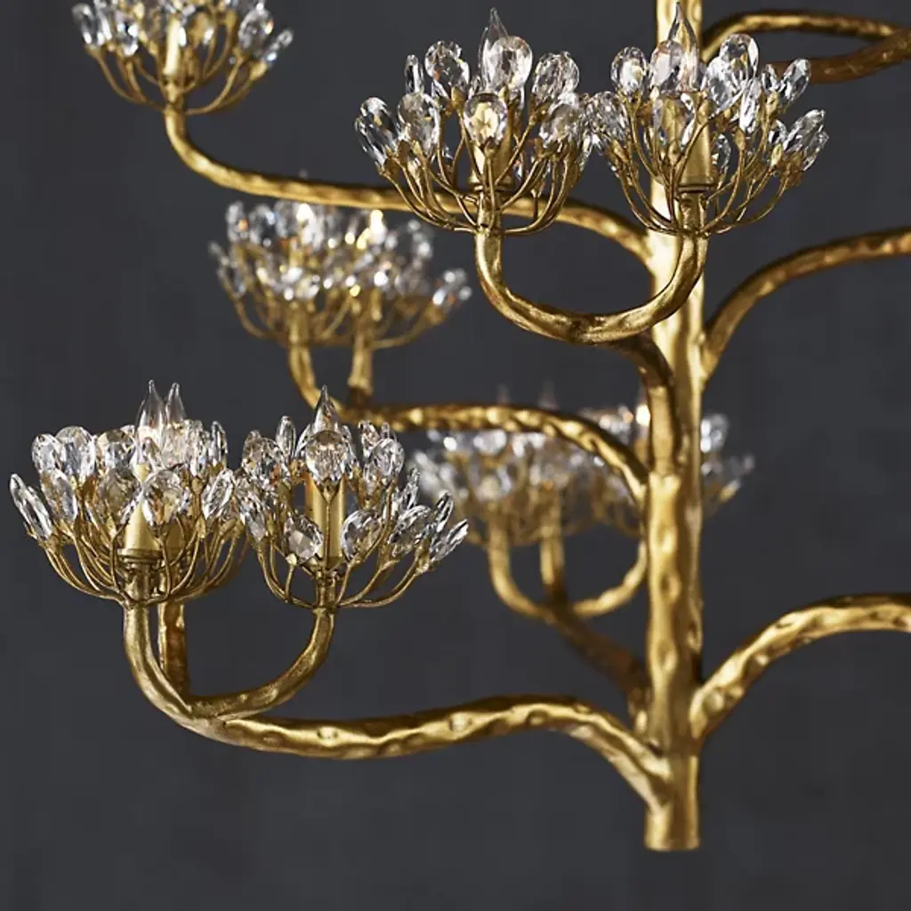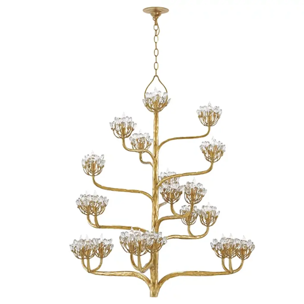 Inspiring in the open air like the agave plant towering over the arid landscape. The Agave Americana Chandelier from Currey & Company is a handcrafted piece floating overhead with flowers of shimmering crystal glass. The chandelier adds a sculptural presence to the space. It descends into the room with chain-link and a hand-forged metal structure. This structure breaks up the home’s strict architectural lines through its flowing, branching contours. The texture branches produce clear crystal bunches that evoke an agave flower. Bulbs inside produce festive highlights on the raised metal and the reflective crystal. This grand display translates to a grand aura of warmth. • S/F • Metal structure is hand-forged • Clear crystals clusters are handcrafted and hand-composed • Sculptural organic design takes inspiration from the American Agave desert plant