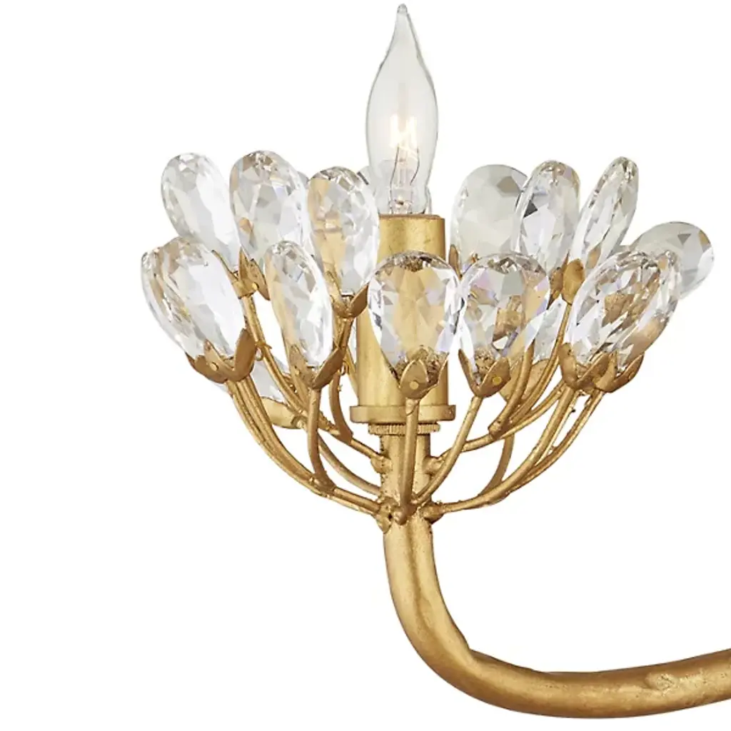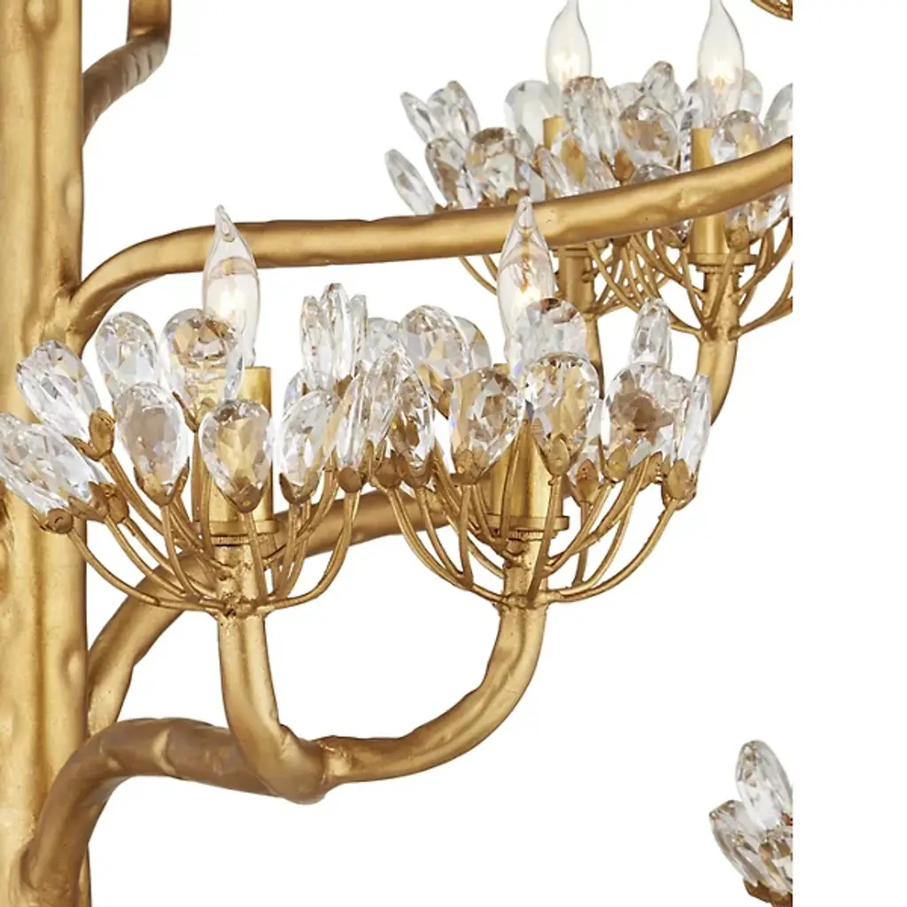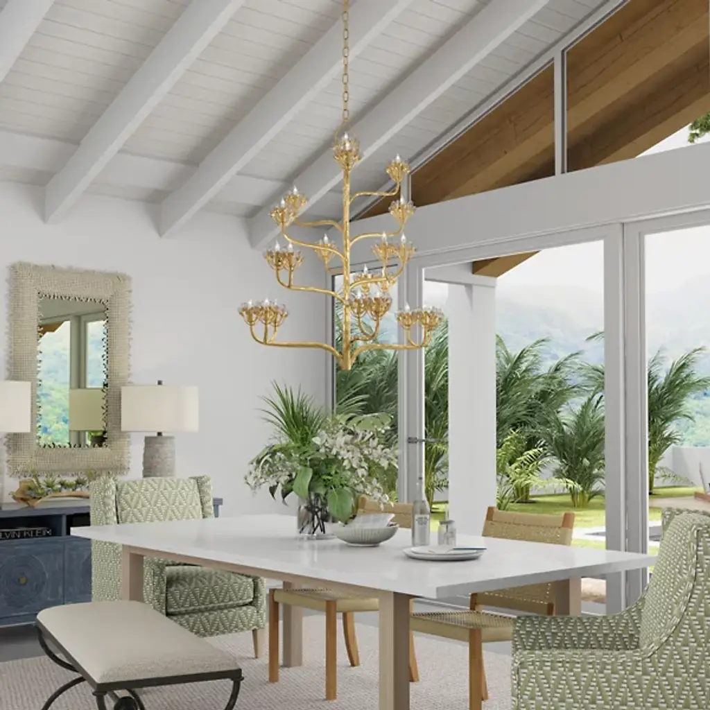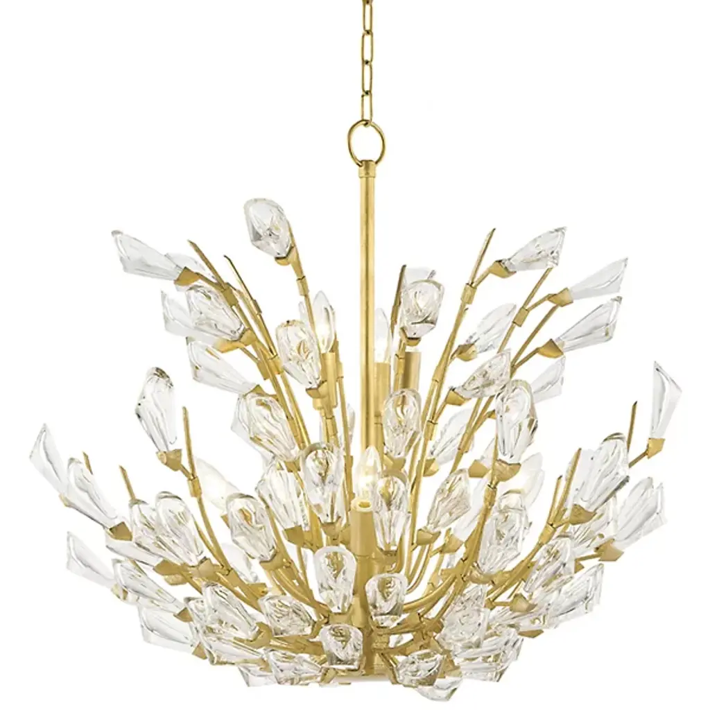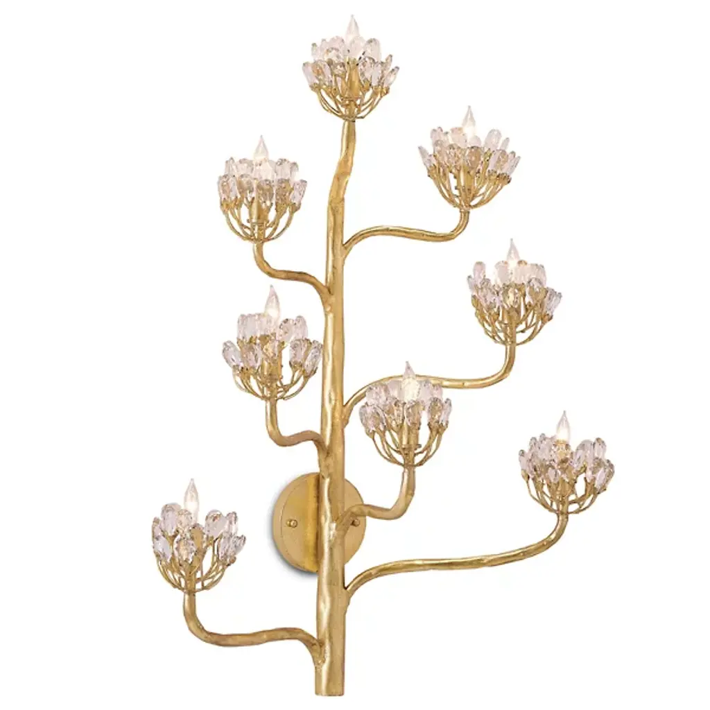 Inspiring in the open air like the agave plant towering over the arid landscape. The Agave Americana Chandelier from Currey & Company is a handcrafted piece floating overhead with flowers of shimmering crystal glass. The chandelier adds a sculptural presence to the space. It descends into the room with chain-link and a hand-forged metal structure. This structure breaks up the home’s strict architectural lines through its flowing, branching contours. The texture branches produce clear crystal bunches that evoke an agave flower. Bulbs inside produce festive highlights on the raised metal and the reflective crystal. This grand display translates to a grand aura of warmth. • S/F • Metal structure is hand-forged • Clear crystals clusters are handcrafted and hand-composed • Sculptural organic design takes inspiration from the American Agave desert plant